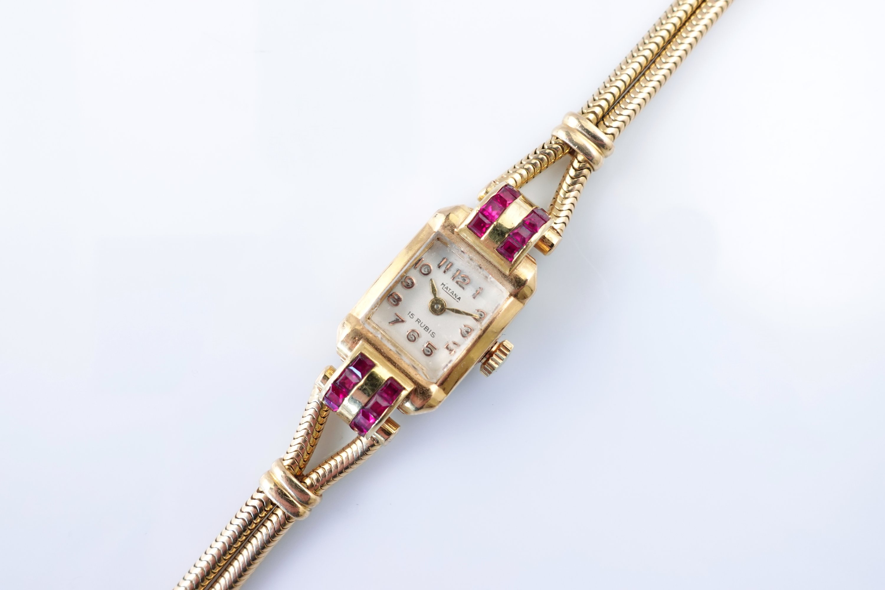 en or jaune 750 millièmes, les cornes ornées de rubis en taille carrée, cadran émaillé blanc signé "Matana 15 rubis" indiquant les heures en chiffres arabes. Bracelet en or à mailles serpent, boucle double déployante et chaînette de sécurité. Mouvement mécanique à remontage manuel.