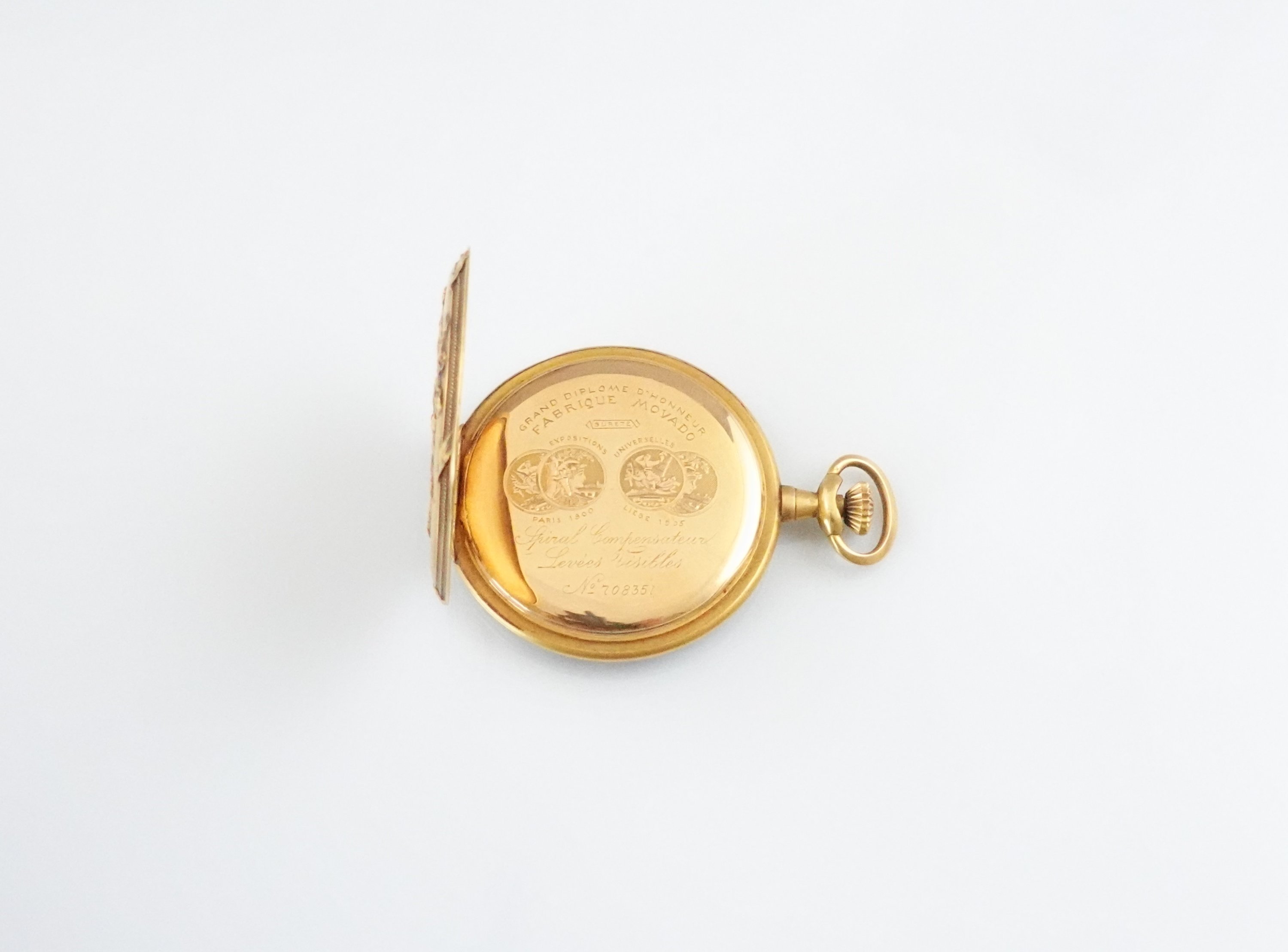 en or jaune 750 millièmes. Cadran signé "Movado sureté" indiquant les heures en chiffres arabes. Petite trotteuse à 6 heures. Le cache poussière intérieur en or jaune 750 millièmes marqué "Grand diplome d'honneur / fabrique Movado / Expositions universelles Paris 1900 Liège 1905". Numérotée 708351".