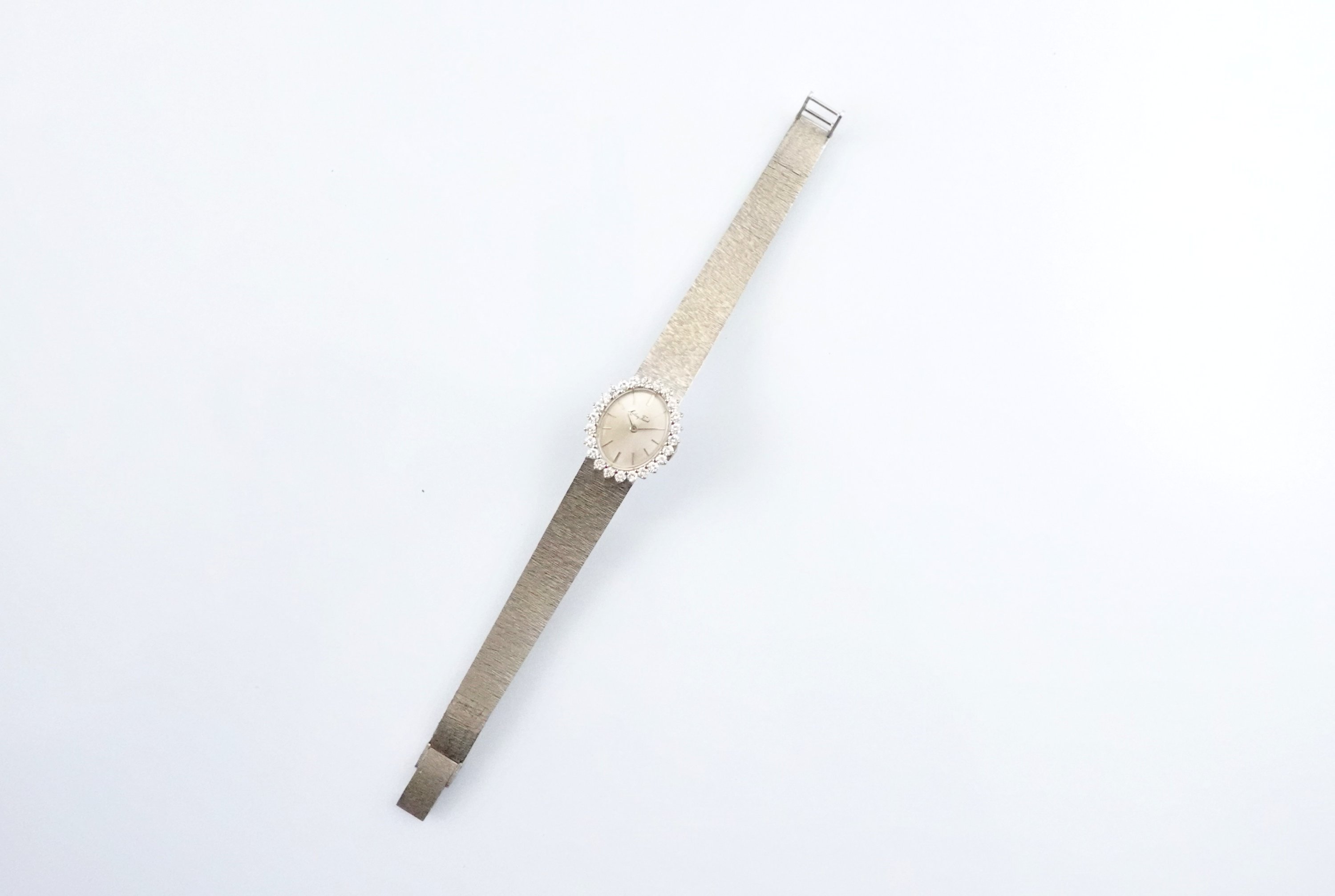 en or gris 750 millièmes, la lunette ornée de 27 diamants de taille brillant. Le cadran de forme ovale, signé, indique les heures par des bâtonnets.