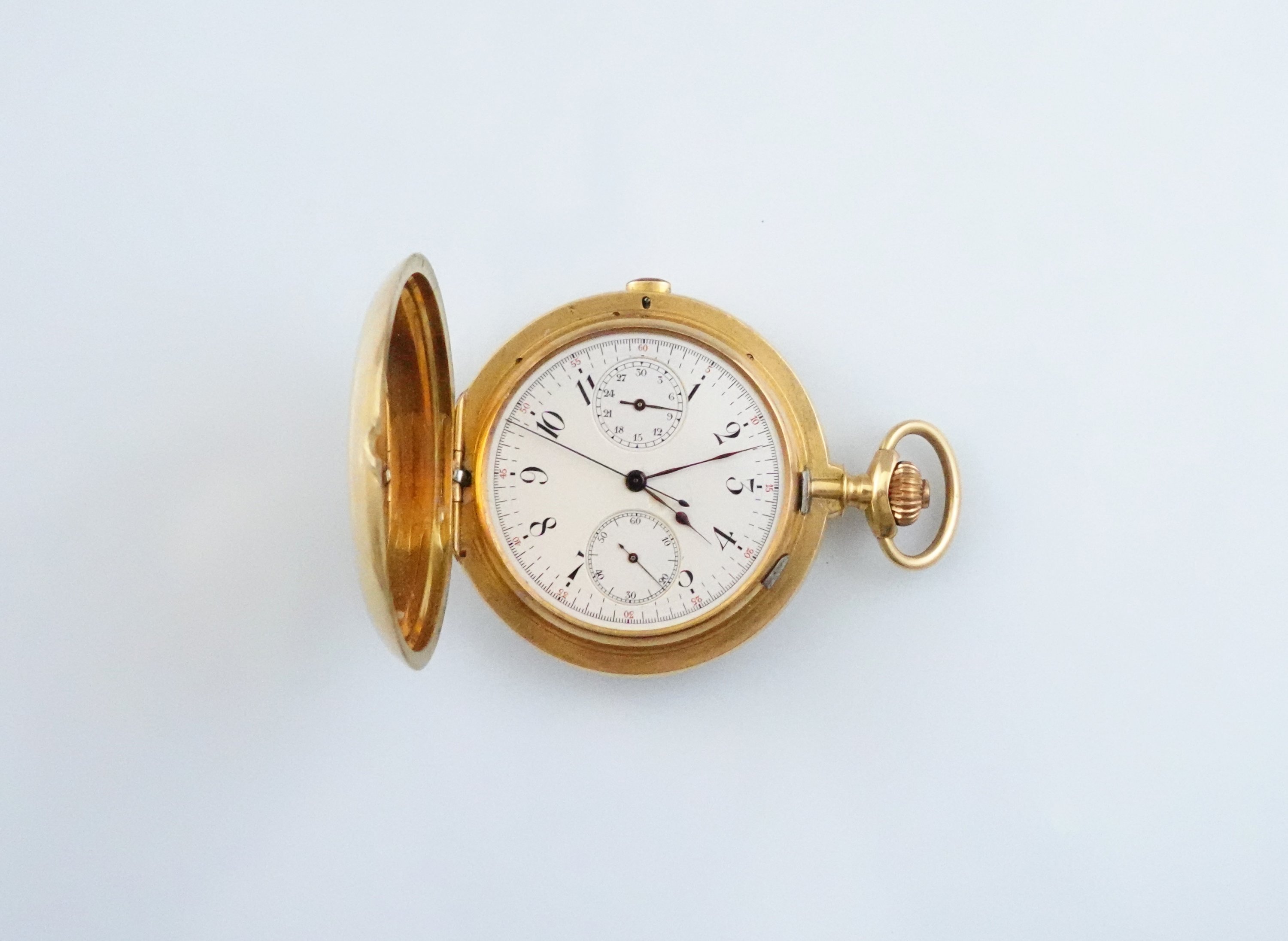 en or jaune 750 millièmes. Trois cadrans émaillés (petit accident, manque le verre). Remontoir à trois heures, bouton du chronomètre à midi. Boîtier, cache-poussière en or et mécanisme numérotés 64109.