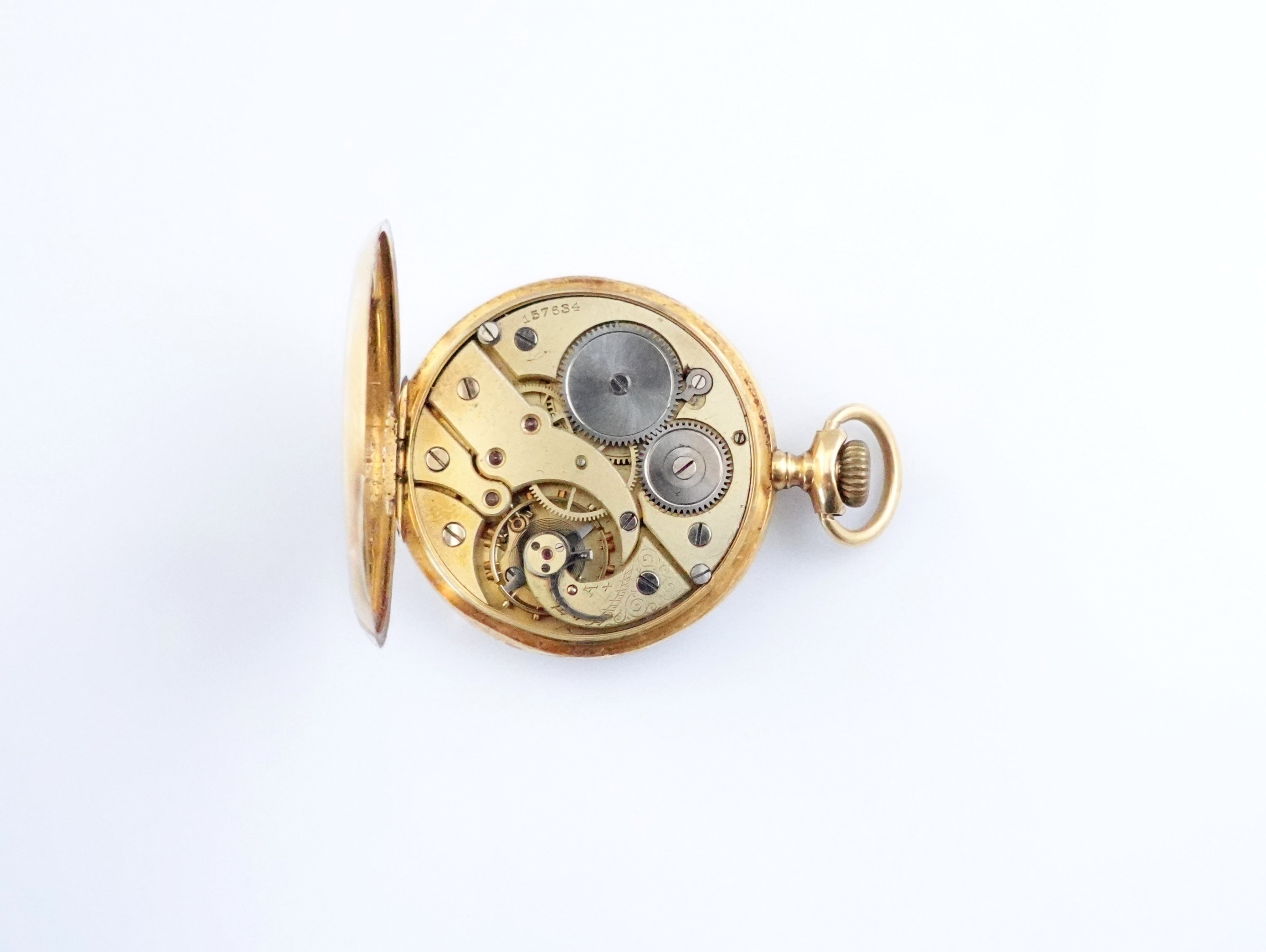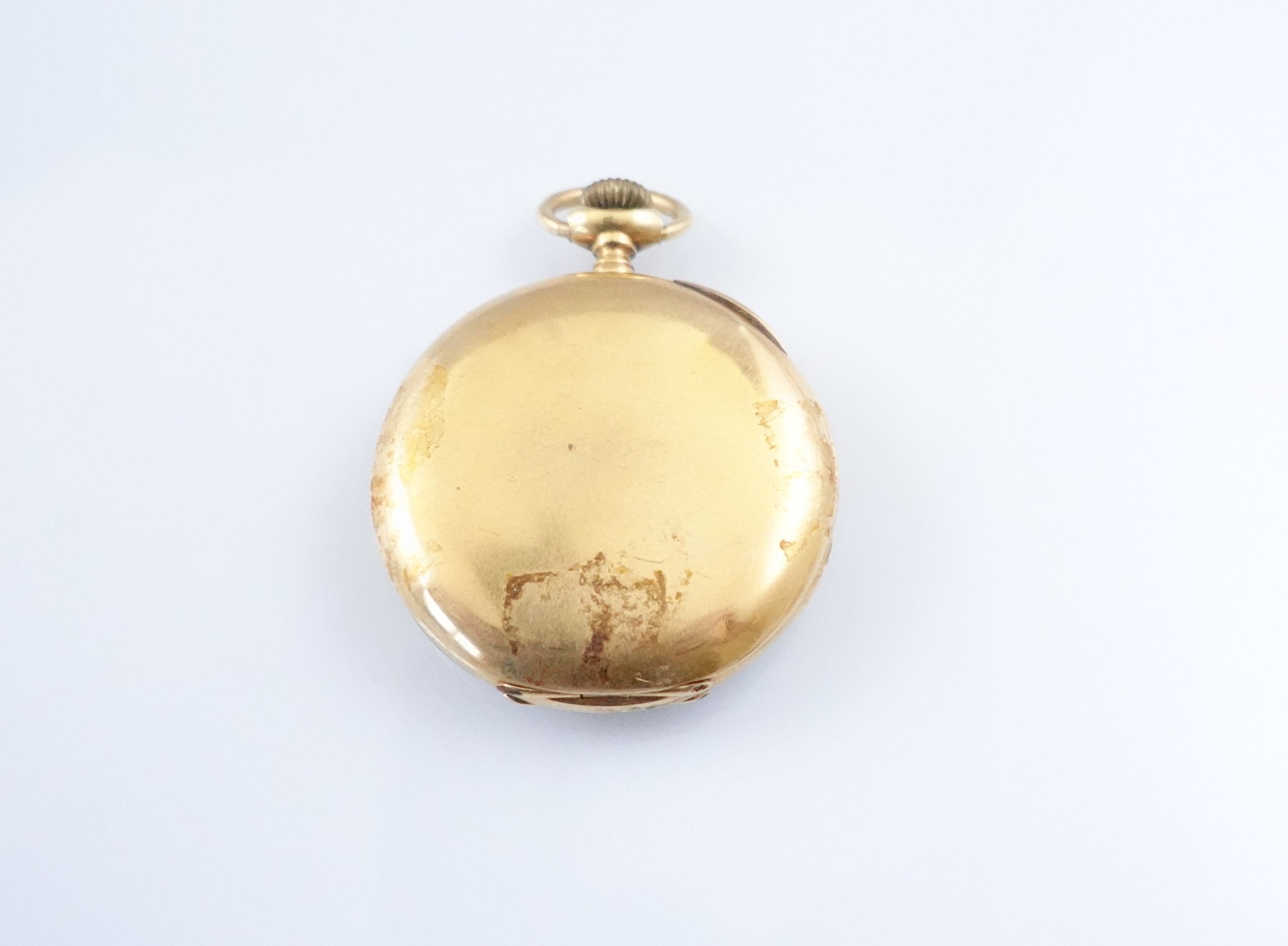 en or jaune 750 millièmes, à cadran émaillé blanc indiquant les heures par chiffres romains, les minutes par un chemin de fer. Sans cache-poussière intérieur. Numérotée "104103".