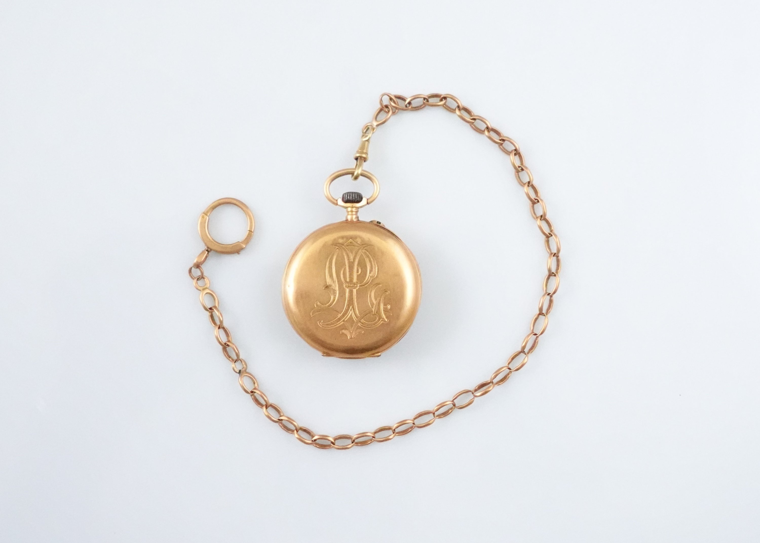 en or jaune 750 millièmes. Cadran émaillé blanc avec les heures en chiffres romains. Petite trotteuse à 6 heures. Remontoir à midi. Le cache-poussière en or signé "Leroux au Mans".
