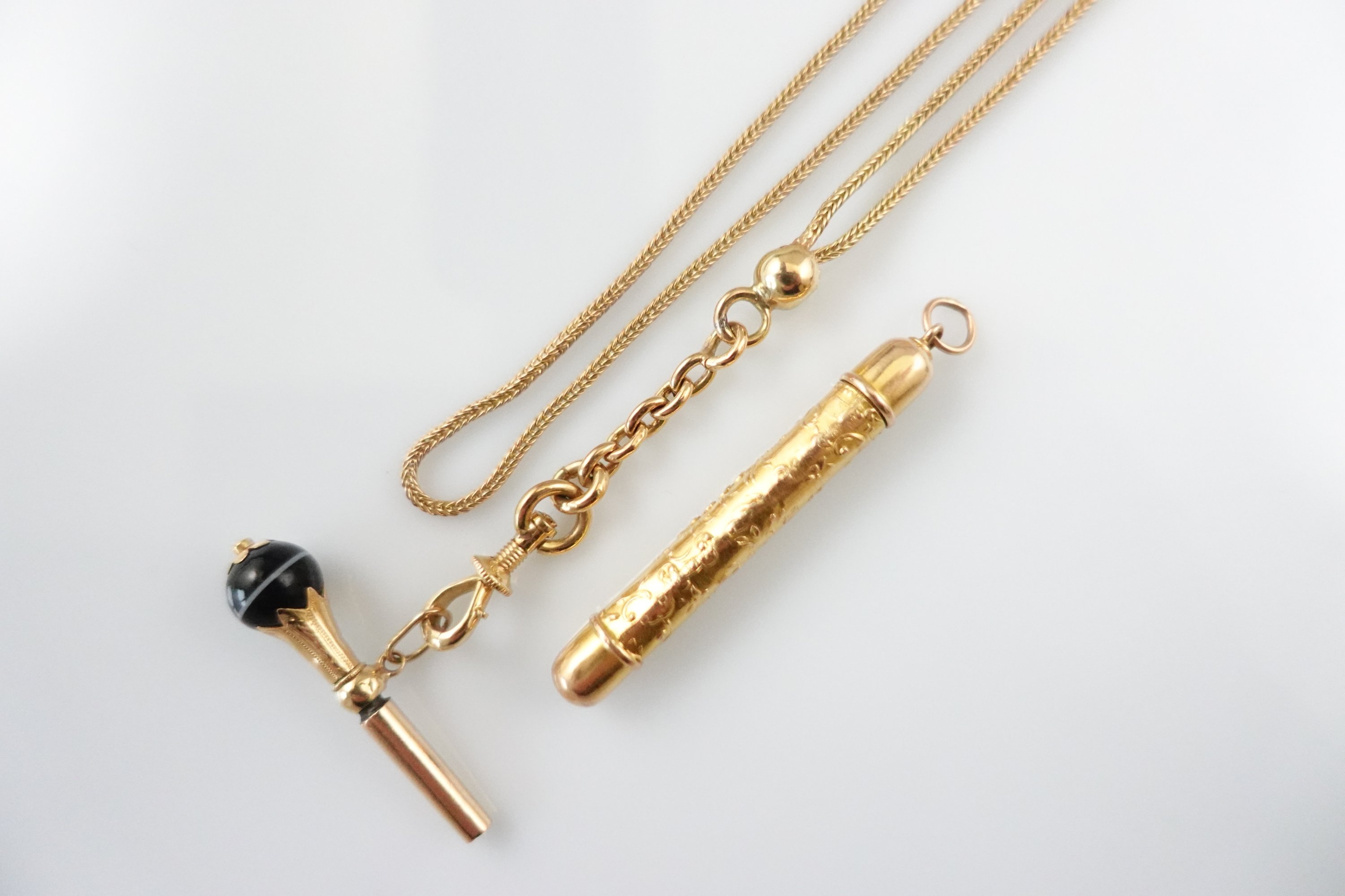 Joint : un porte-mine en or jaune 750 millièmes à décor d'un cartouche en agrafe dans un entourage végétal. Poids brut : 5 g.