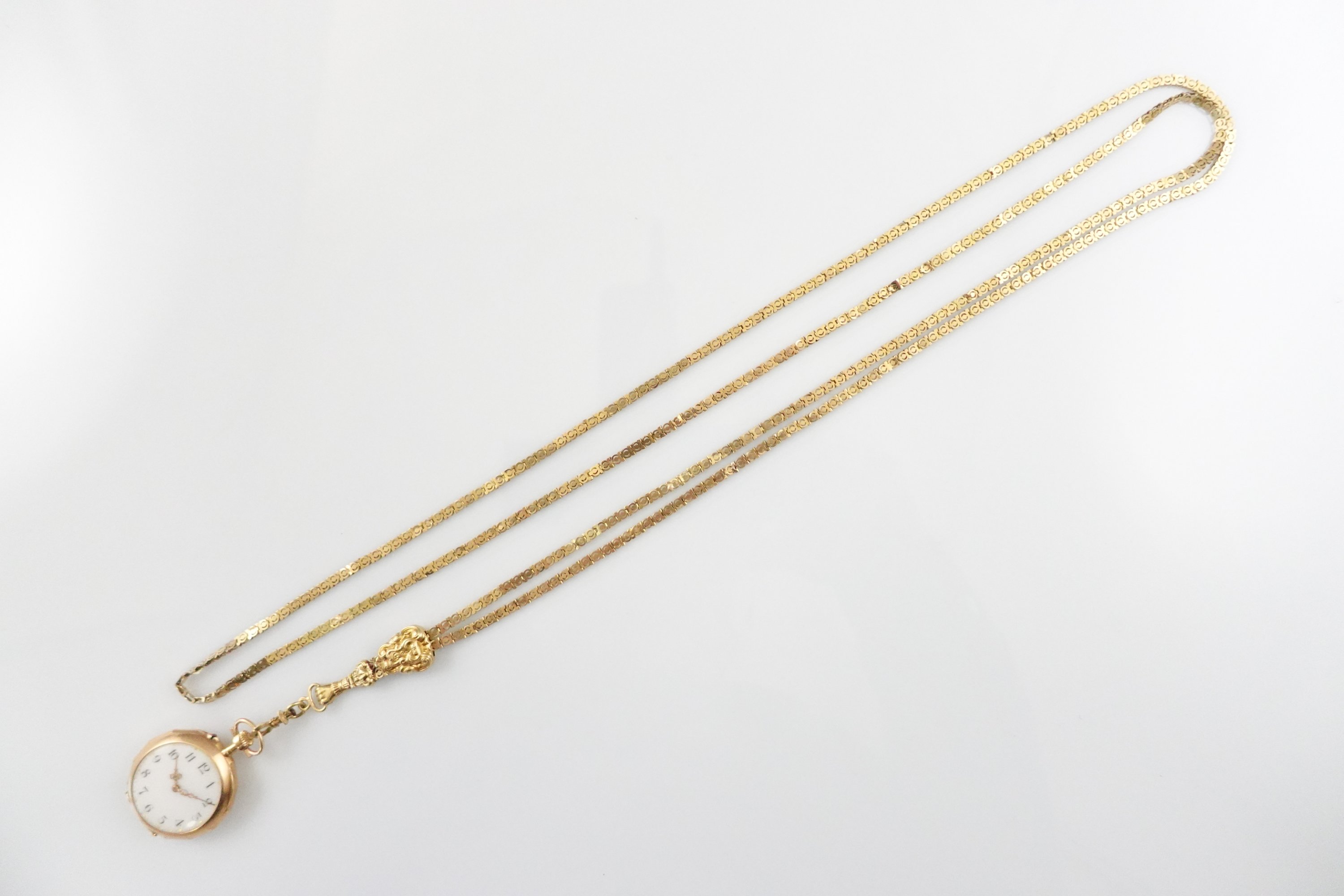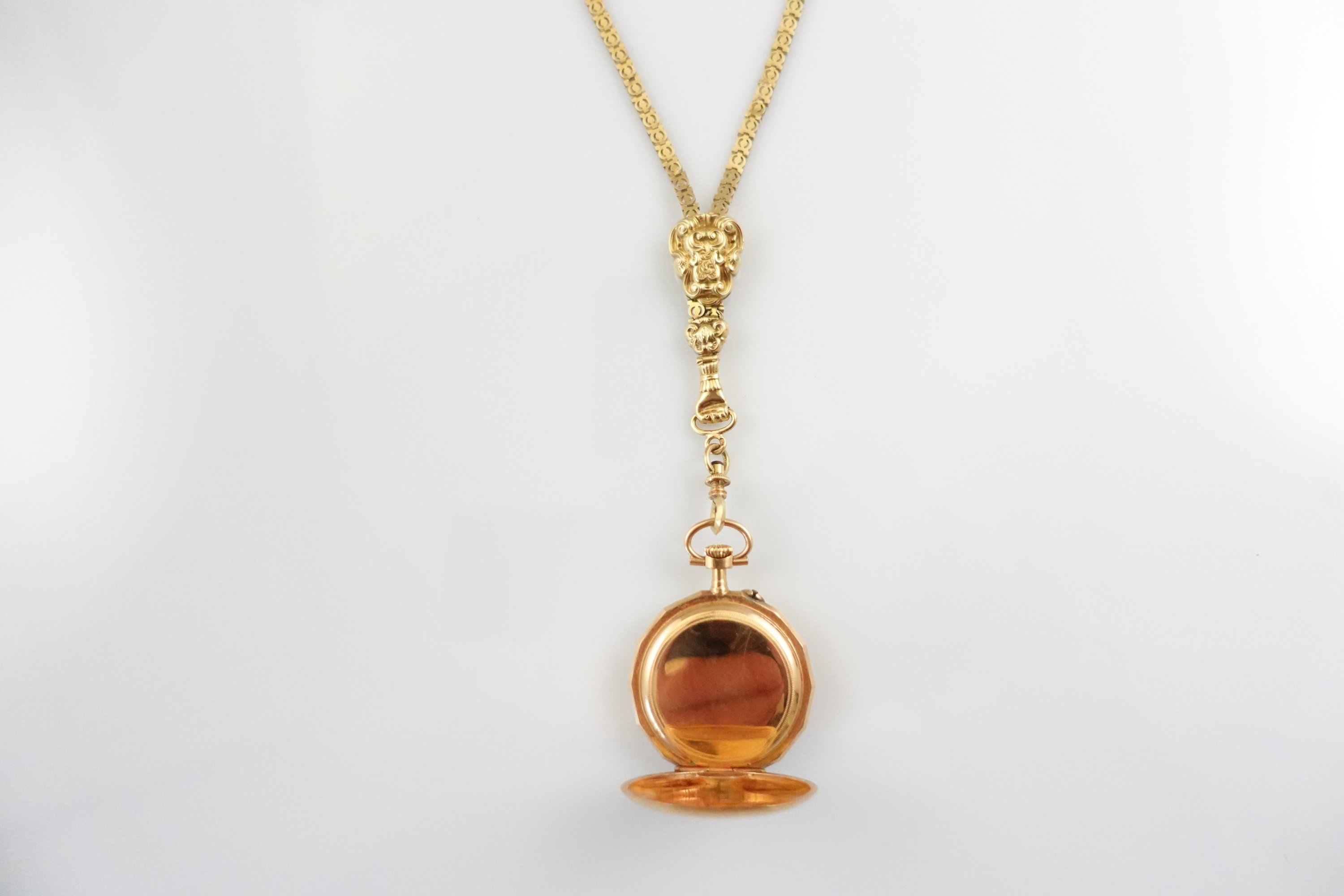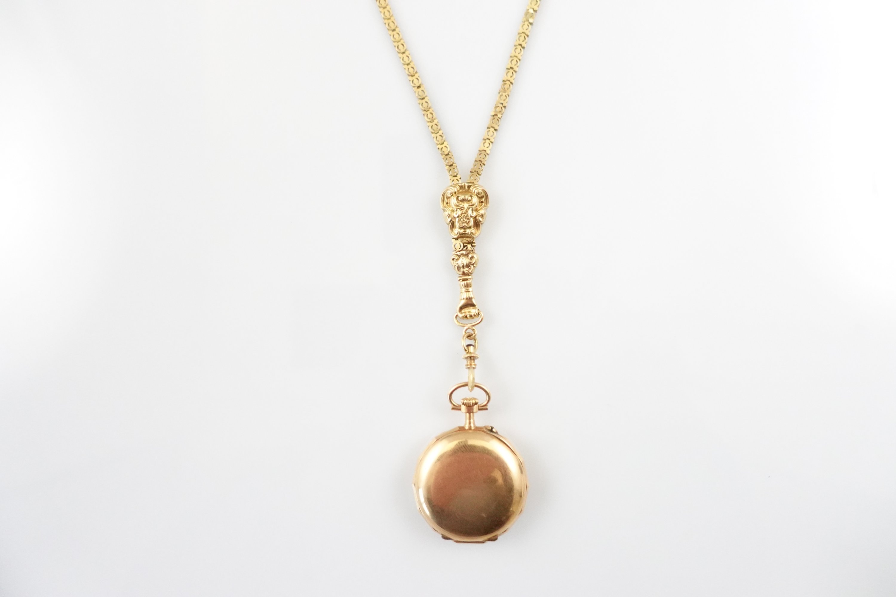 - La montre à boîtier facetté présente un cadran émaillé avec les heures en chiffres arabes. Remontoir à midi. Cache-poussière intérieur en or. Numérotée "22240". Diam. 30 mm.