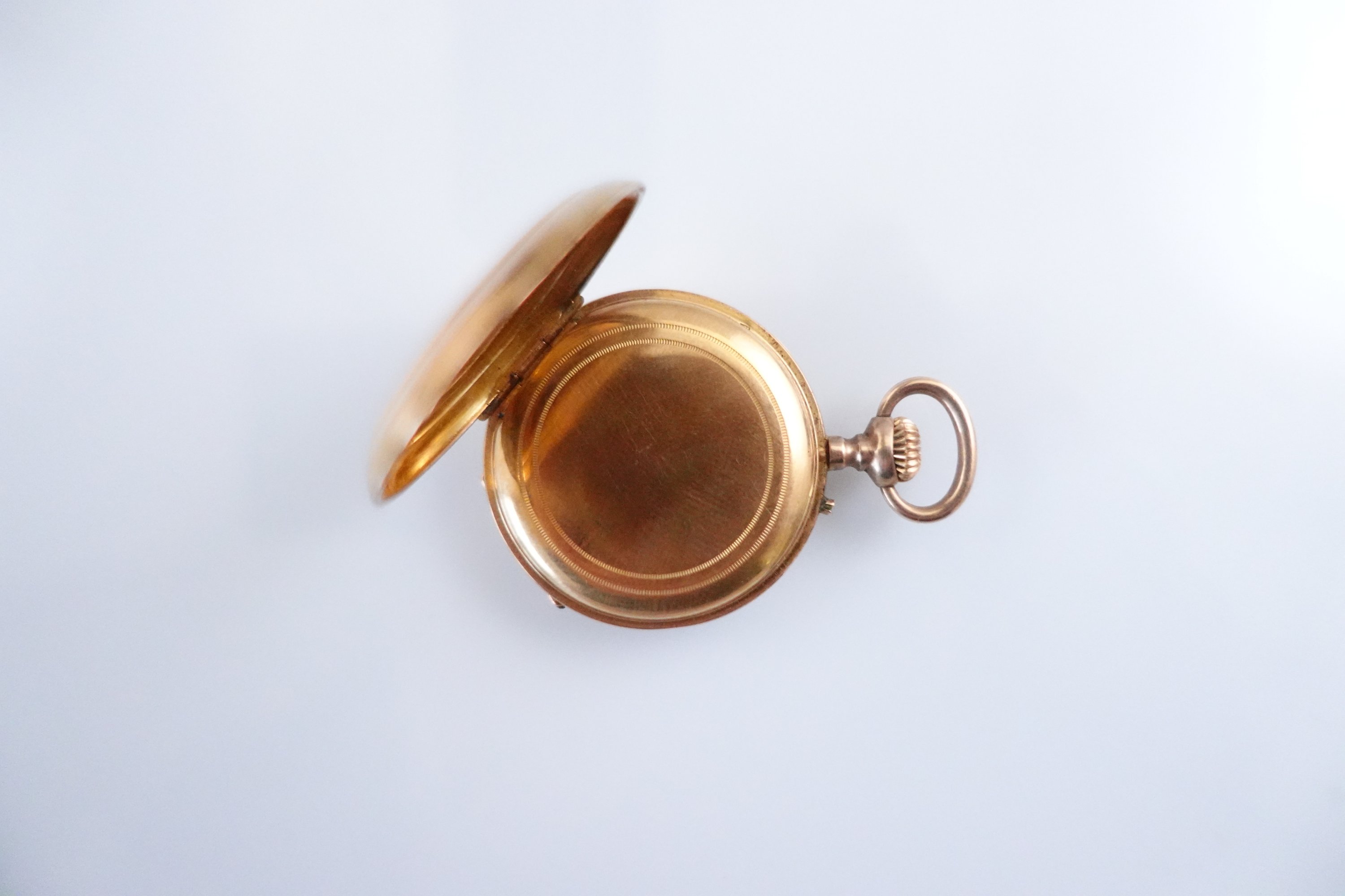 en or jaune 750 millièmes, cadran émaillé blanc indiquant les heures en chiffres romains et les minutes en chiffres arabes. Le revers rehaussé d'émail et gravé de rinceaux entourant un médaillon au panier de fleurs. Le cache-poussière intérieur en or. Numérotée "31915".