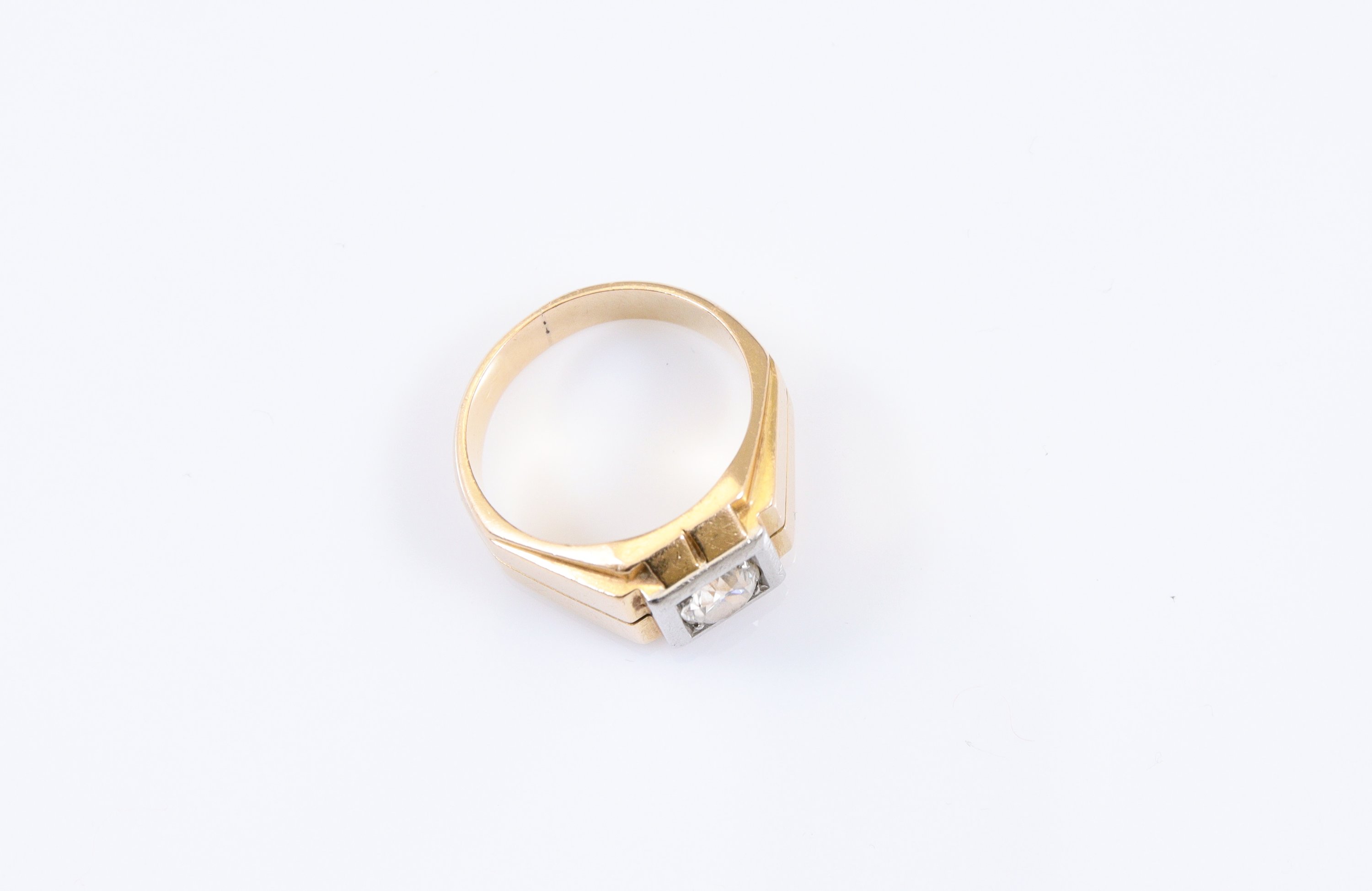 en or jaune 750 millièmes et platine au chaton de forme géométrique orné d'un diamant de taille ancienne d'environ 0,7 ct.