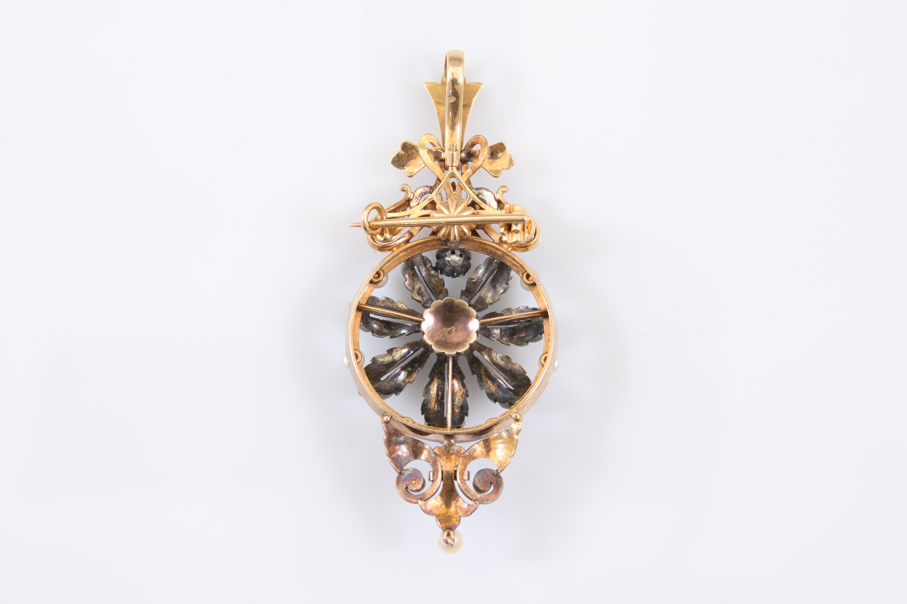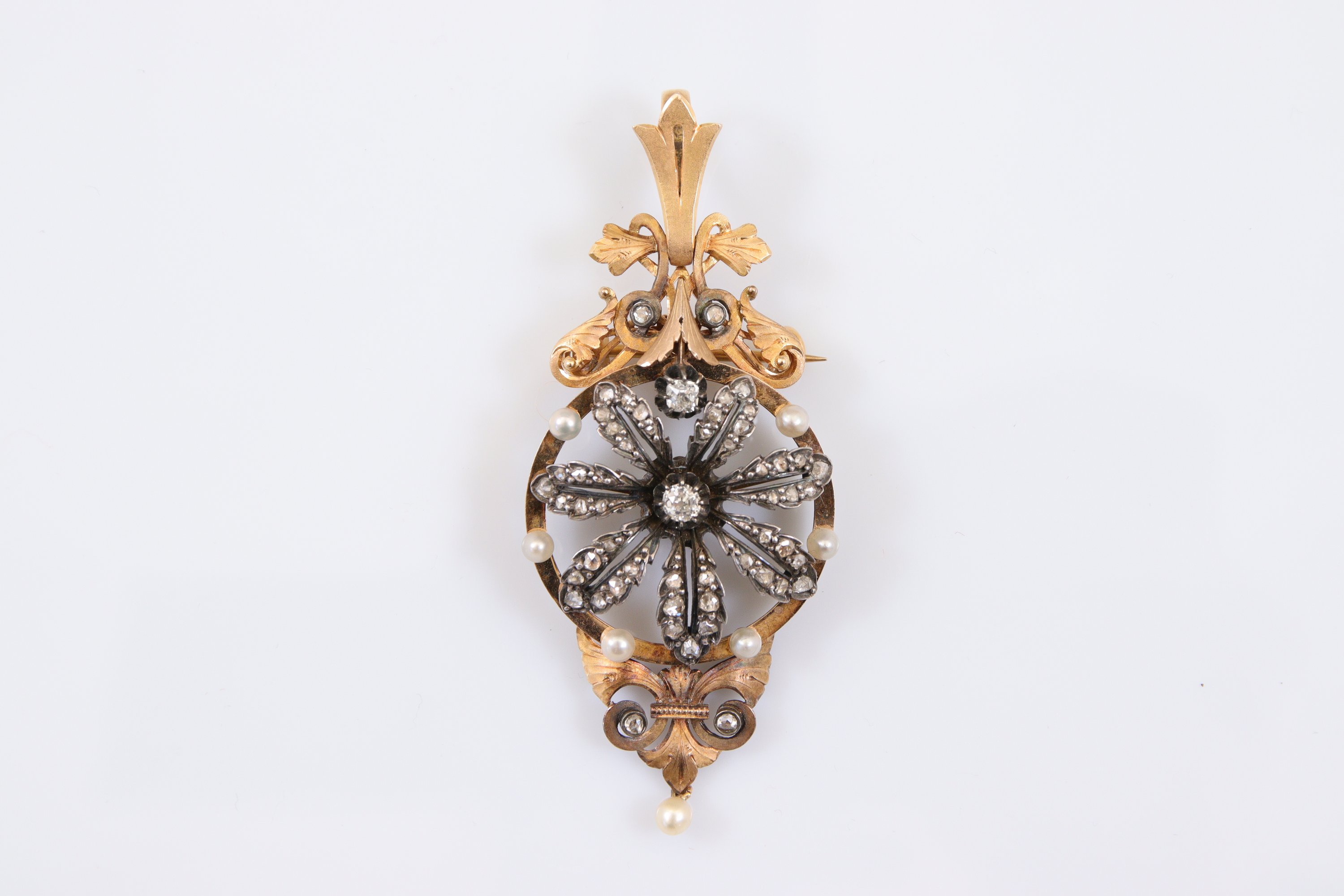 en or jaune 750 millièmes et argent doré orné de sept semences de perles fines entourant une fleur à sept pétales entièrement ornée de diamants.