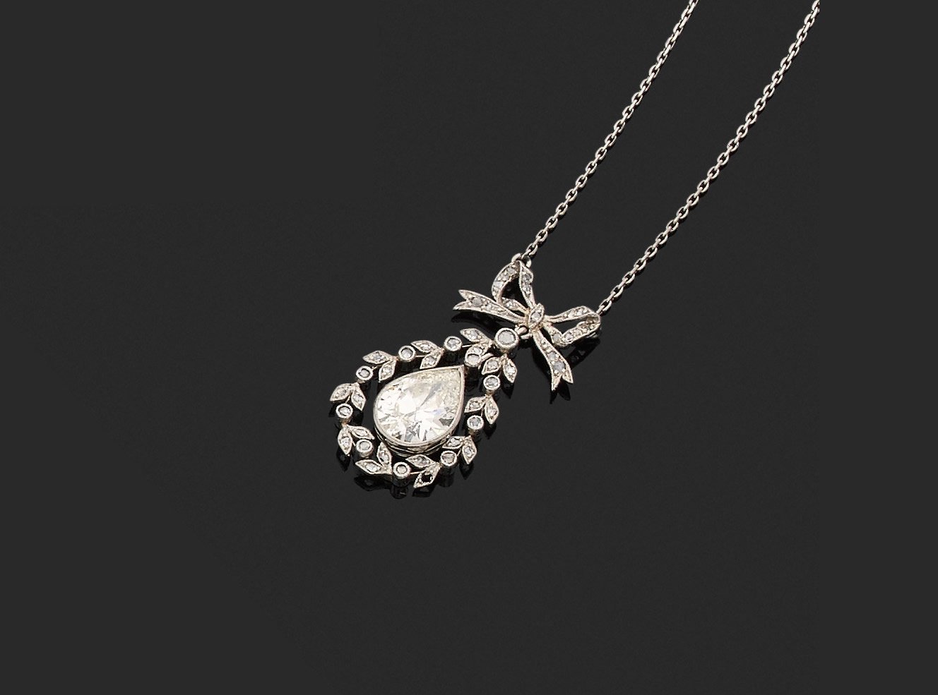 en platine 850 millièmes retenant en pendentif un motif nœud orné de diamants taillés en rose supportant au centre un diamant poire en pampille d'env. 1.60/2.00 ct. dans un entourage feuillagé également serti de diamants taillés en rose.