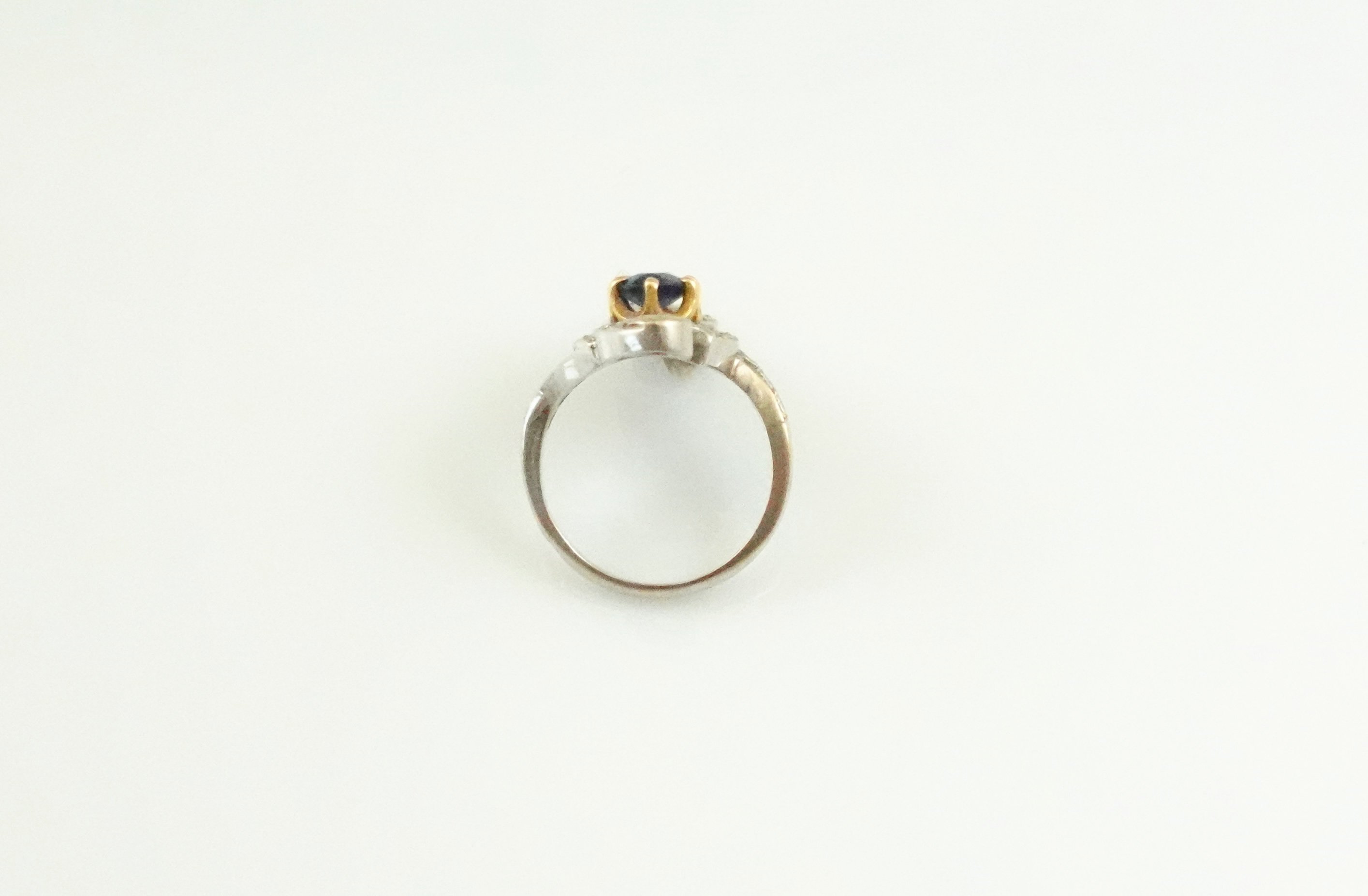 en or gris et jaune 750 millièmes sertie d'un saphir dans un entourage de rinceaux pavés de brillants et terminés par deux diamants ronds taillés en brillant.