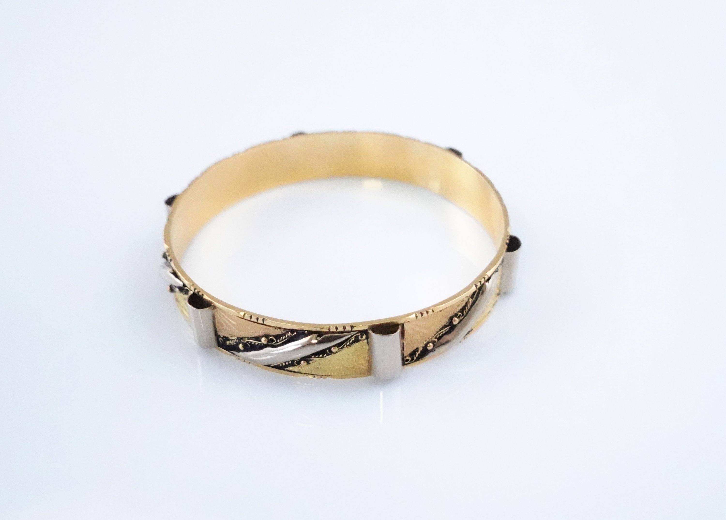 en or 750 millièmes plusieurs tons jaune, gris et rose à décor guilloché, gravé et niellé.