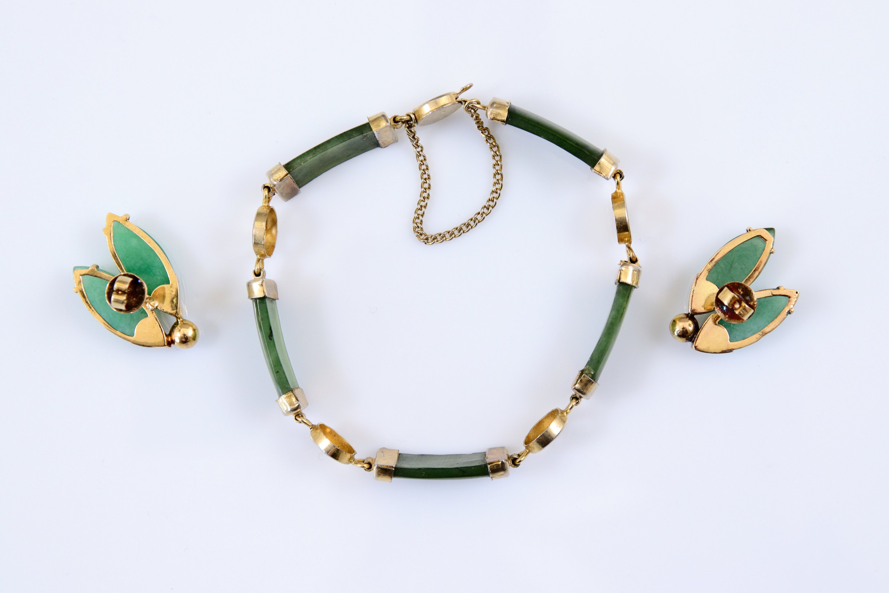 en or jaune 585 millièmes, serties de deux jades en cabochon et d'une perle pour chacune.