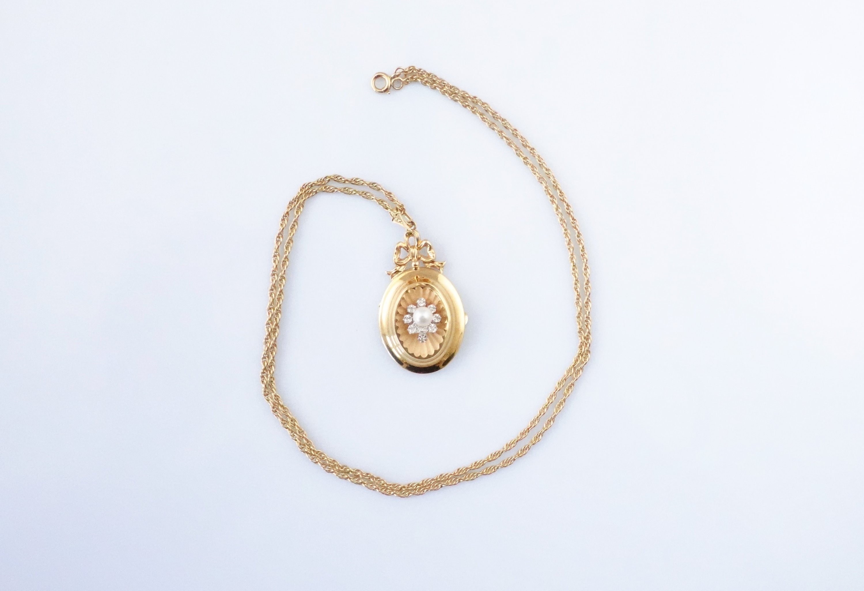 en or jaune 750 millièmes orné d'une perle dans un entourage de huit brillants, rentenu par une chaine en or jaune 750 millièmes à mailles torsadées.