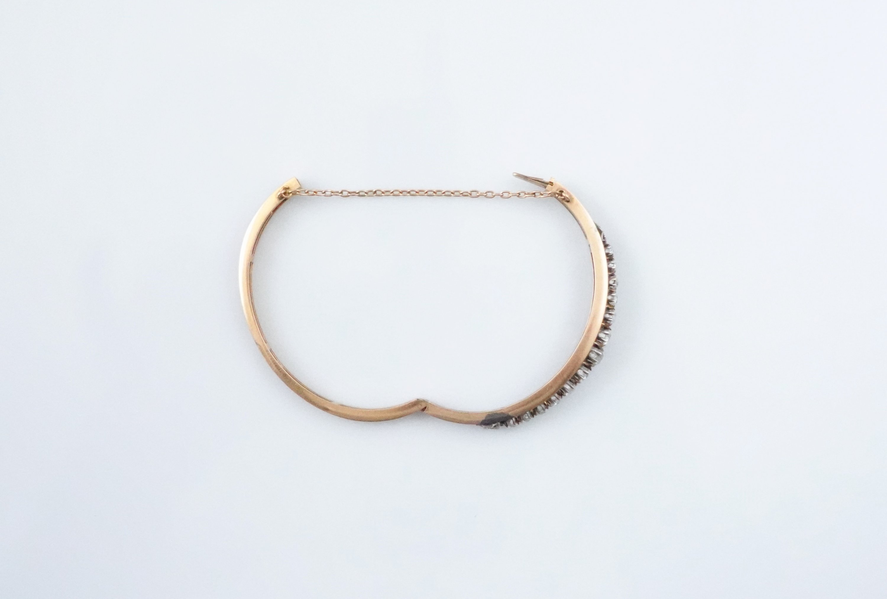 en or jaune 750 millièmes ajouré, le centre orné d'une ligne de dix-sept diamants taillés en rose ou ronds de taille ancienne en chute.