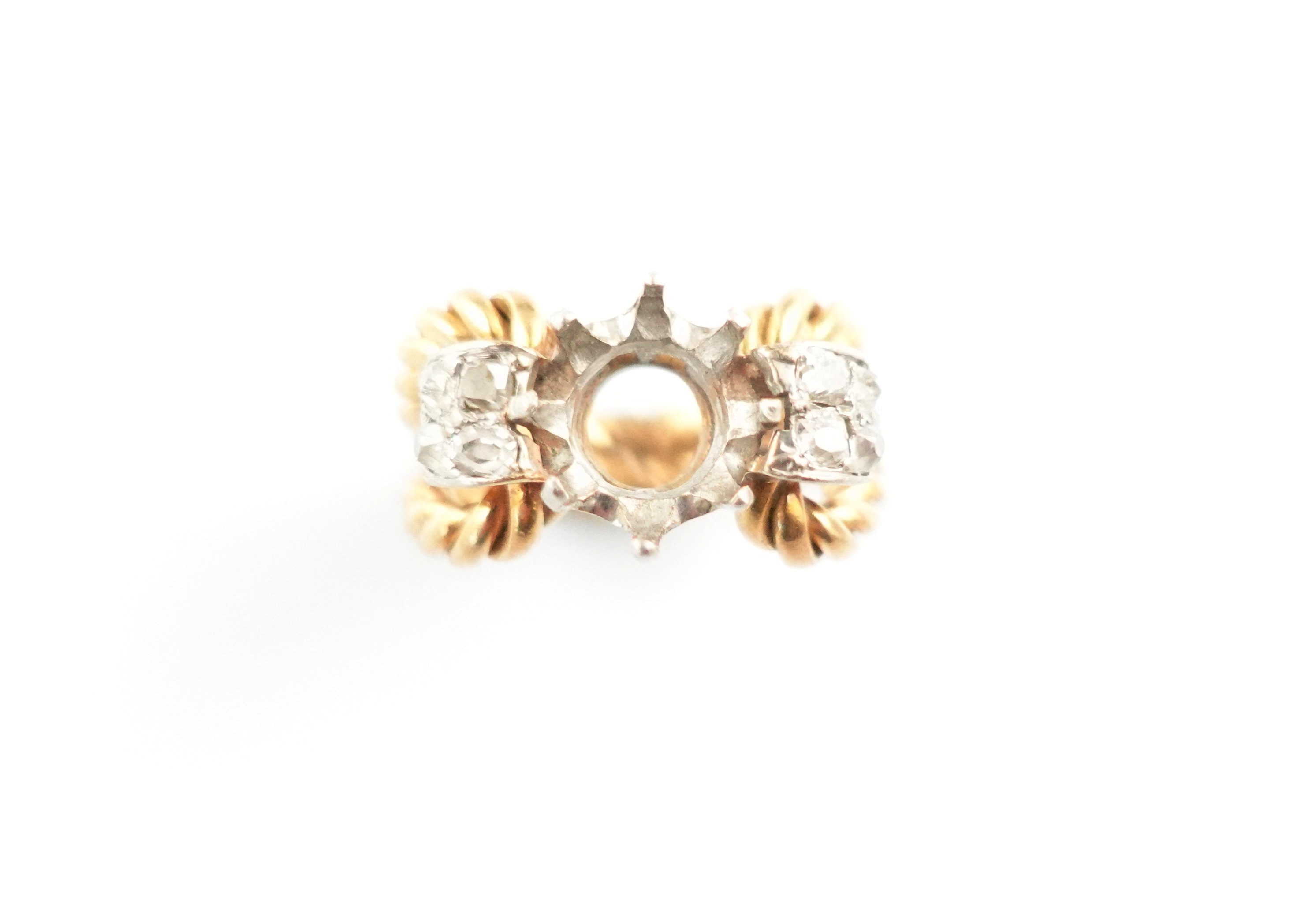 en or jaune et gris 750 millièmes, à l'anneau torsadé et chaton épaulé de petits diamants.