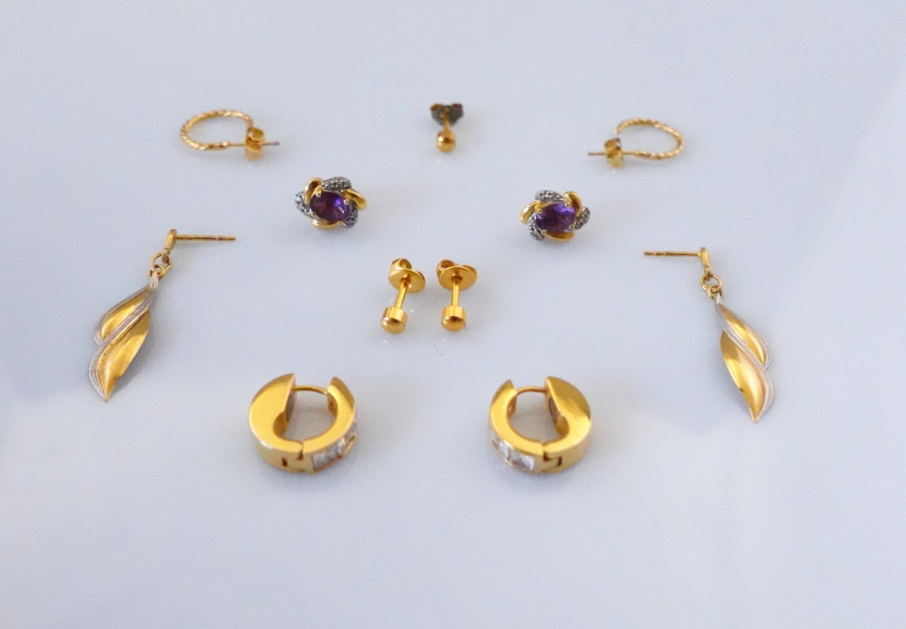 en or jaune 750 millièmes, dont une paire ornée de pierres mauves, une autre de pierres blanches.