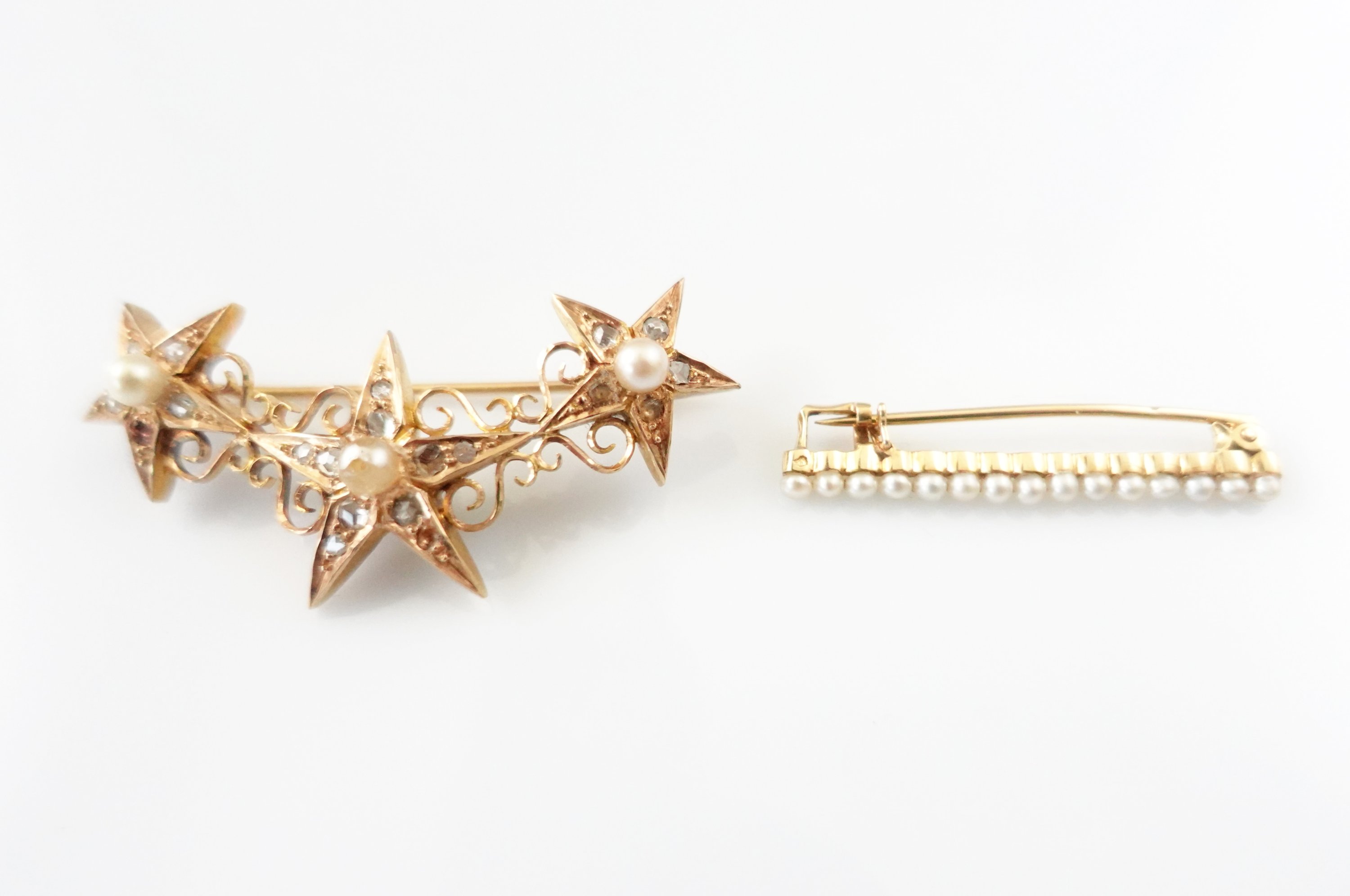 - La première à trois étoiles serties de brillants et en leur centre de perles, dans un entourage de rinceaux (manques). Long. 5 cm. Poids brut : 7,4 g.