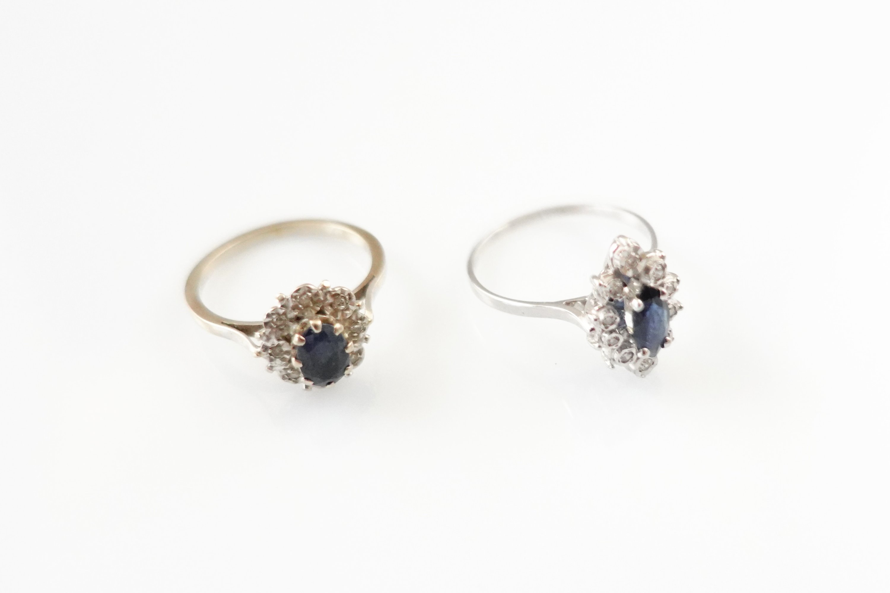 en or gris 750 millièmes, serties de pierres bleues dans un entourage de brillants.