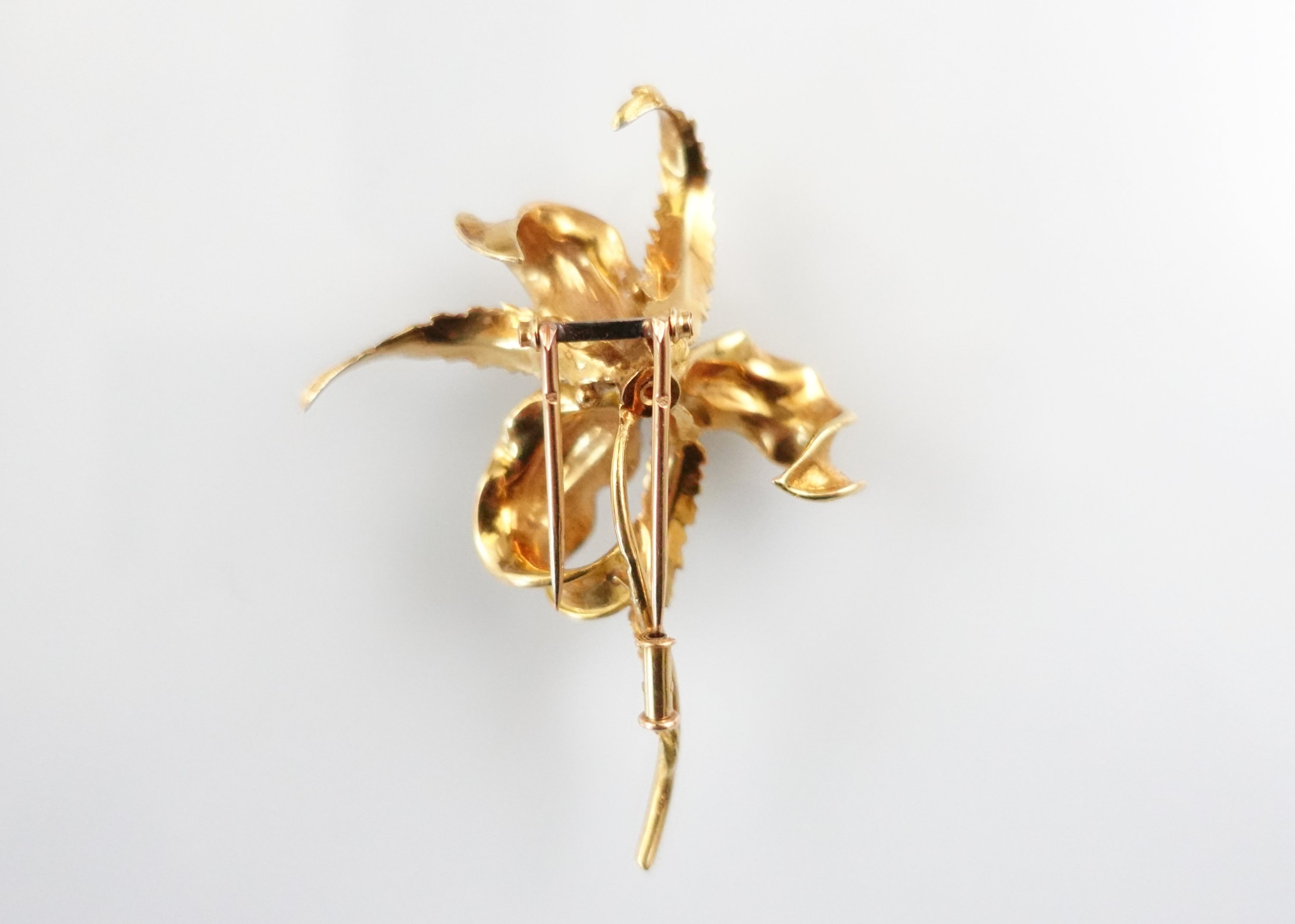 en or jaune 750 millièmes à décor de six feuilles entourant 8 brillants et 4 pierres blanches en serti griffe.