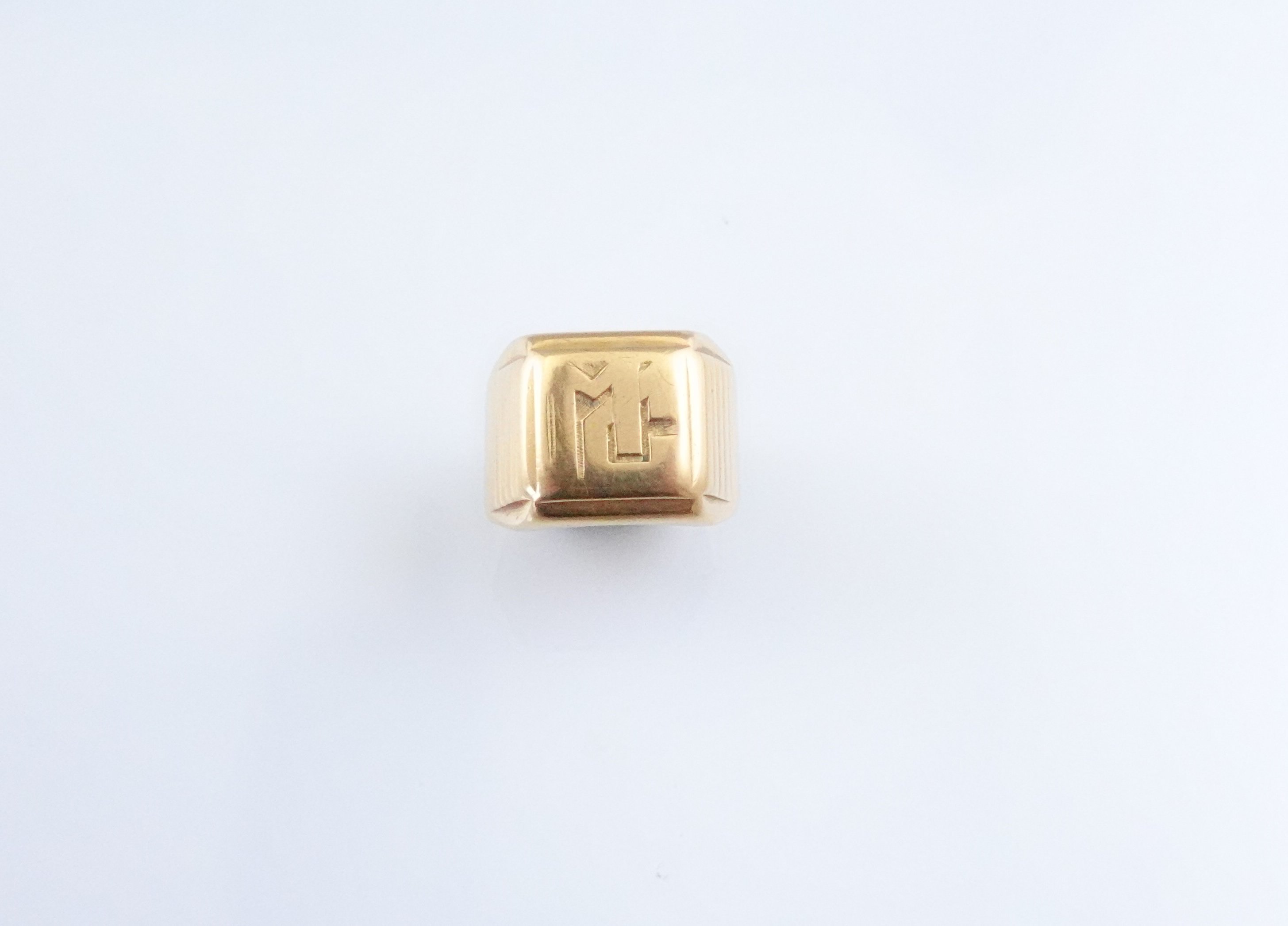 en or jaune 750 millièmes. Le chaton carré est gravé du monogramme "MC"