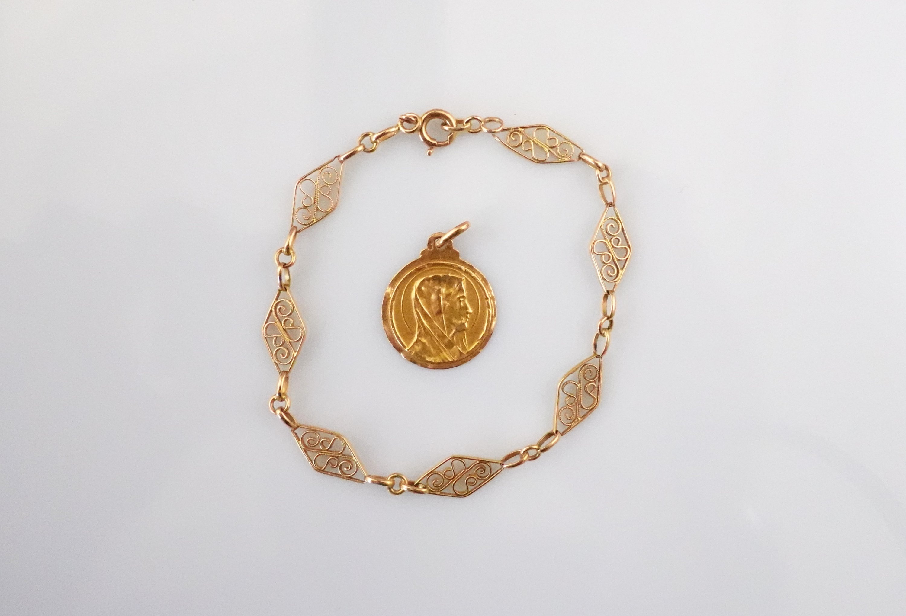 Joint : une médaille religieuse en métal doré. Poinçonnée "Fix".
