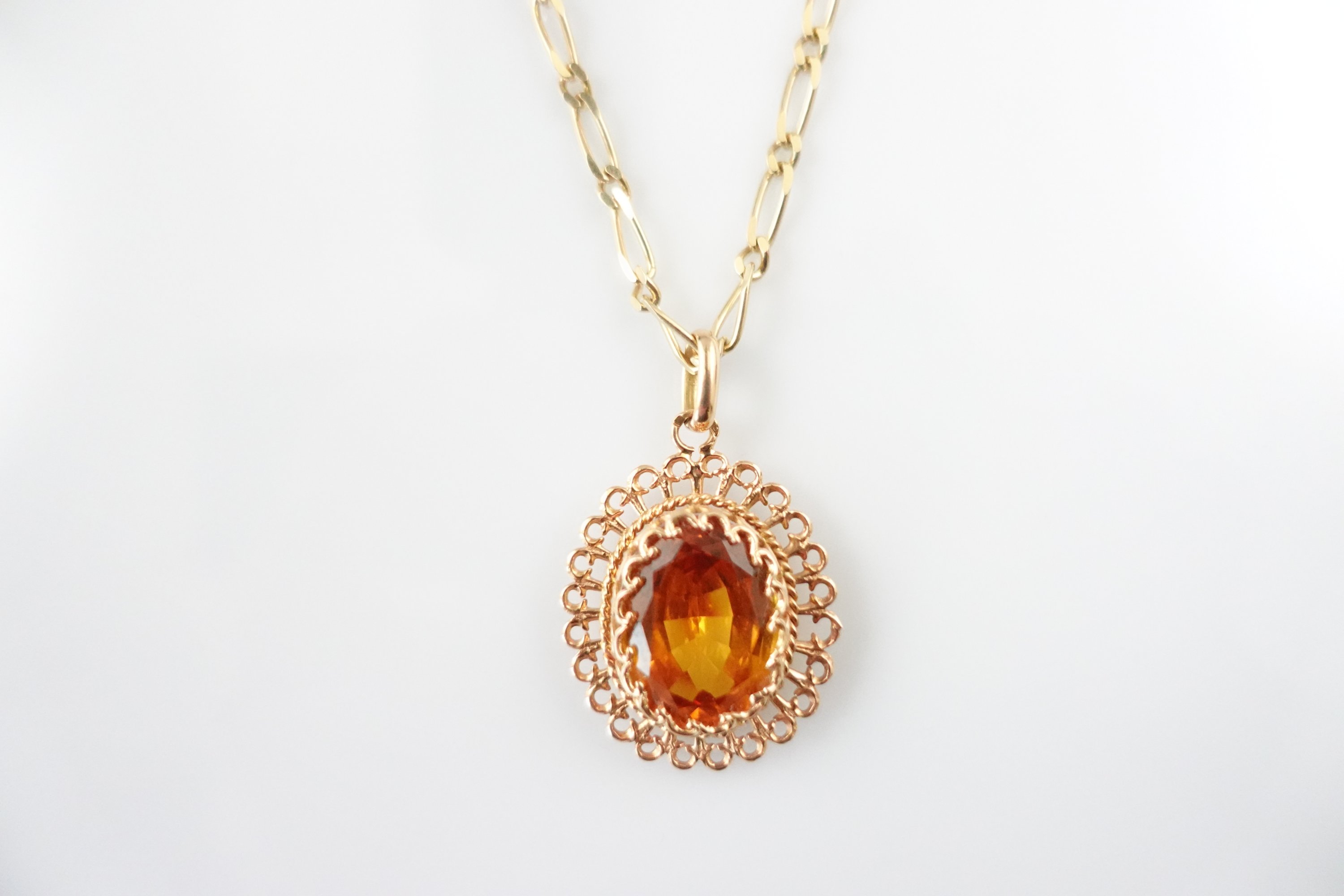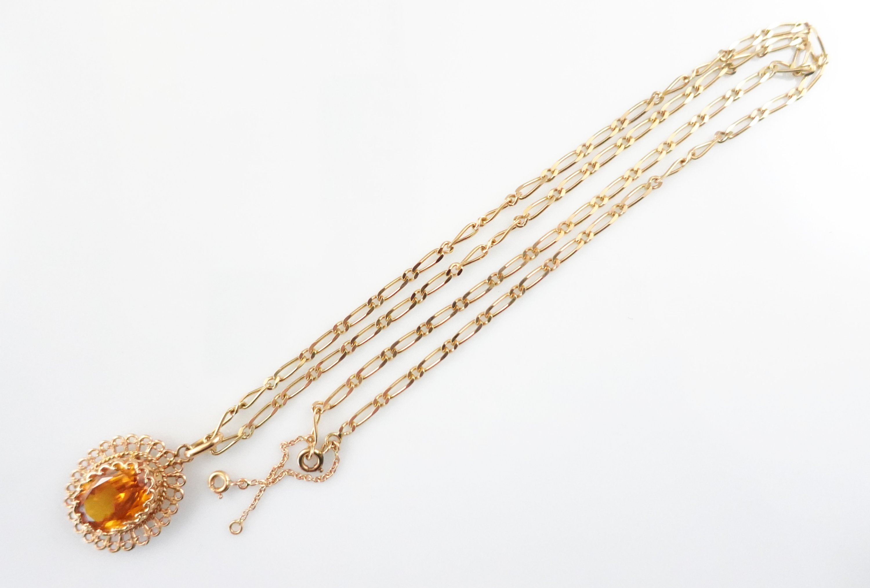 en or jaune 750 millièmes. Le pendentif ajouré est orné d'une citrine en taille ovale sertie en griffe, chaîne à mailles cheval.