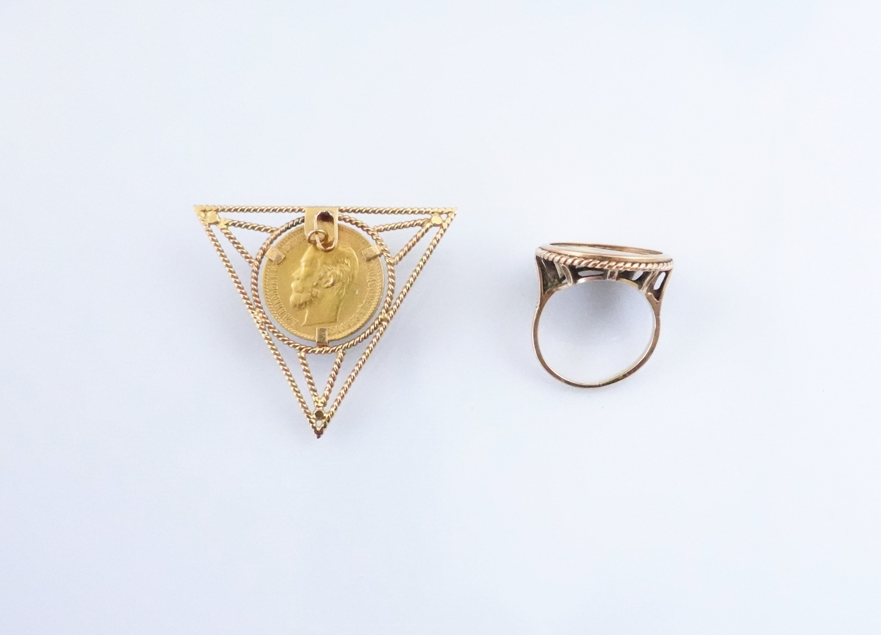 - Le pendentif en or 585 millièmes serti d'une pièce de 5 roubles Nicolas II dans une monture de forme triangulaire.