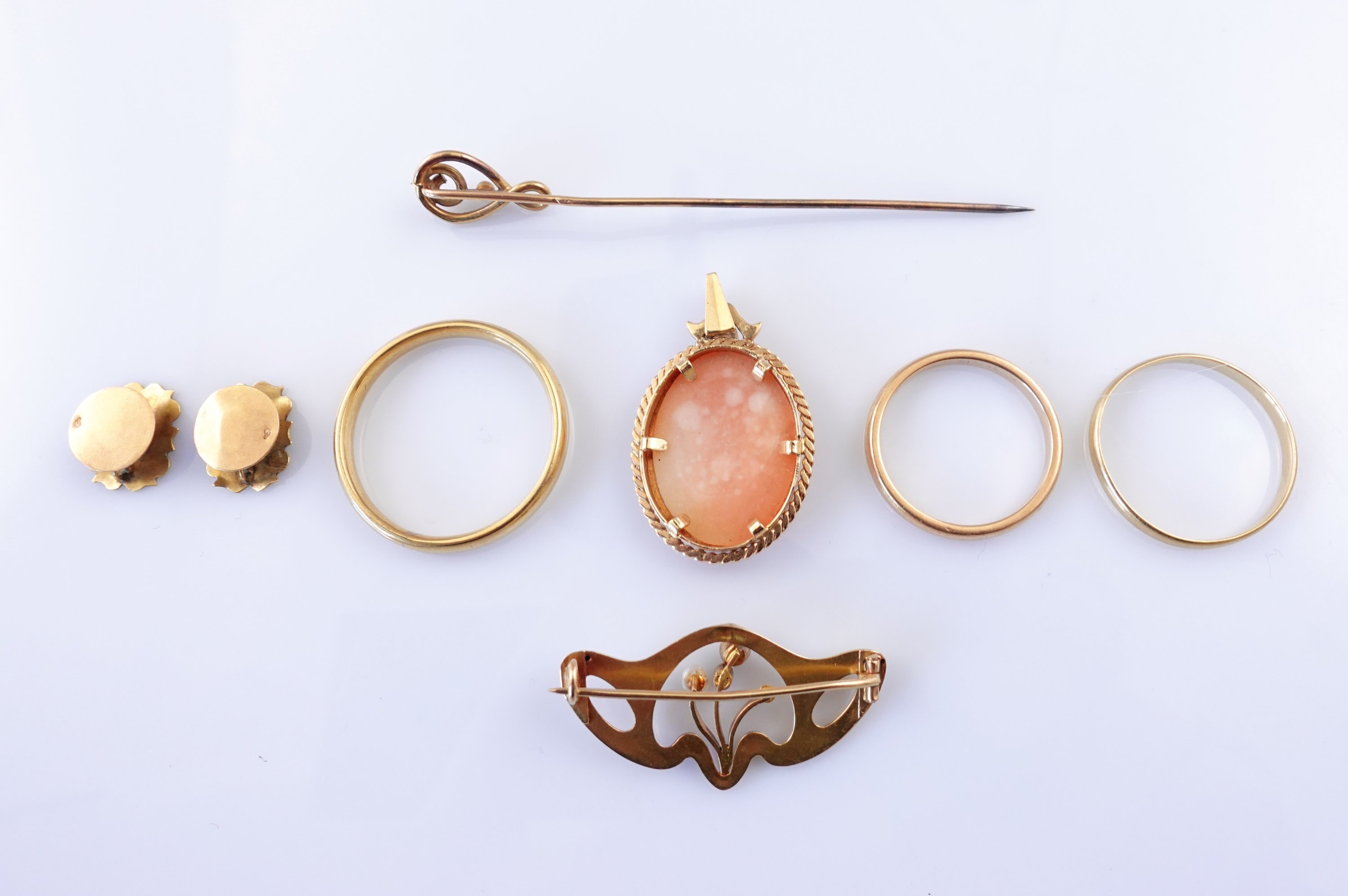 en or jaune 750 millièmes, dont une épingle à chapeau ornée d'une perle, d'une paire de boutons de col, de trois alliances, une petite broche sertie de deux perles et une pierre bleue (manque une pierre), un pendentif au camée coquille.