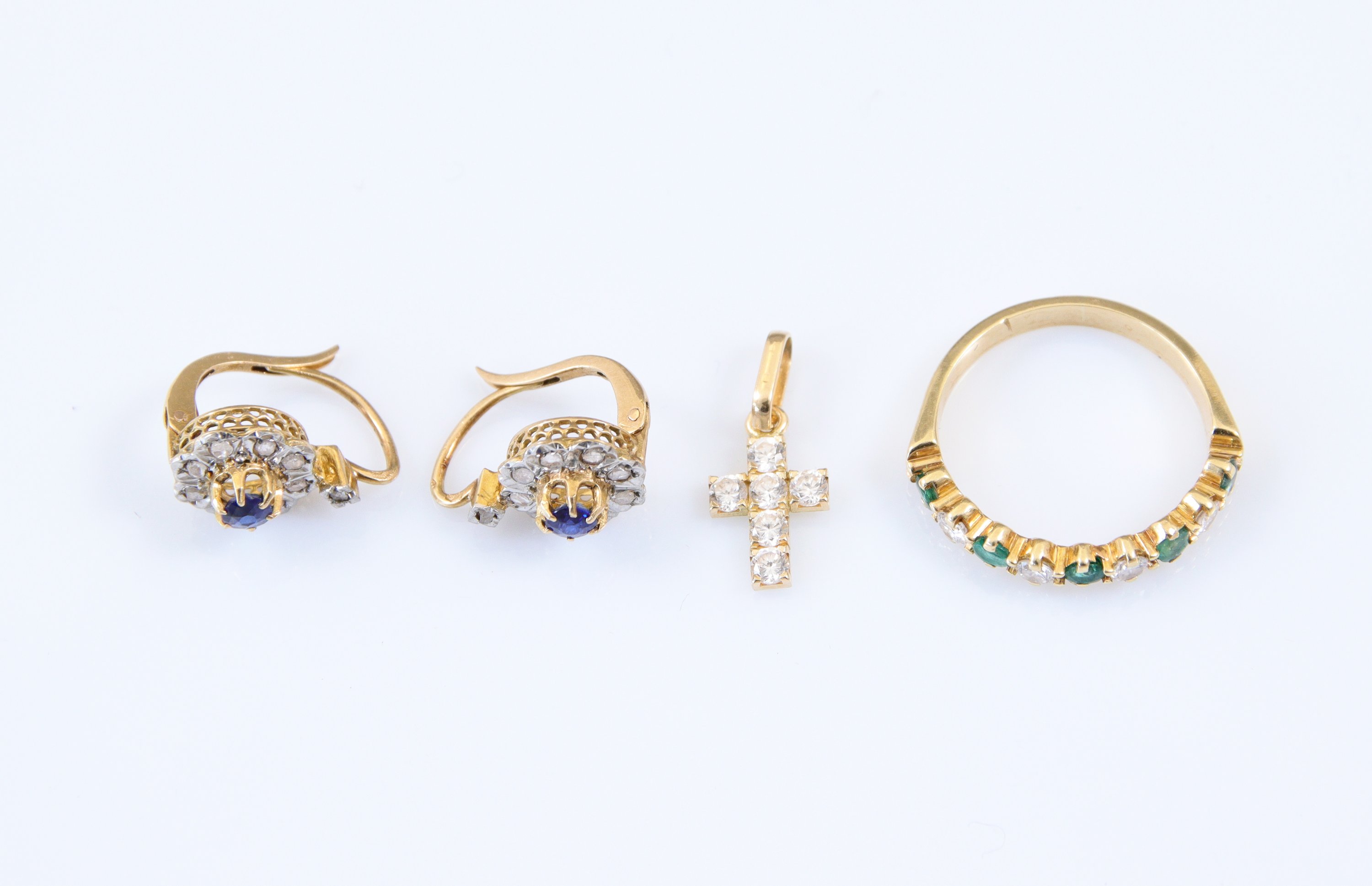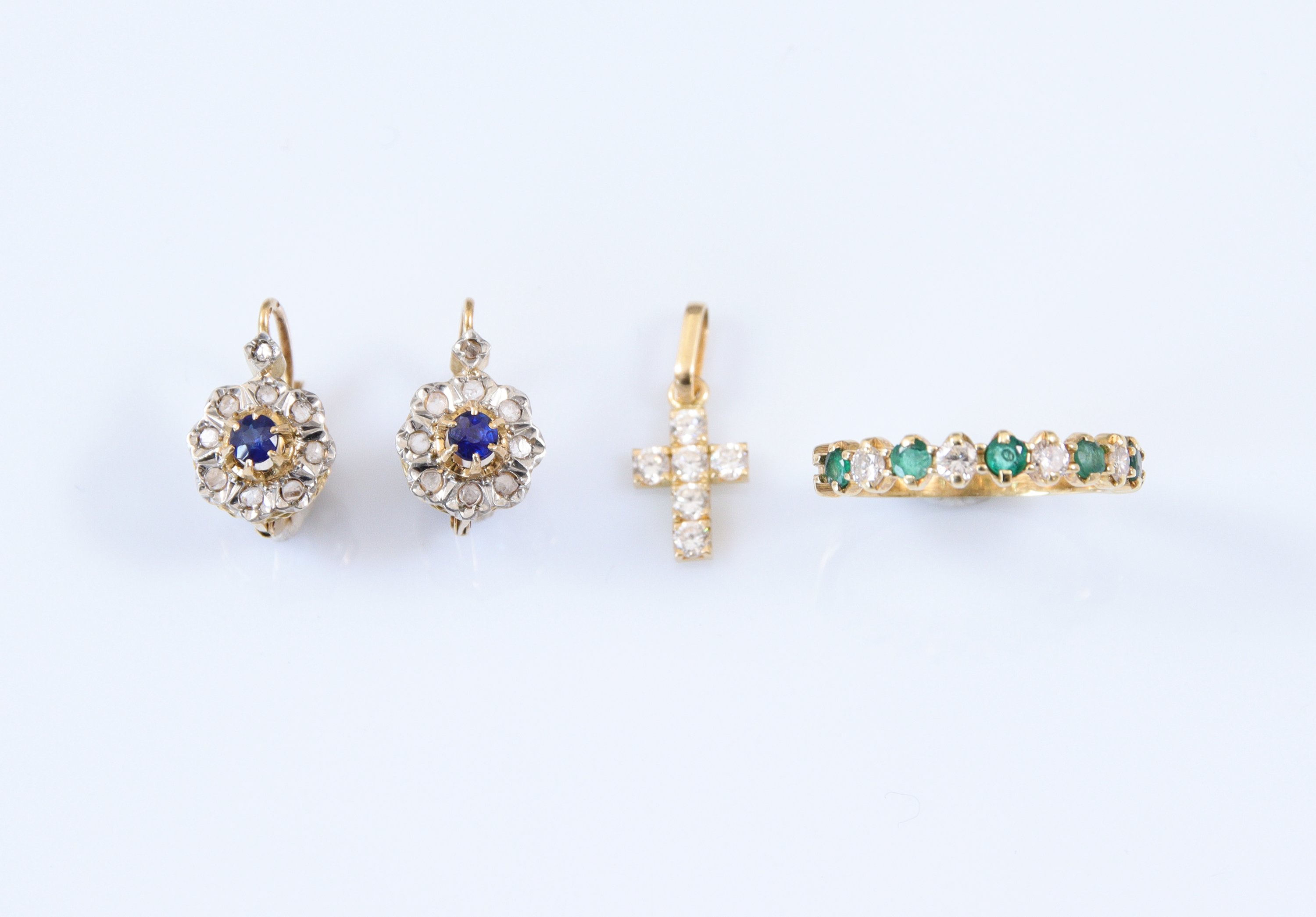 en or jaune 750 millièmes ornées de pierres fines. La bague sertie de cinq émeraudes et quatre diamants.