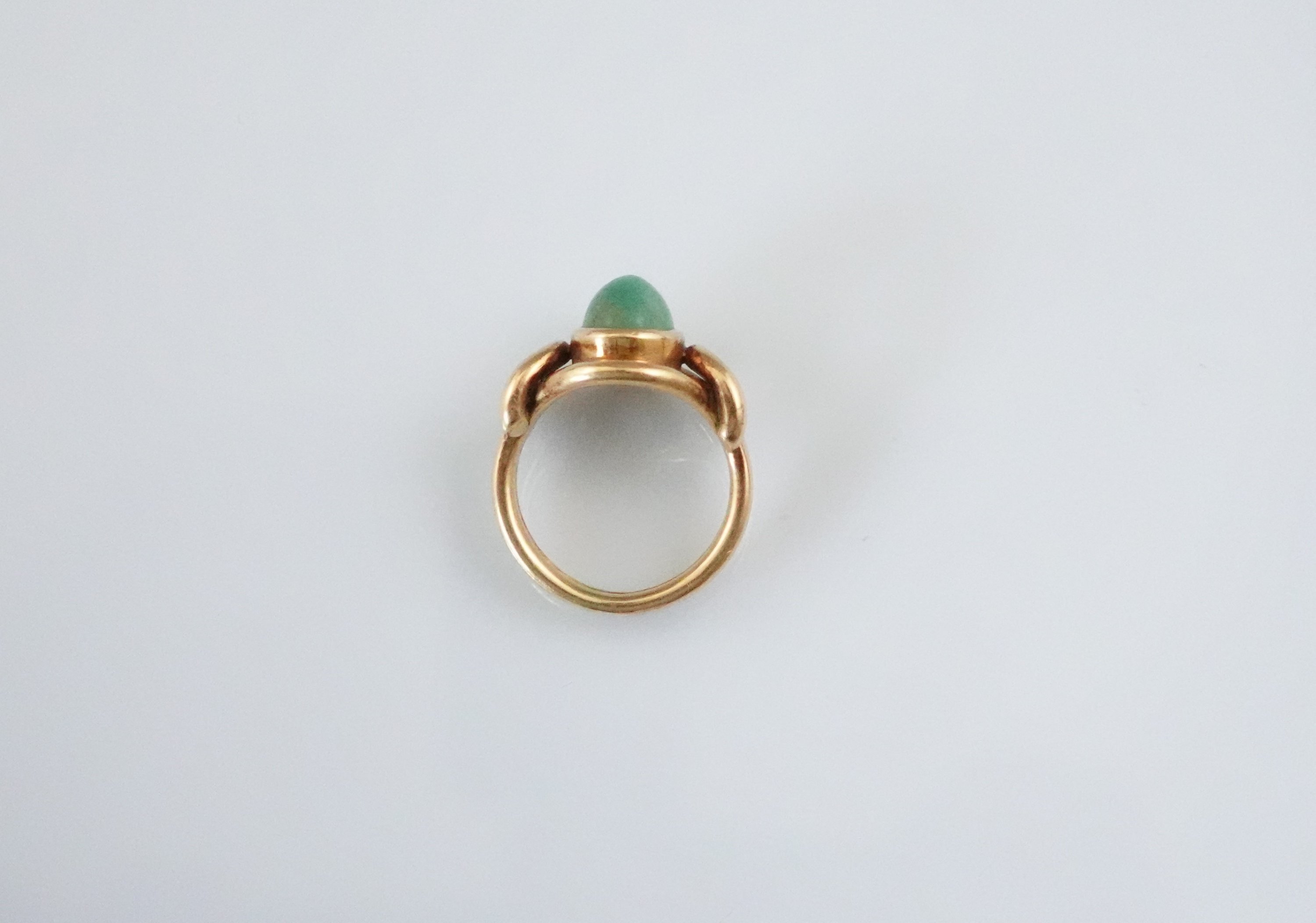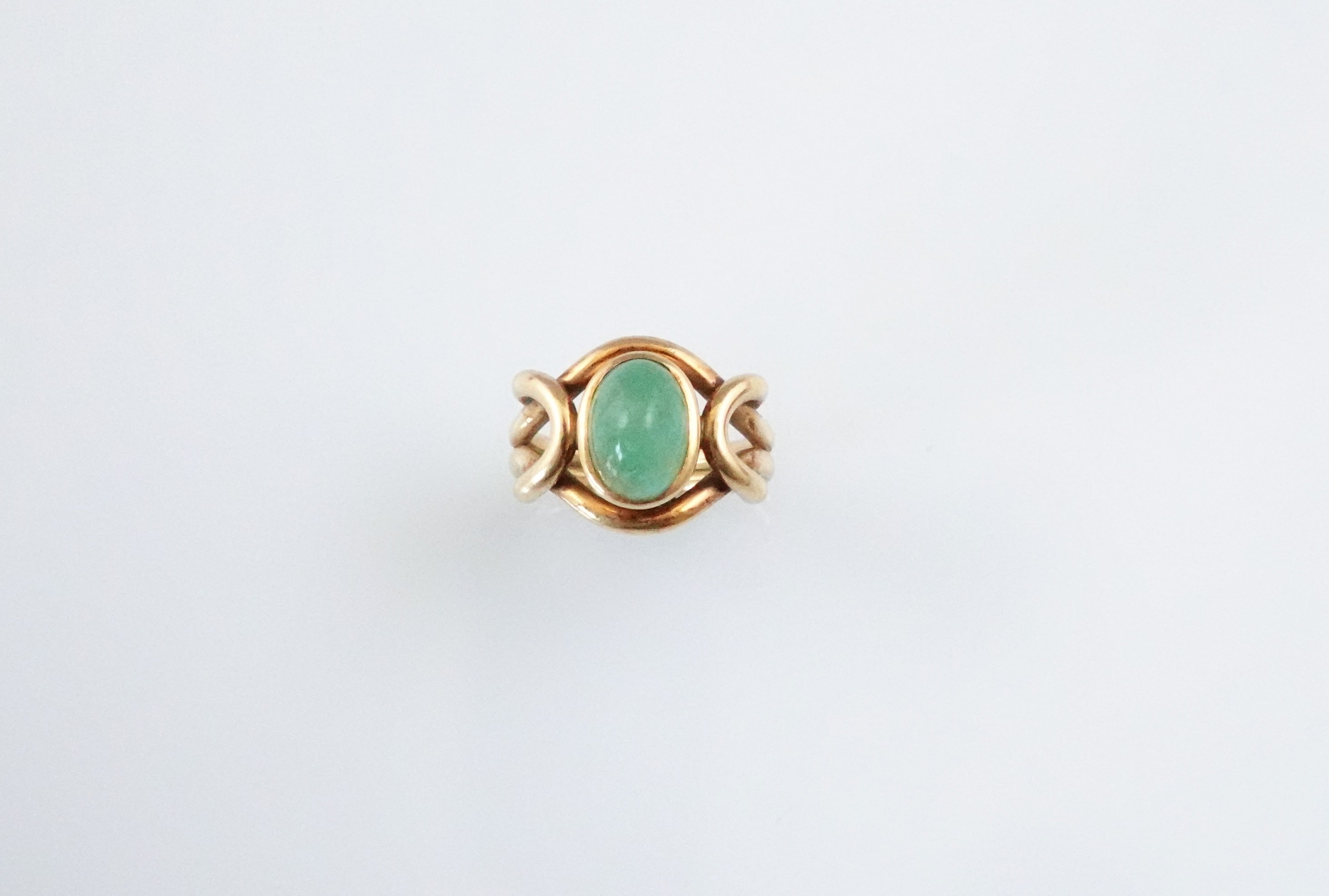 en or jaune 585 millièmes sertie d'une pierre verte en cabochon dans un entourage de deux noeuds.