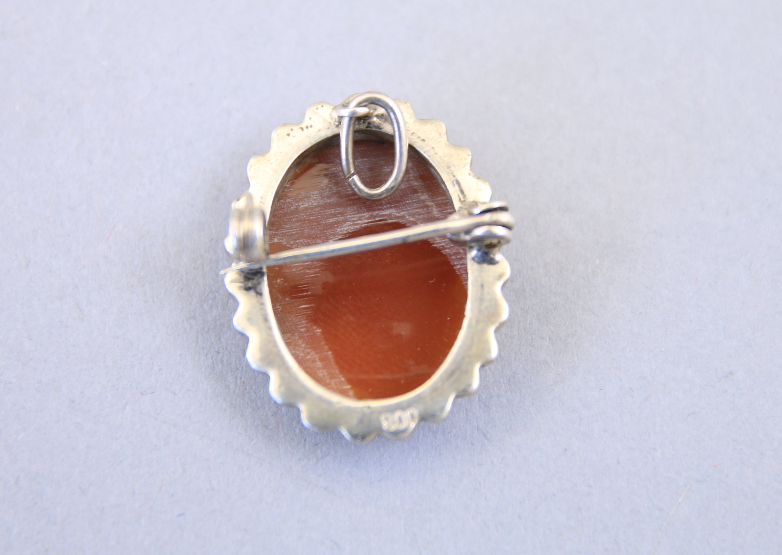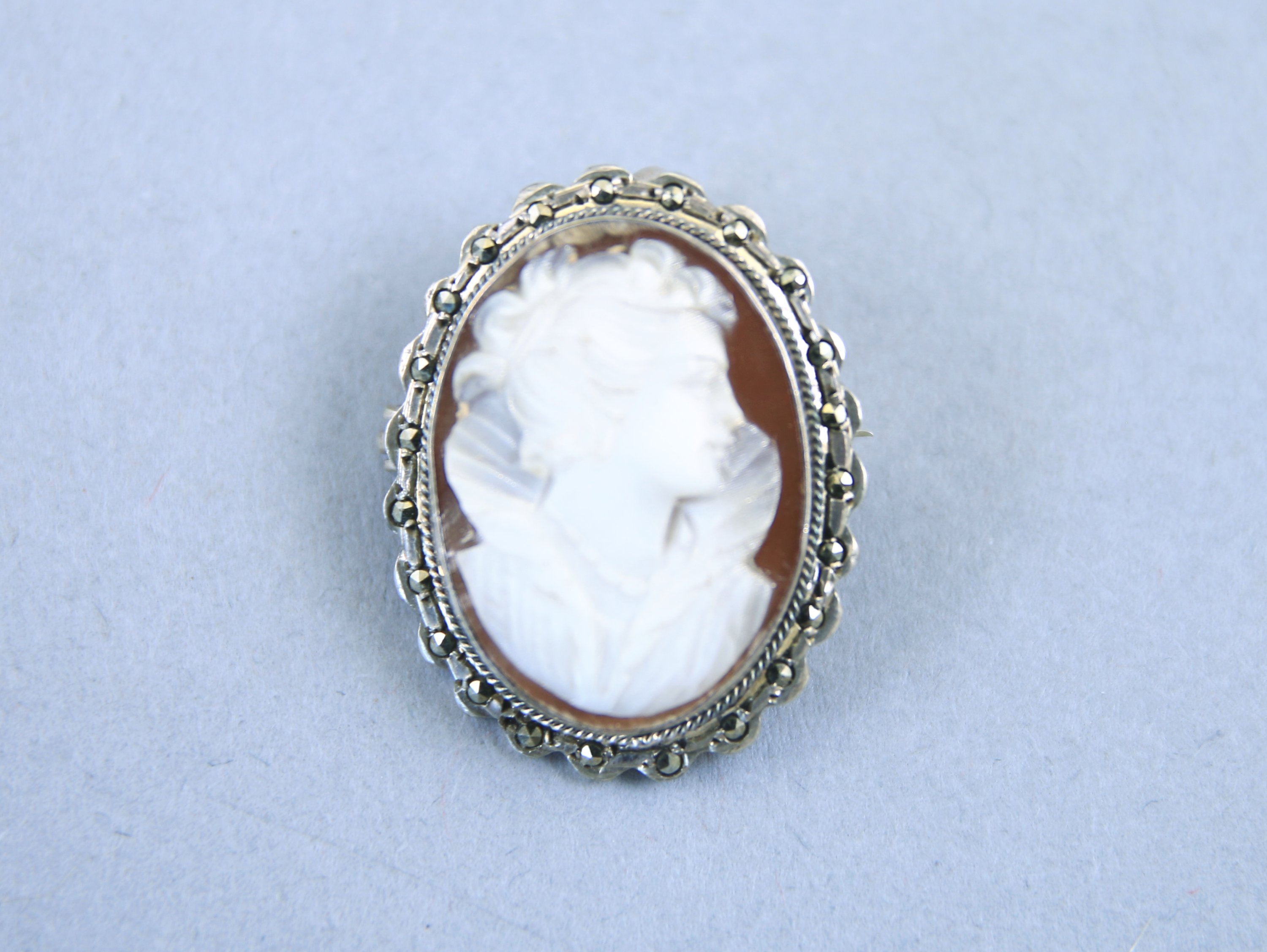 en argent 800 millièmes sertie de pierres du Rhin entourant un camée pierre à décor d'un profil de femme à la colerette.