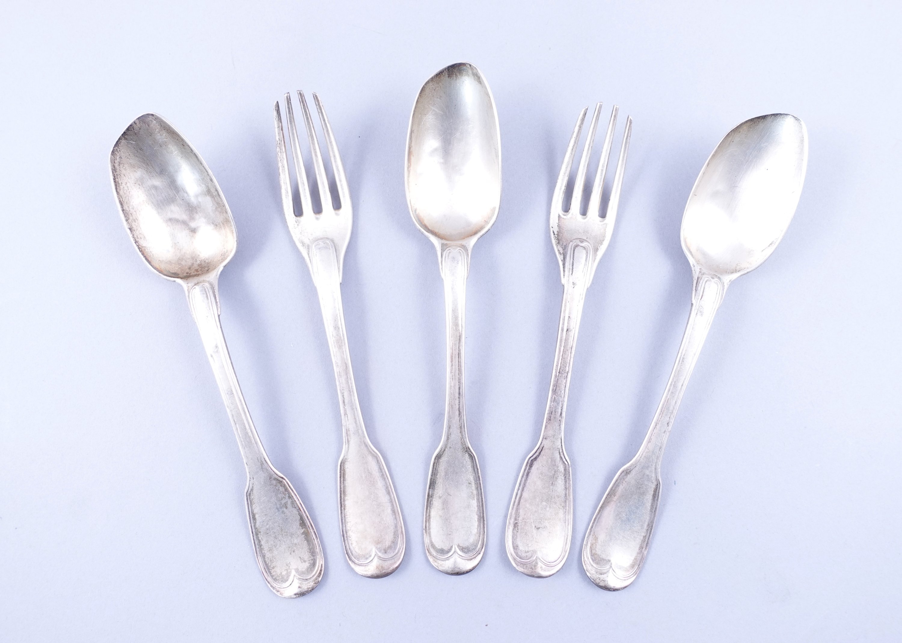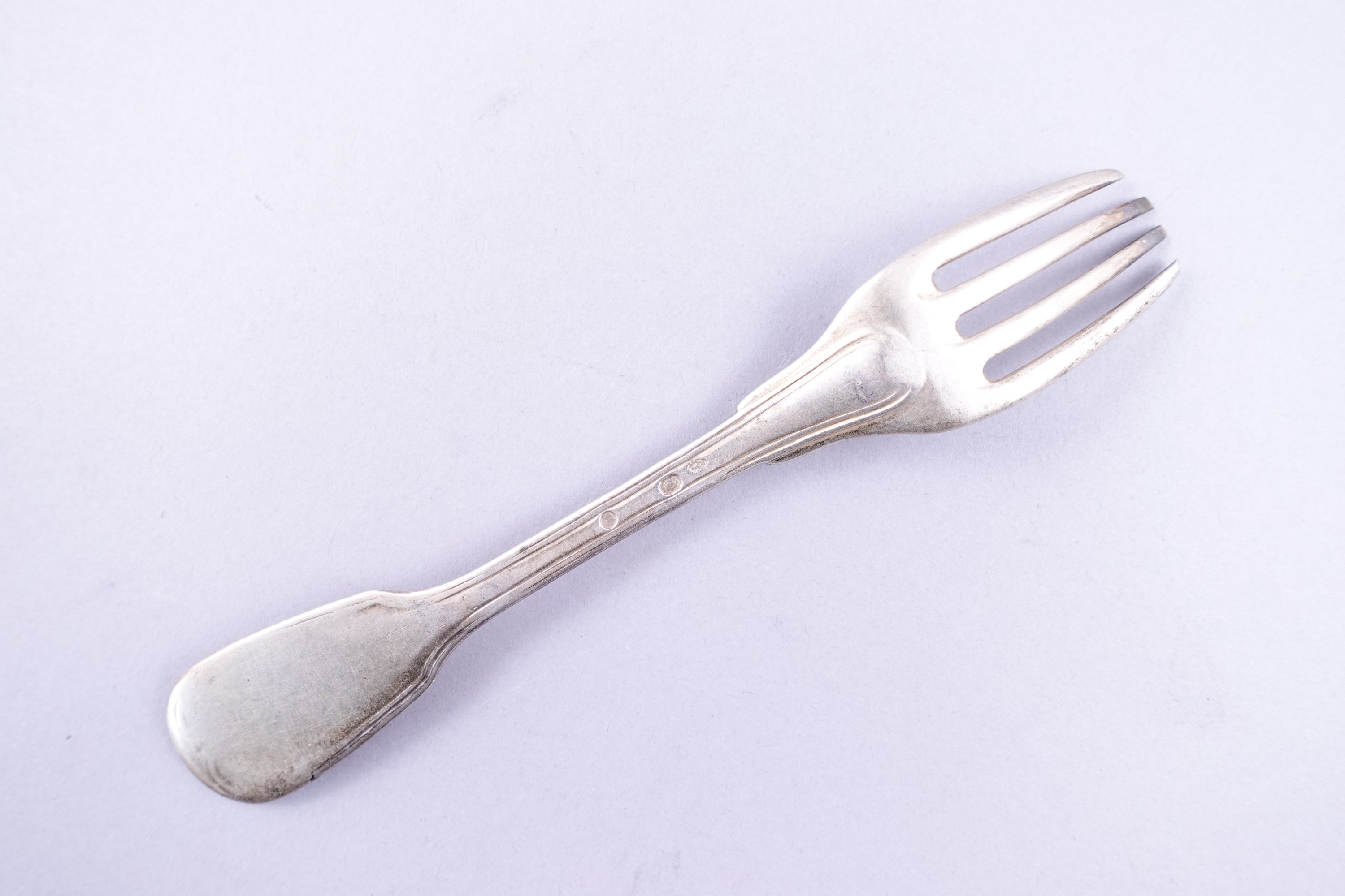 Joint : une fourchette de table en argent, modèle à filet. Poinçon Deuxième coq 1er titre. Poids 79 g.