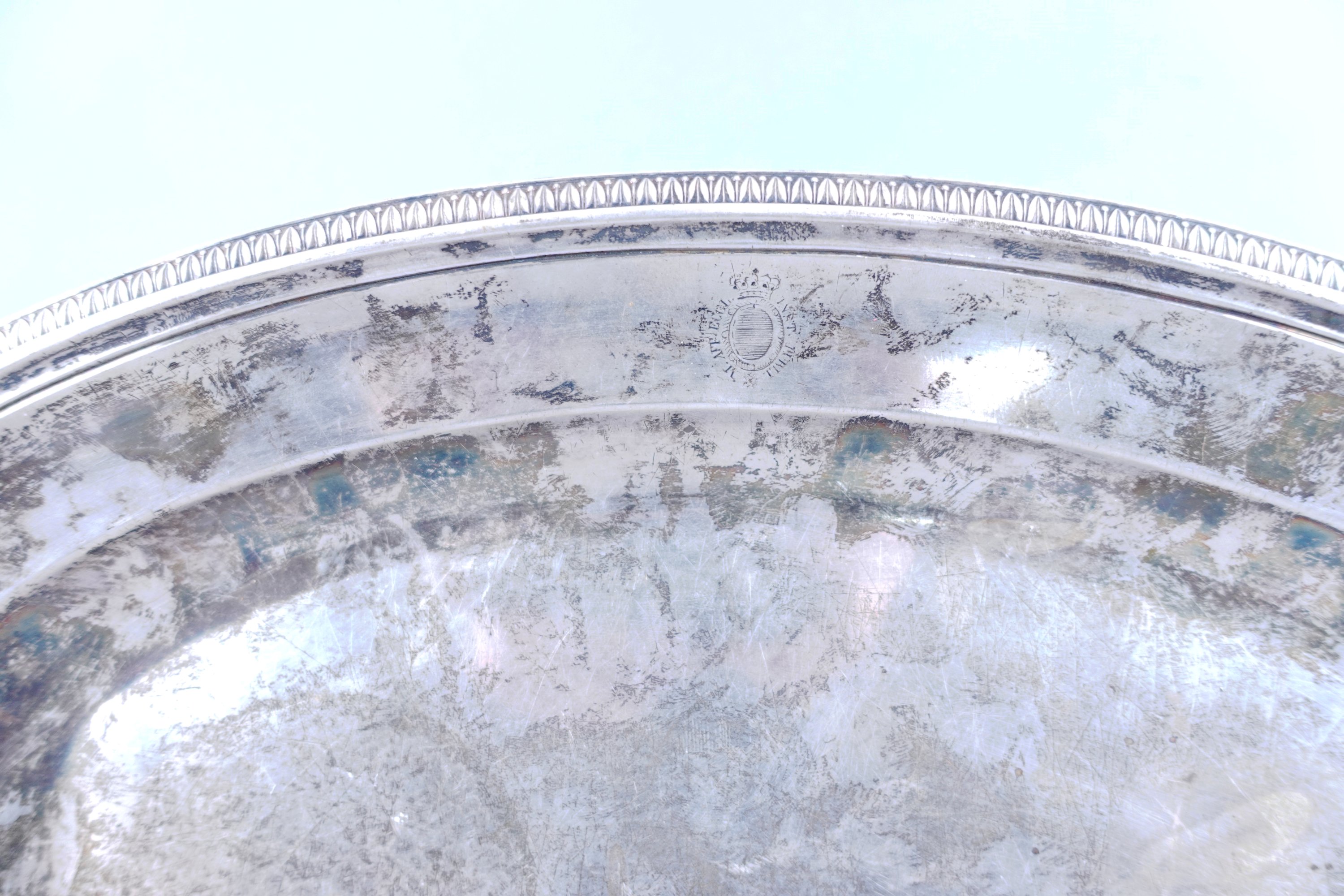 en argent mouluré et décor ciselé d'une frise de feuilles d'eau. Une couronne fermée avec le collier de l'Ordre du Saint-Esprit et devise "M.AFF.ECCL.INST.PUBLI" sur le bord supérieur.