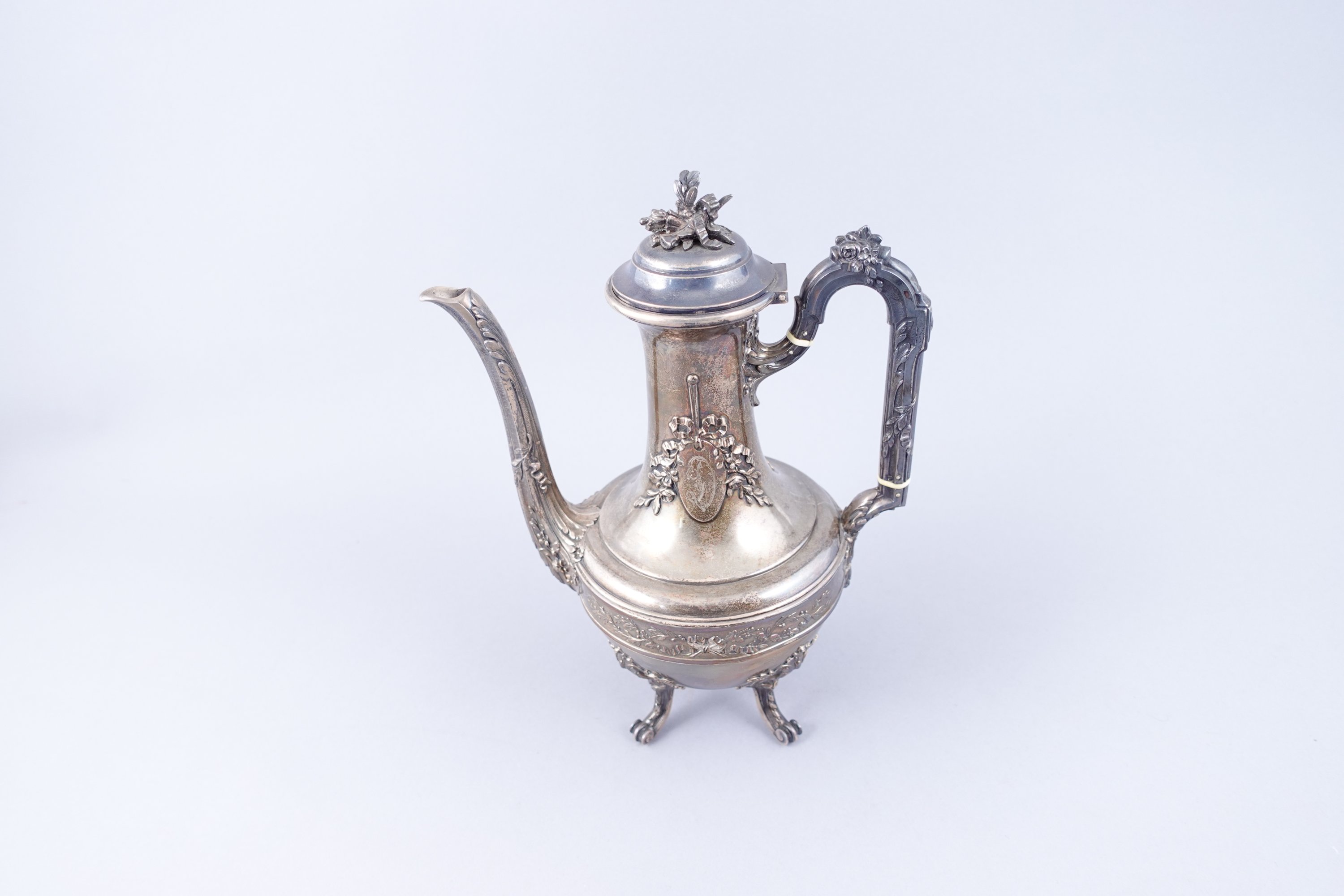 - Théïère quadripode de style Louis XVI, à décor de guirlande, fleurs et feuillages, mongrammée "D". Poinçon Minerve Ier titre. Haut. 27,5 cm. Poids brut : 685 g.