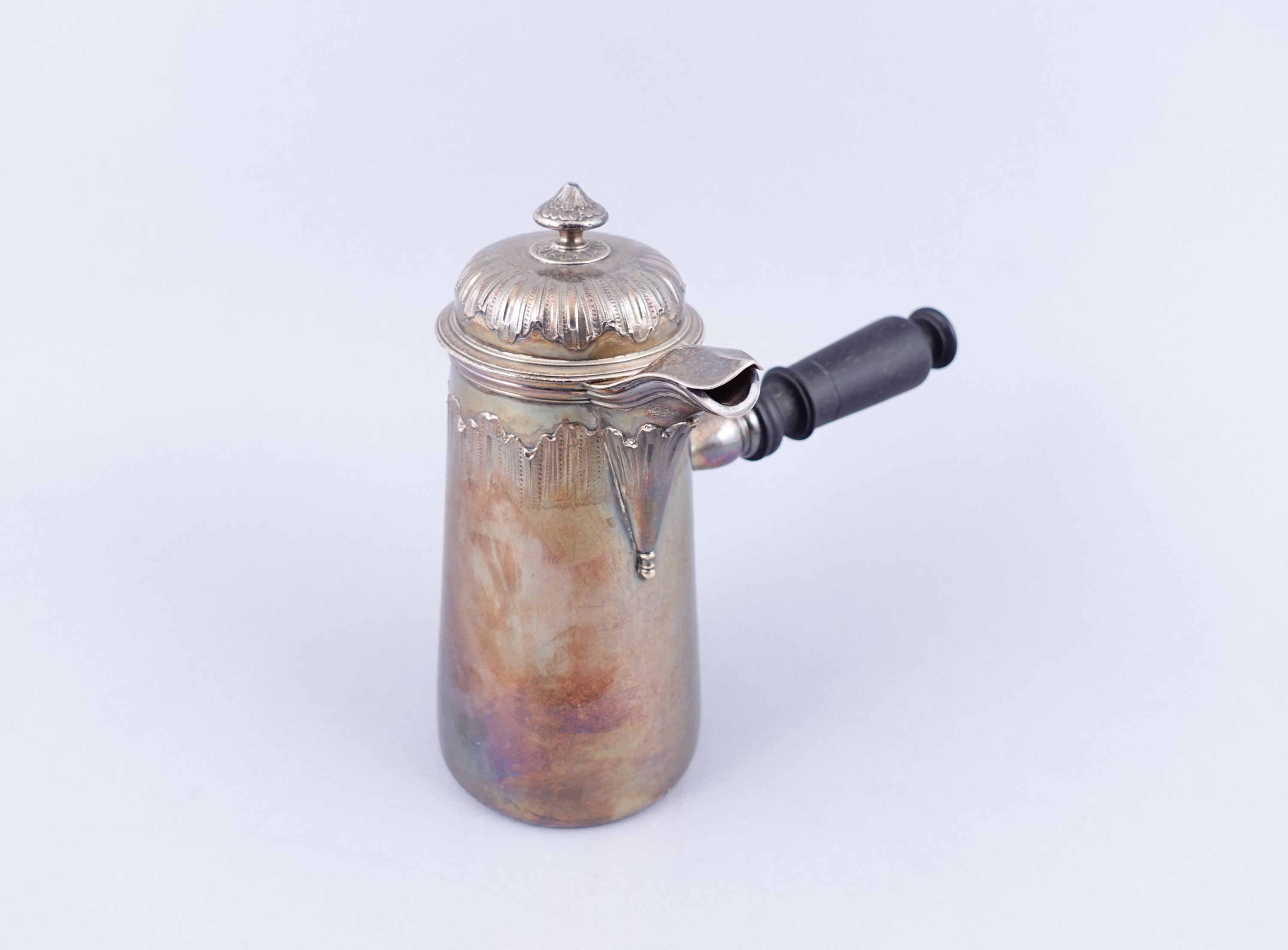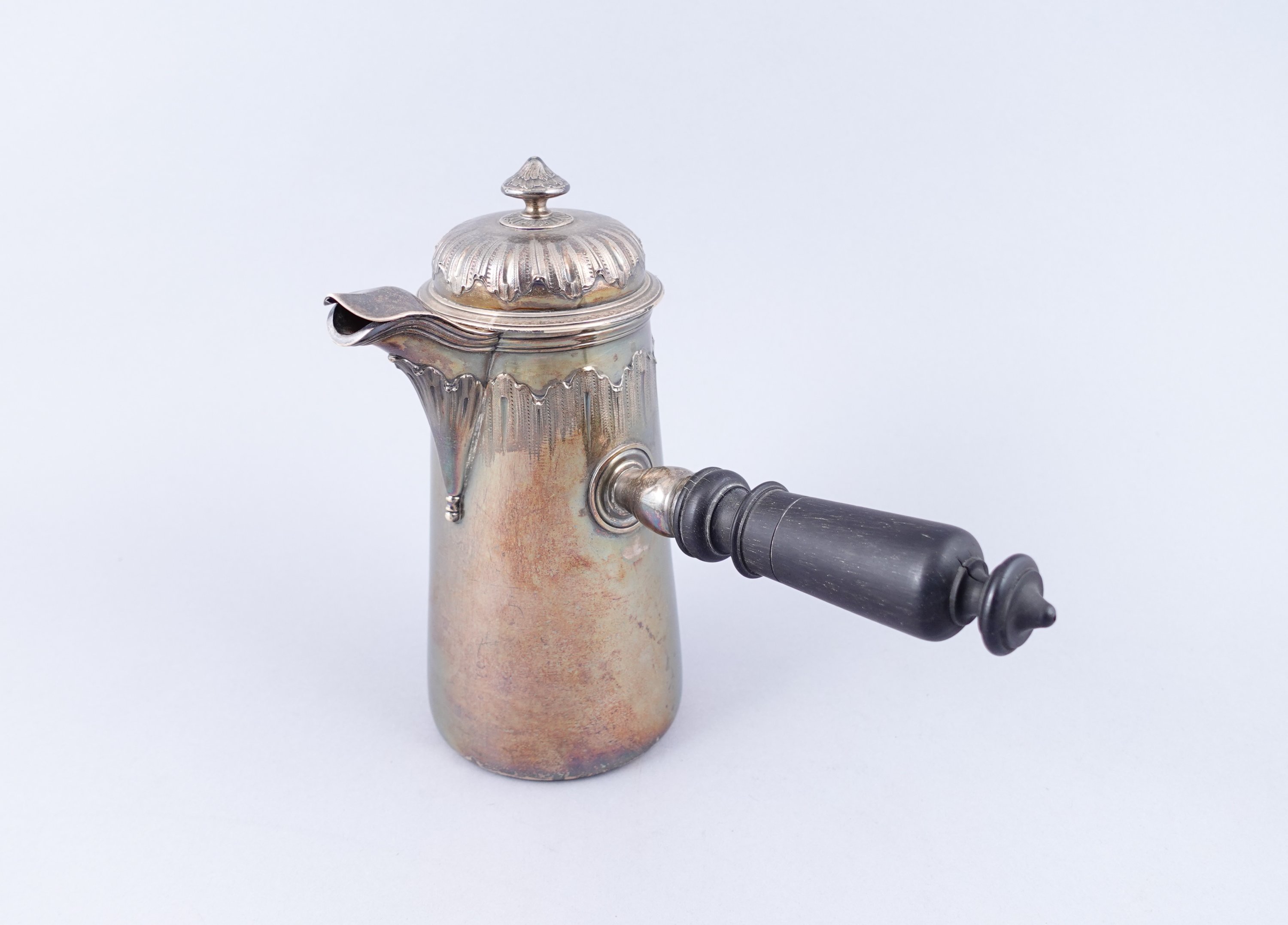 - Cafetière droite de style Régence, au bec verseur feuillagé, prise sur le couvercle et manche en bois noirci. Poinçon Minerve Ier titre. Haut. 20 cm. Poids brut : 602 g.
