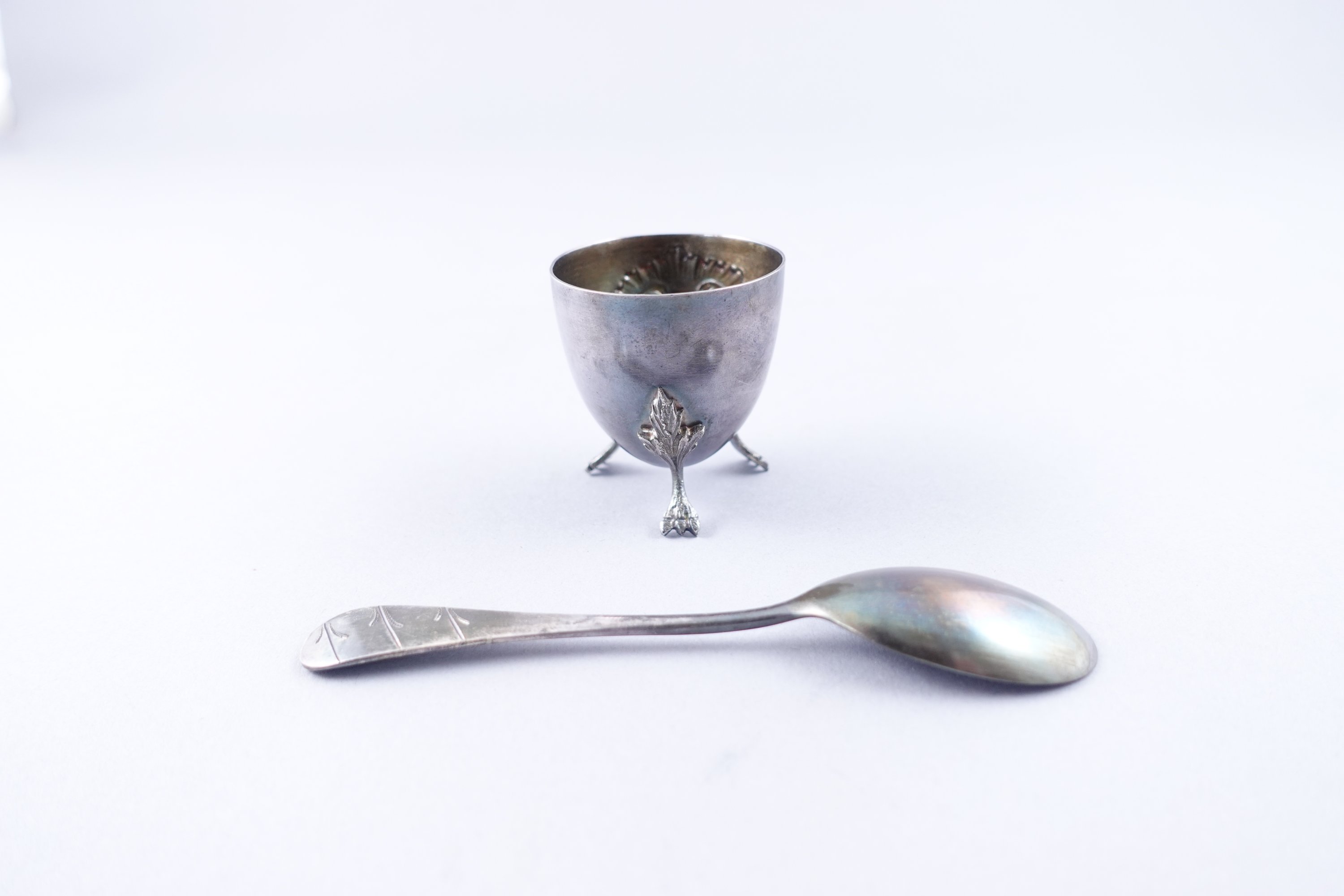 - Un coquetier en métal argenté à décor d'un cartouche monogrammé "FP", piétement tripode à griffes.