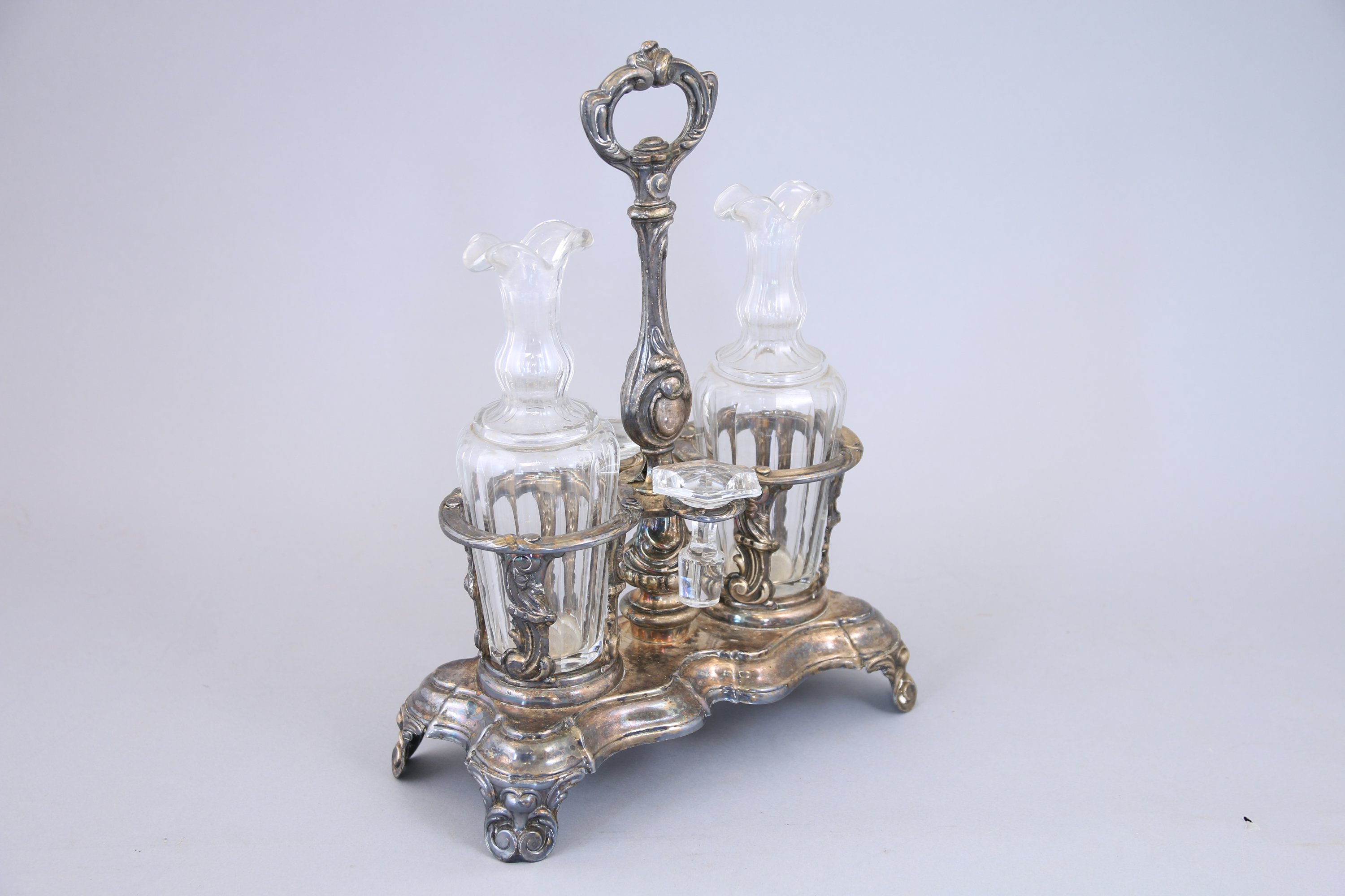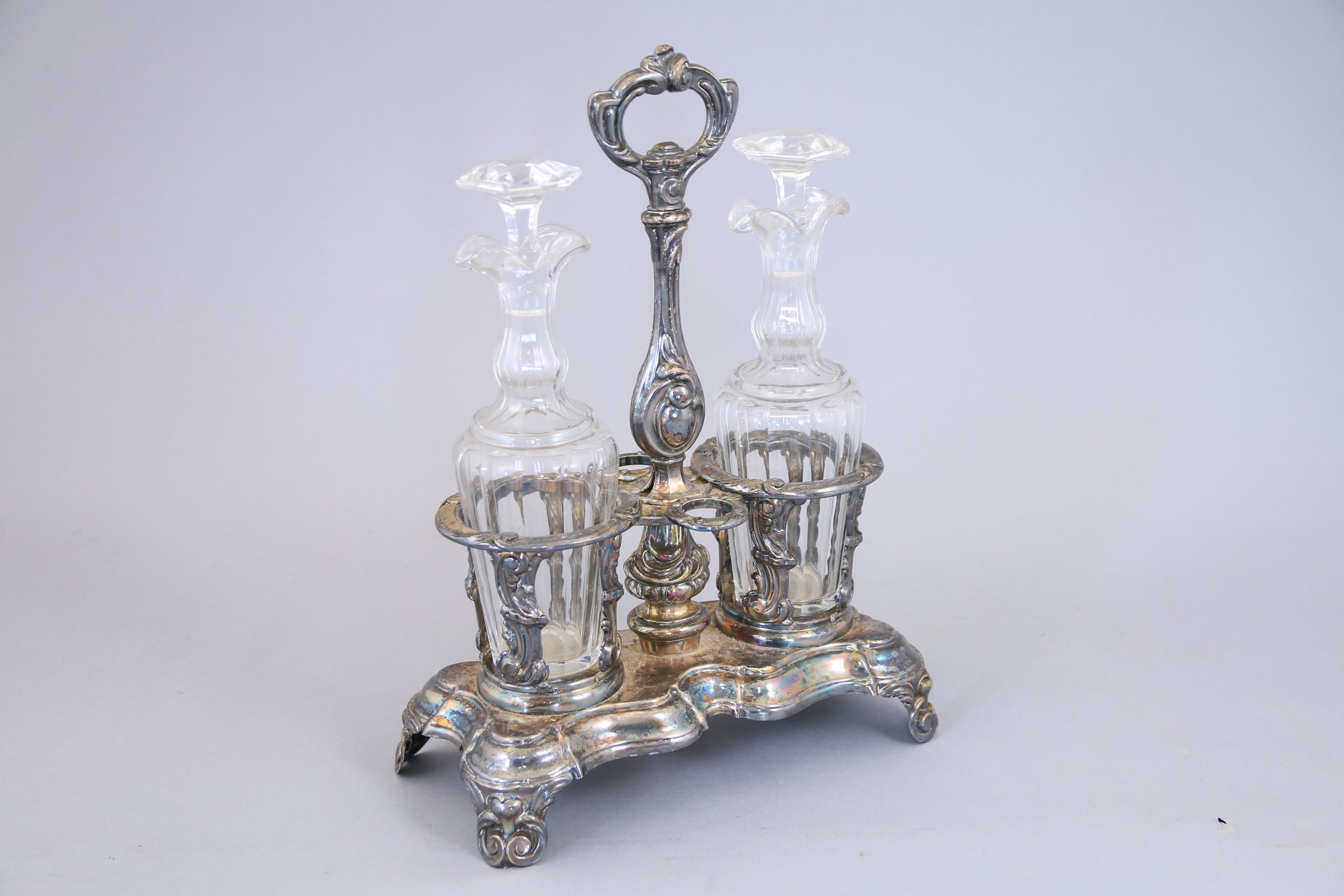 - Grand huilier-vinaigrier en métal argenté à décor rocaille. Les flacons en verre à décor cannelé. Haut. 34 Long. 25 Prof. 12 cm.