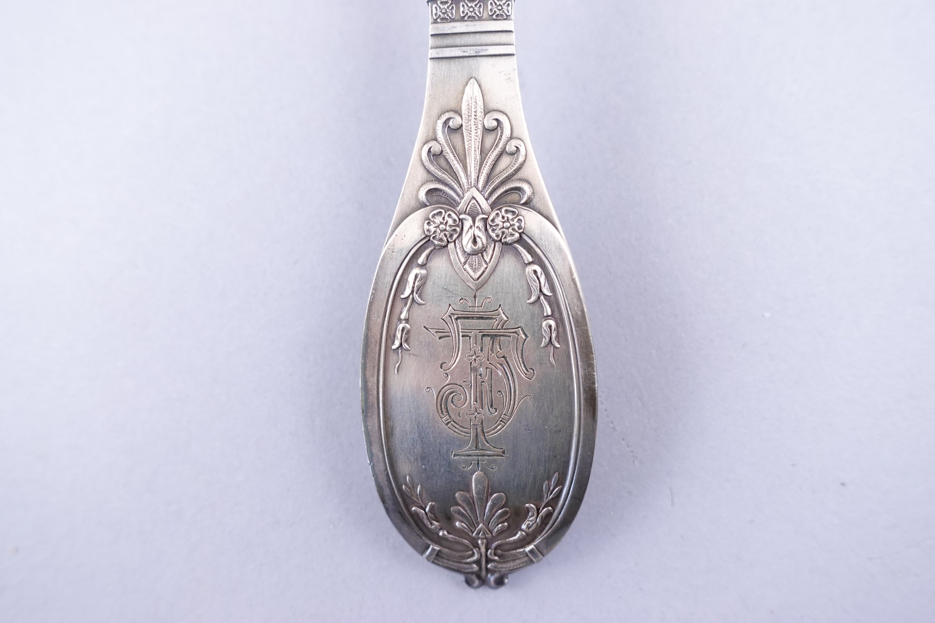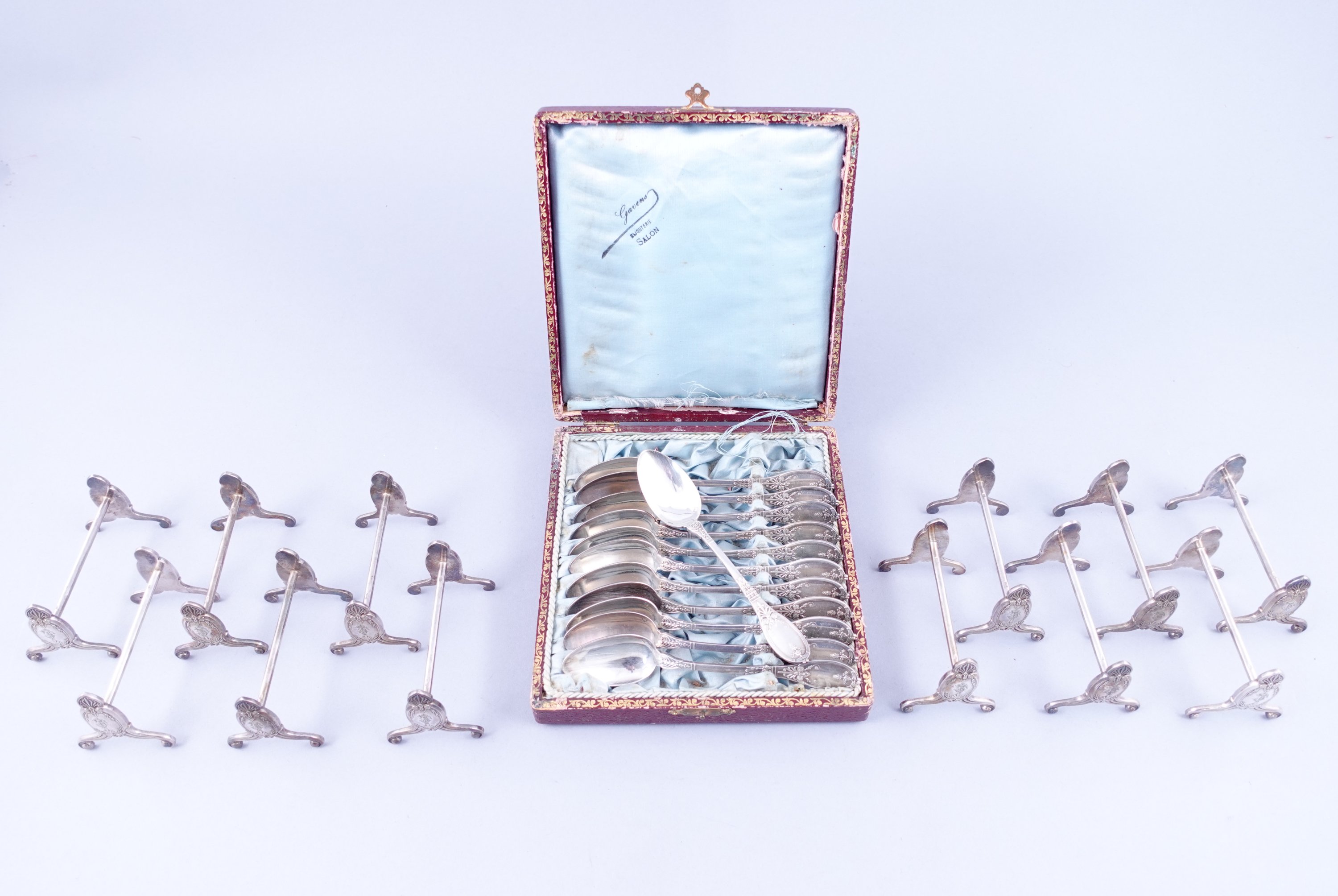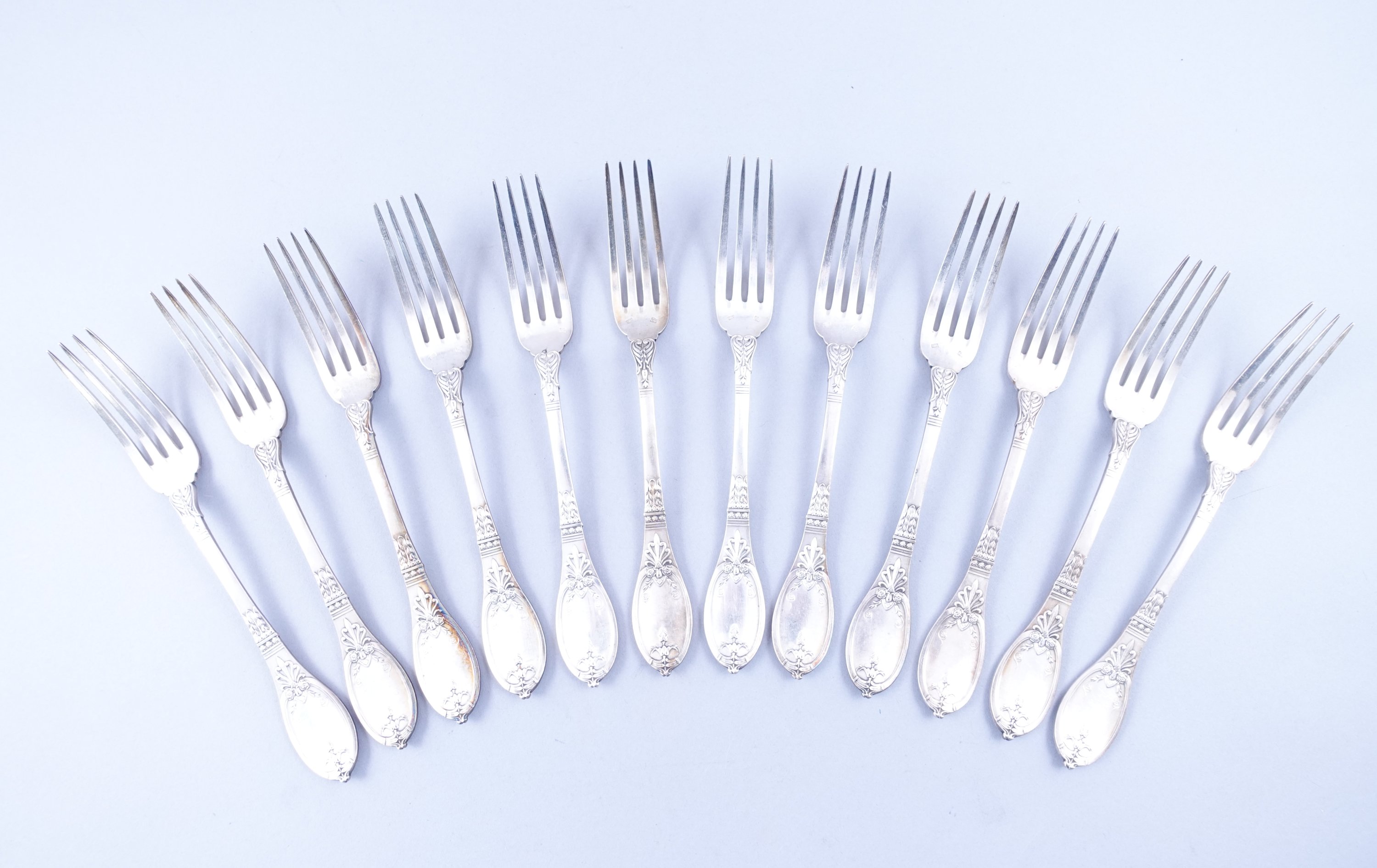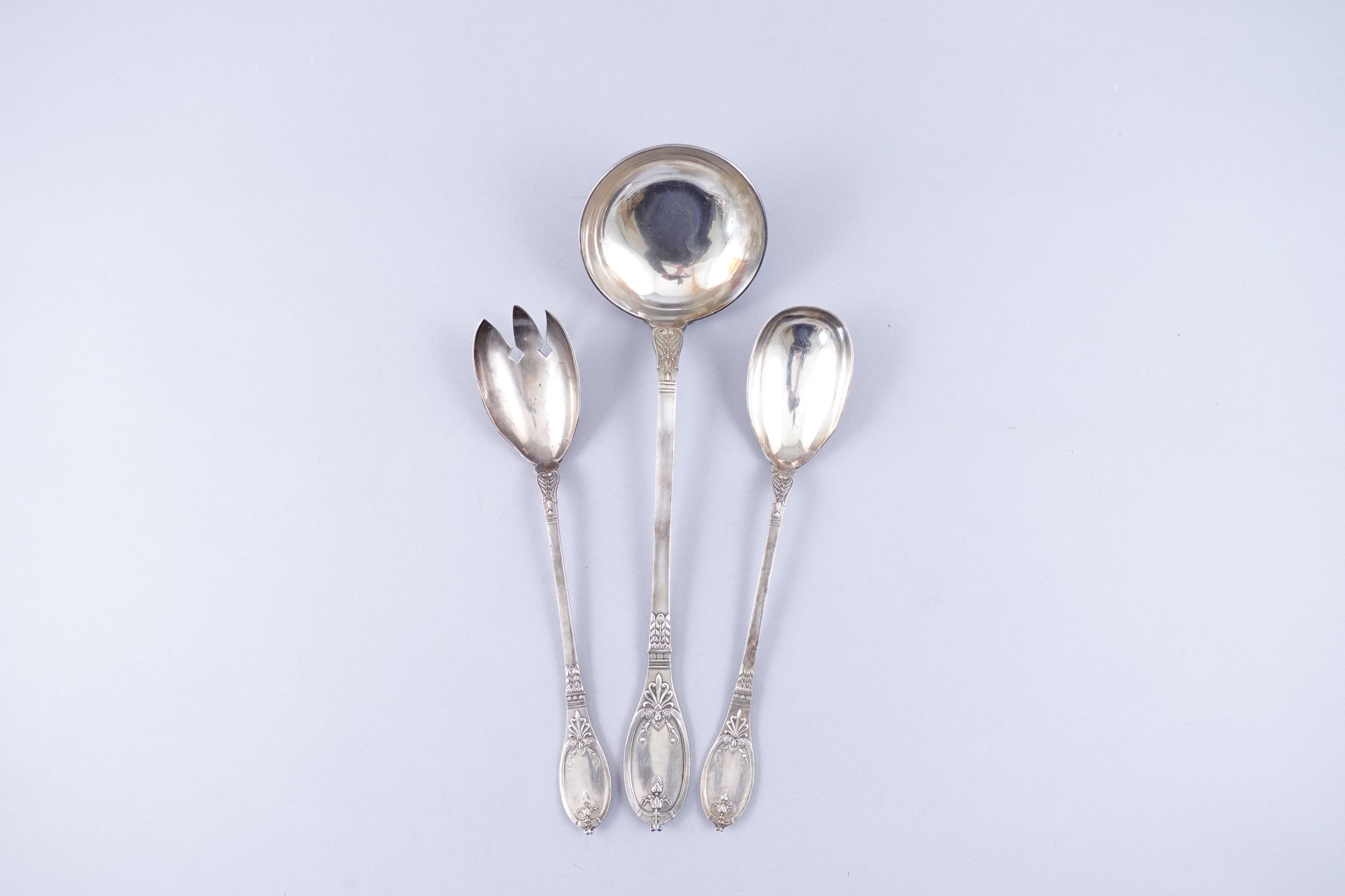 en métal argenté, à décor de palmes et fleurettes. Elle se compose de douze couverts, douze fourchettes de table, douze cuillers à café, une louche, un couvert à salade, douze porte-couteaux.