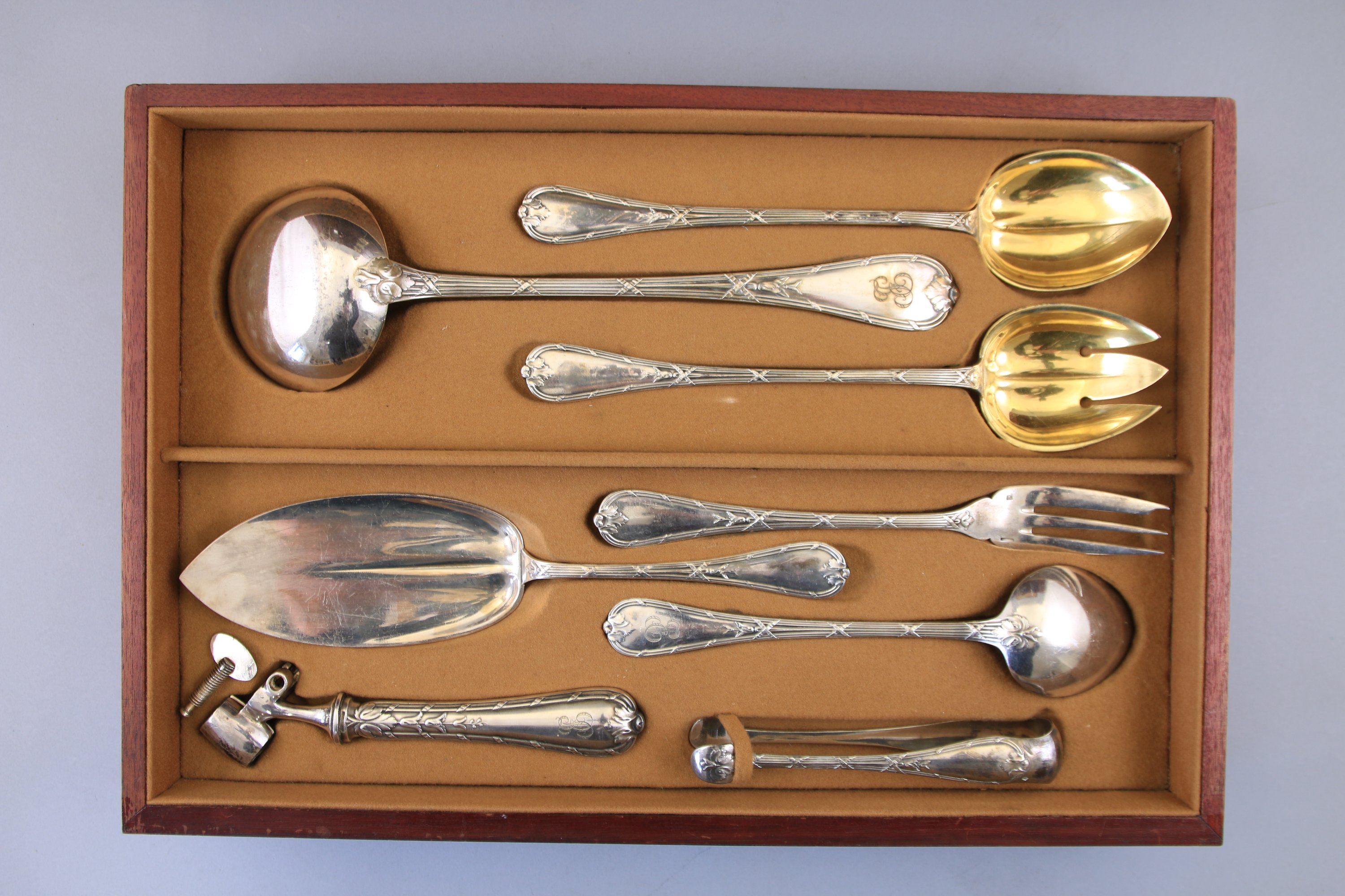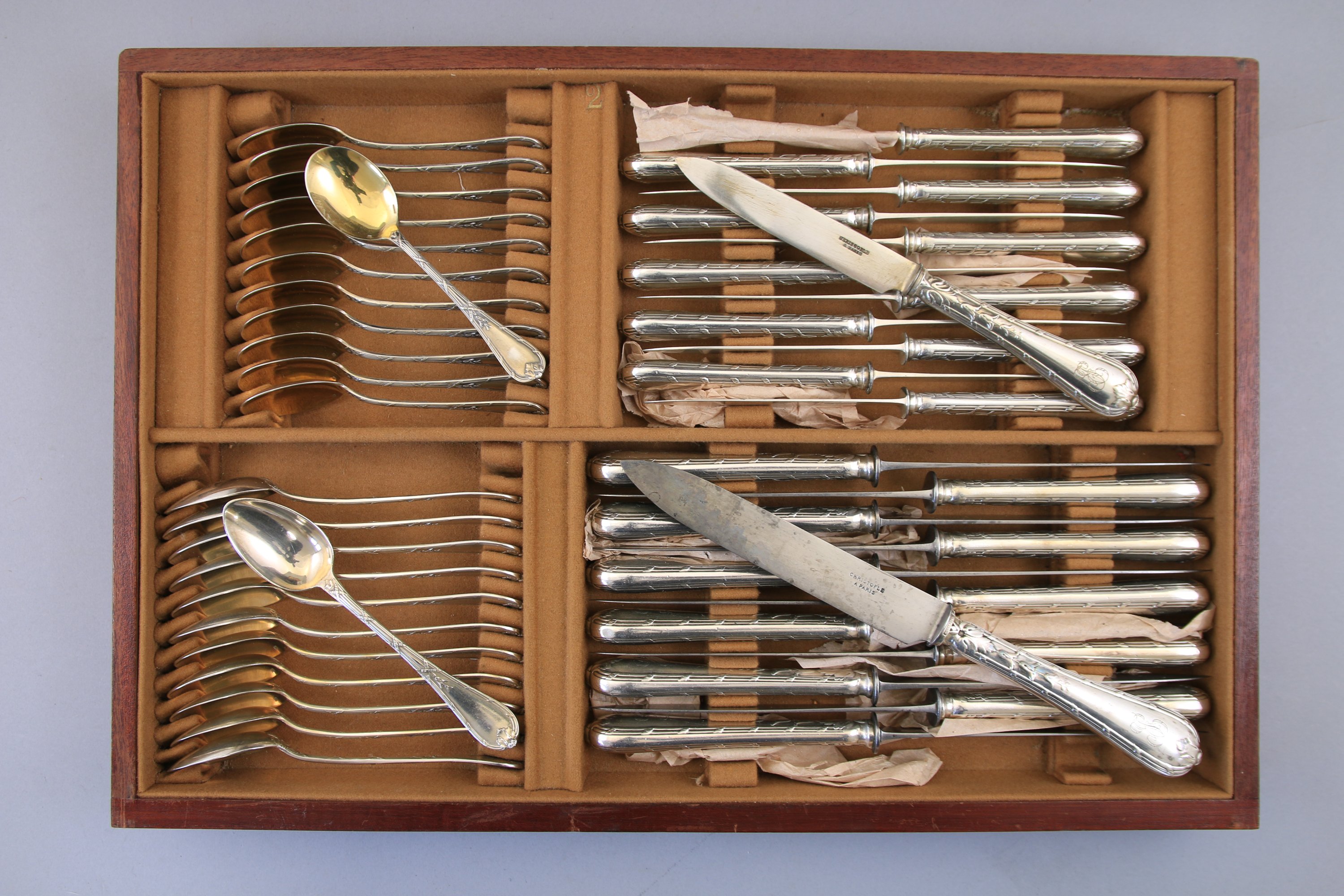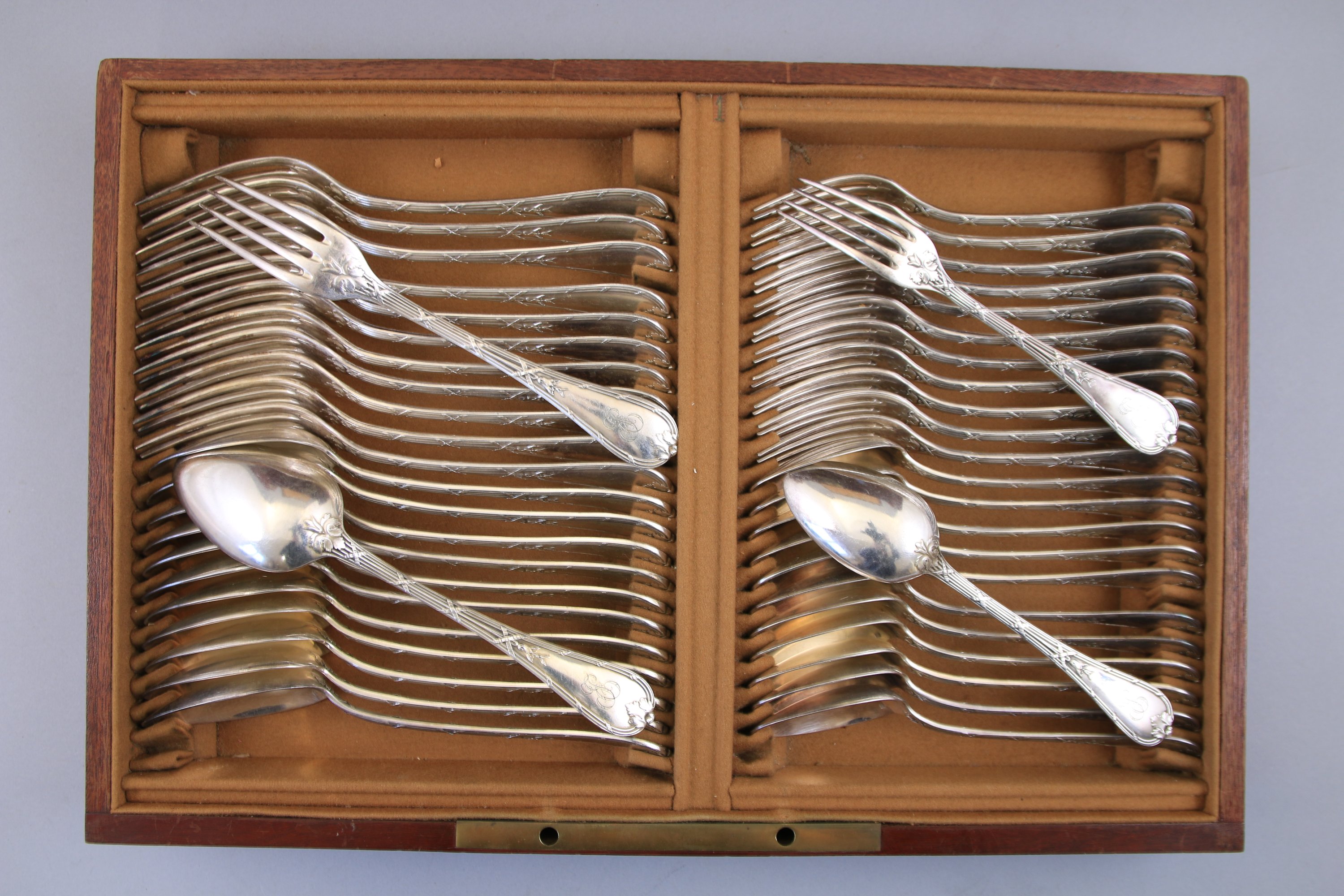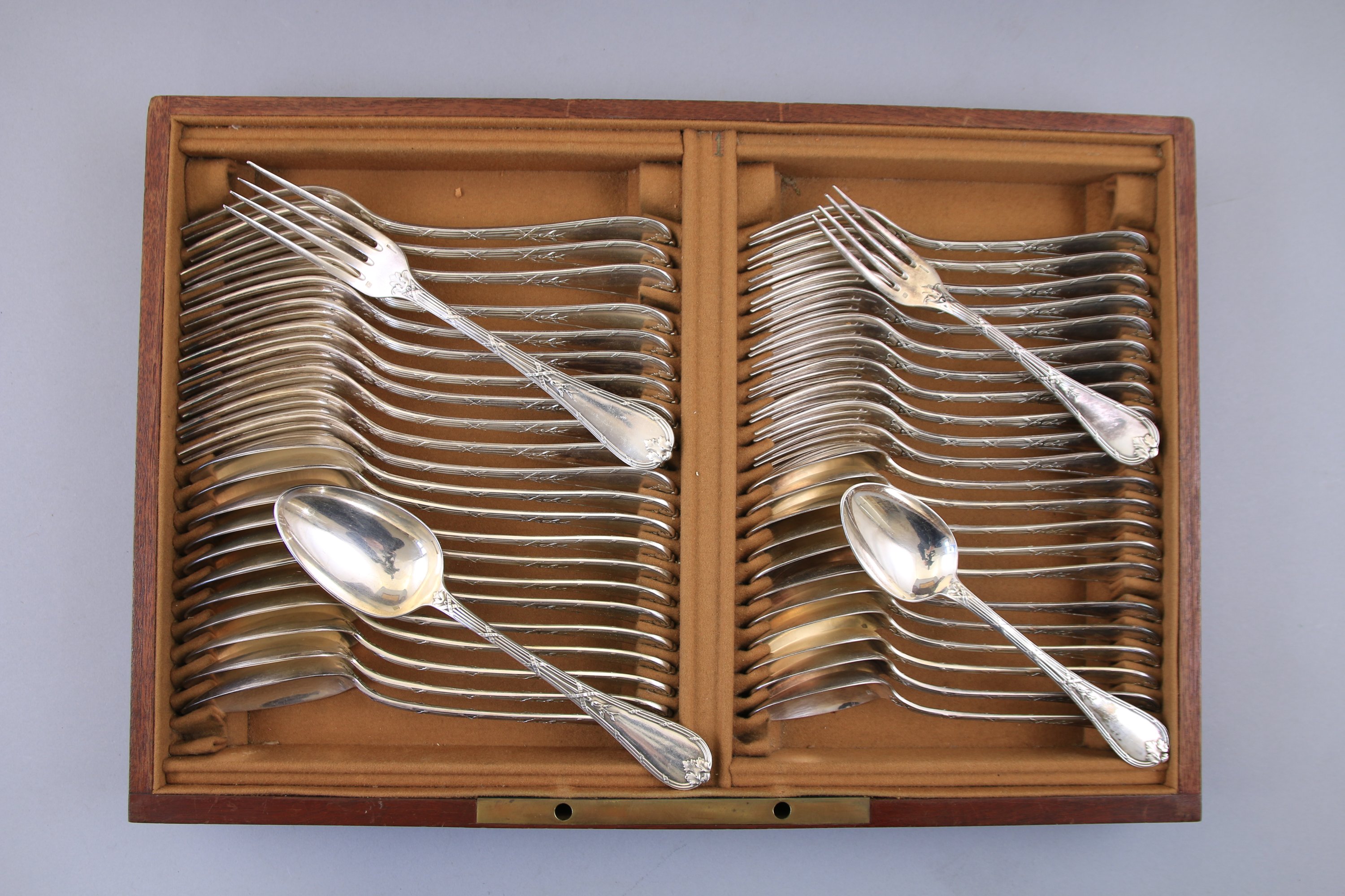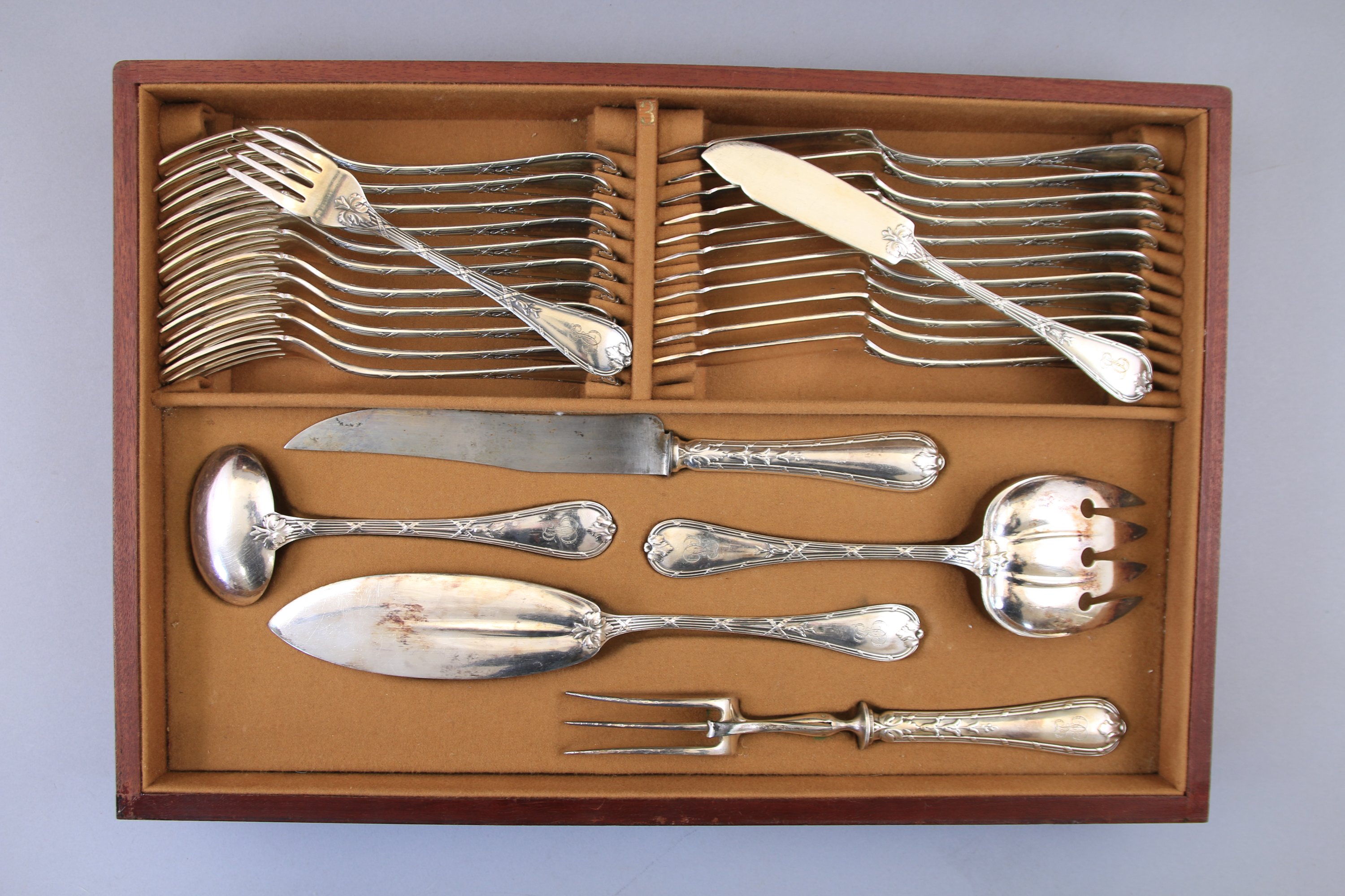 en métal argenté modèle rubans, elle comprend 12 couverts de table, 12 couteaux de table, 12 couverts à entremets, 12 couteaux à entremets, 12 cuillers à café, 12 cuillers à glace, 12 couverts à poisson, un service à découper, une cuiller à sauce, un couvert à servir le poisson, un couvert à salade, une louche, une pelle à tarte, un couvert de service, une pince à sucre et une pince à gigot. (cassée)