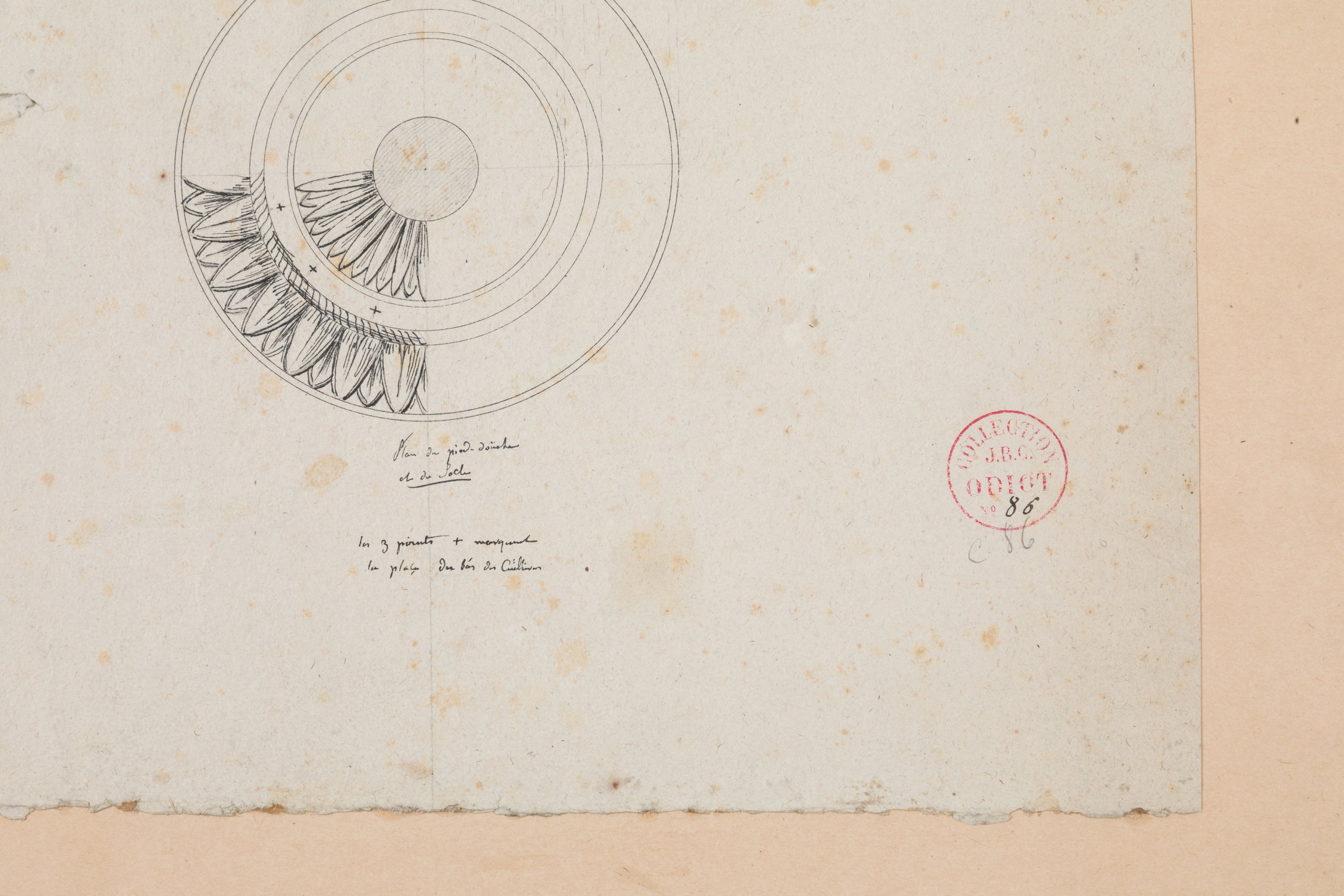 Annoté « Plan et épaisseur de la tige de feuille » et « Plan du pied-douche et du socle / Les 3 [ ?] manquent la place du dos du cuilleron ». Numéroté « C.86 » en bas à droite.