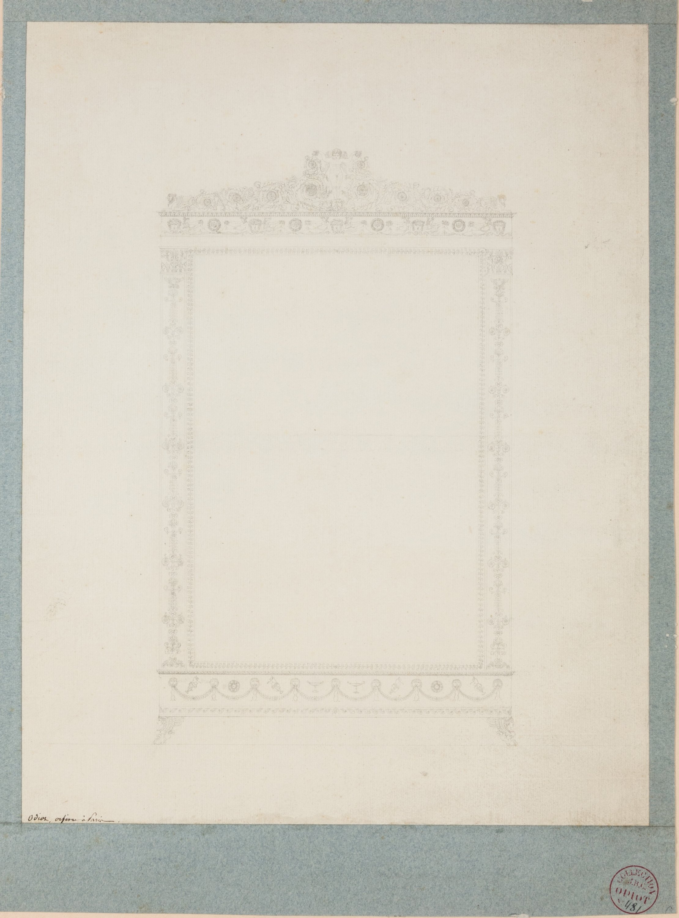 Signé à l’encre « Odiot orfèvre à Paris » en bas à gauche. Cachet en rouge estampé de la collection Jean-Baptiste-Claude Odiot avec le numéro à l’encre « 481 » sur passe-partout de papier bleu.