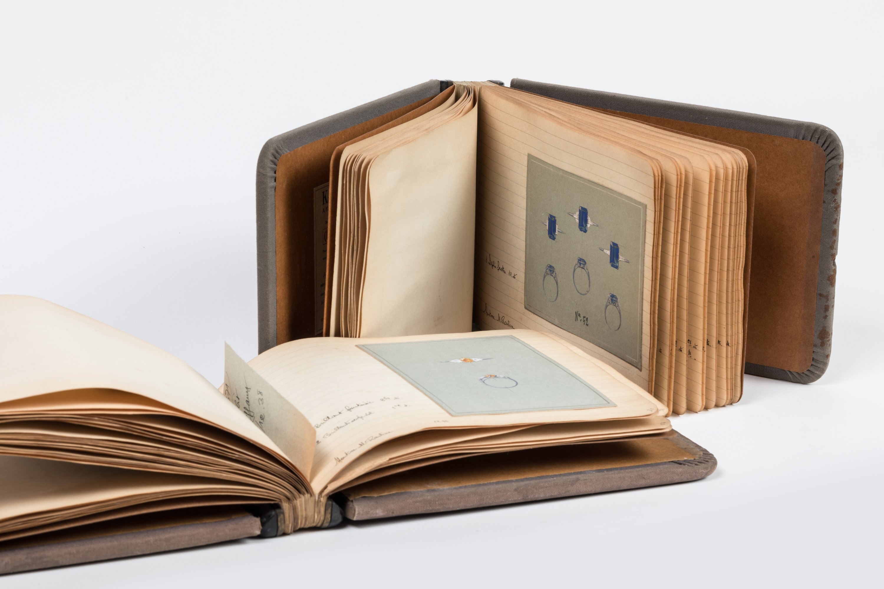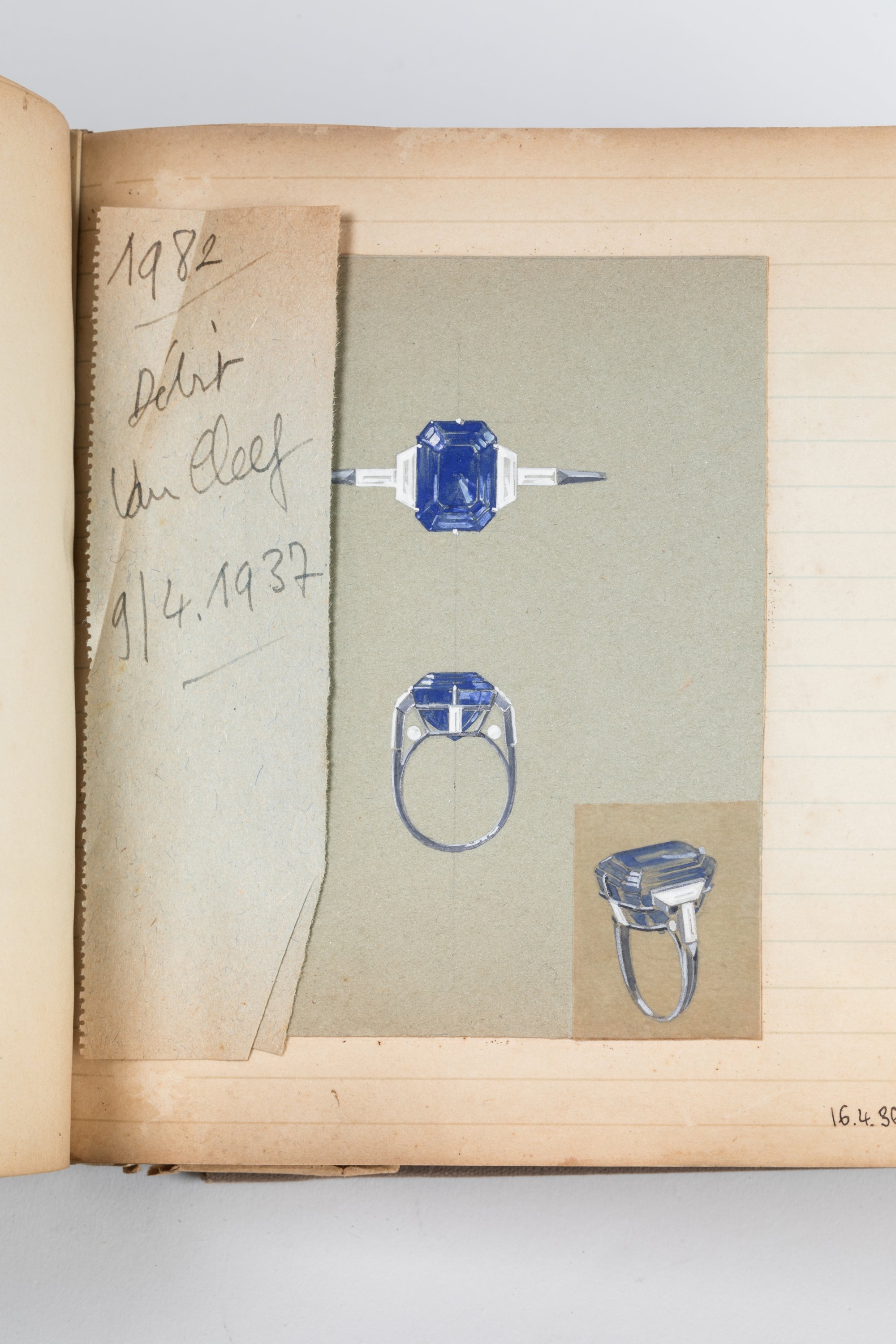 crayon, gouache et rehauts de blanc, avec les caractéristiques, poids et tailles des pierres (diamants, rubis, émeraude, saphirs) et des perles, les noms des bijoutiers auteurs des montures (Rauline, Rubel Frères) et les maisons en débit (Cartier, Boucheron, Van Cleef, Fontana, Touchard, Wurmser, Bulgari, Chaumet, Tiffany, Cokaream, Worms).