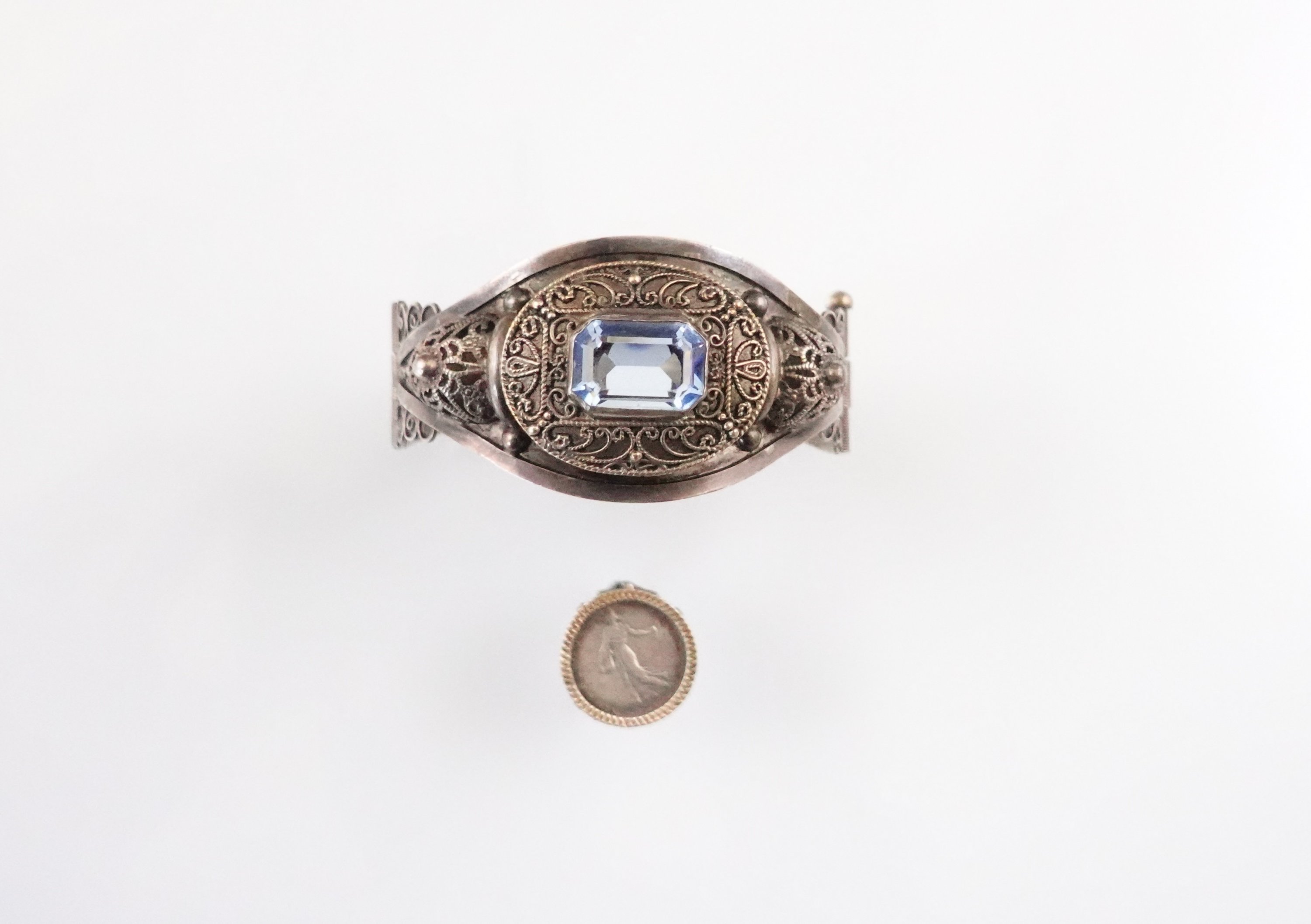 - Un bracelet serti d'un verre bleu dans un entourage filigrané d'enroulements.