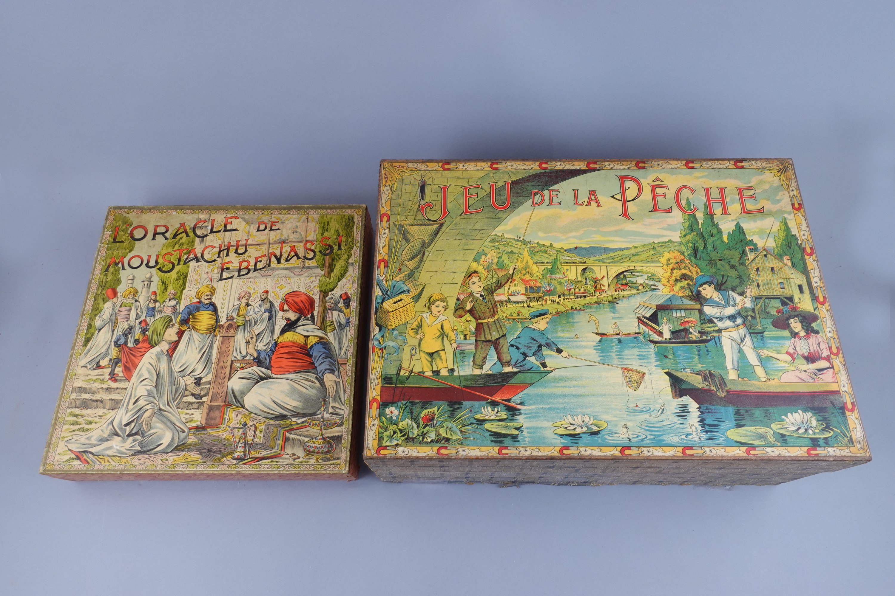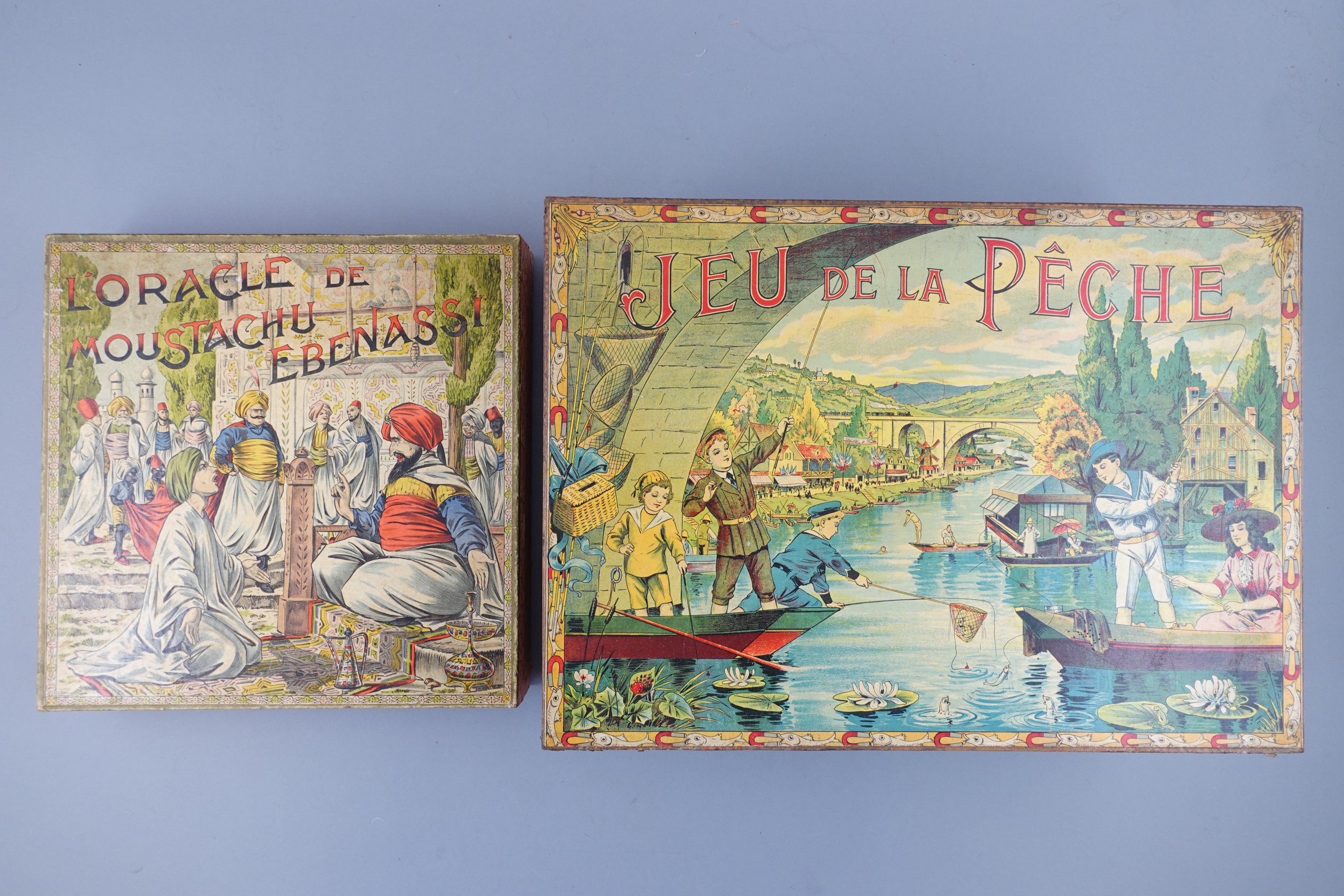 - Jeu de la Pêche, en chromolithographie, dans sa boîte en carton, contenant un plateau de jeu, des cannes à pêche, éditeur Saussine Paris, vers 1900. Haut. 18 Long. 45 cm.