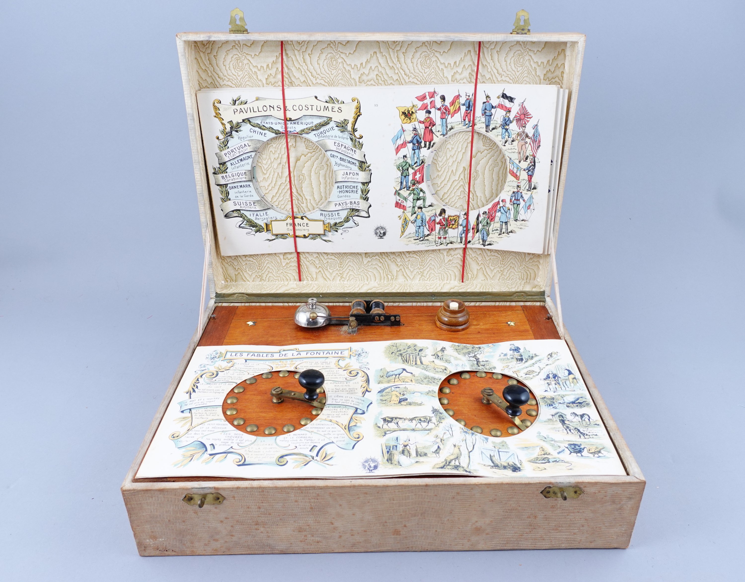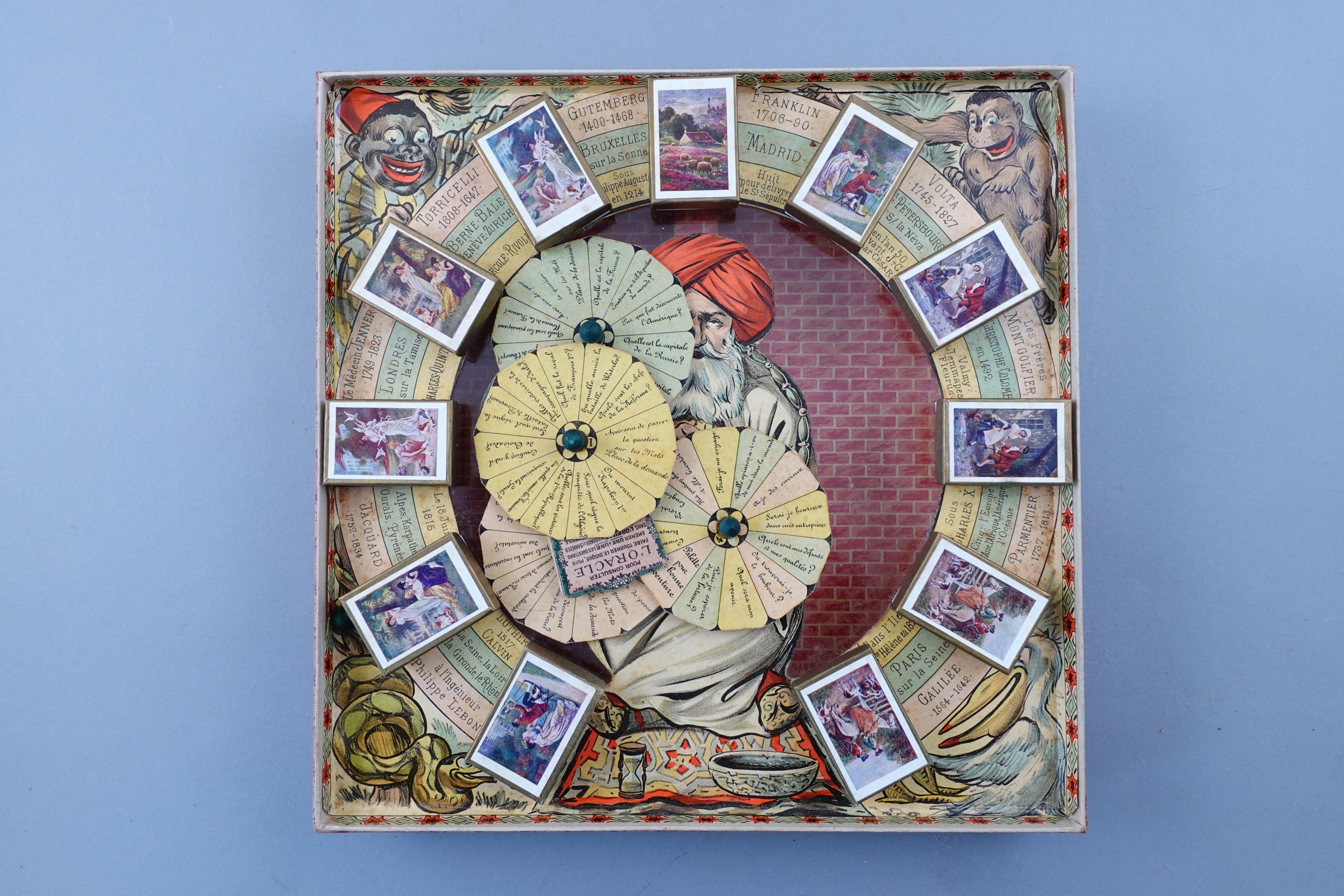 - L'oracle de Moustachu Ebenassi, en chromolithographie, dans sa boîte en carton, contenant un plateau et des questions, éditeur Saussine Paris, vers 1900. Long. 33,5 Larg. 35,5 cm. Bon état (quelques cartes écornées) ;