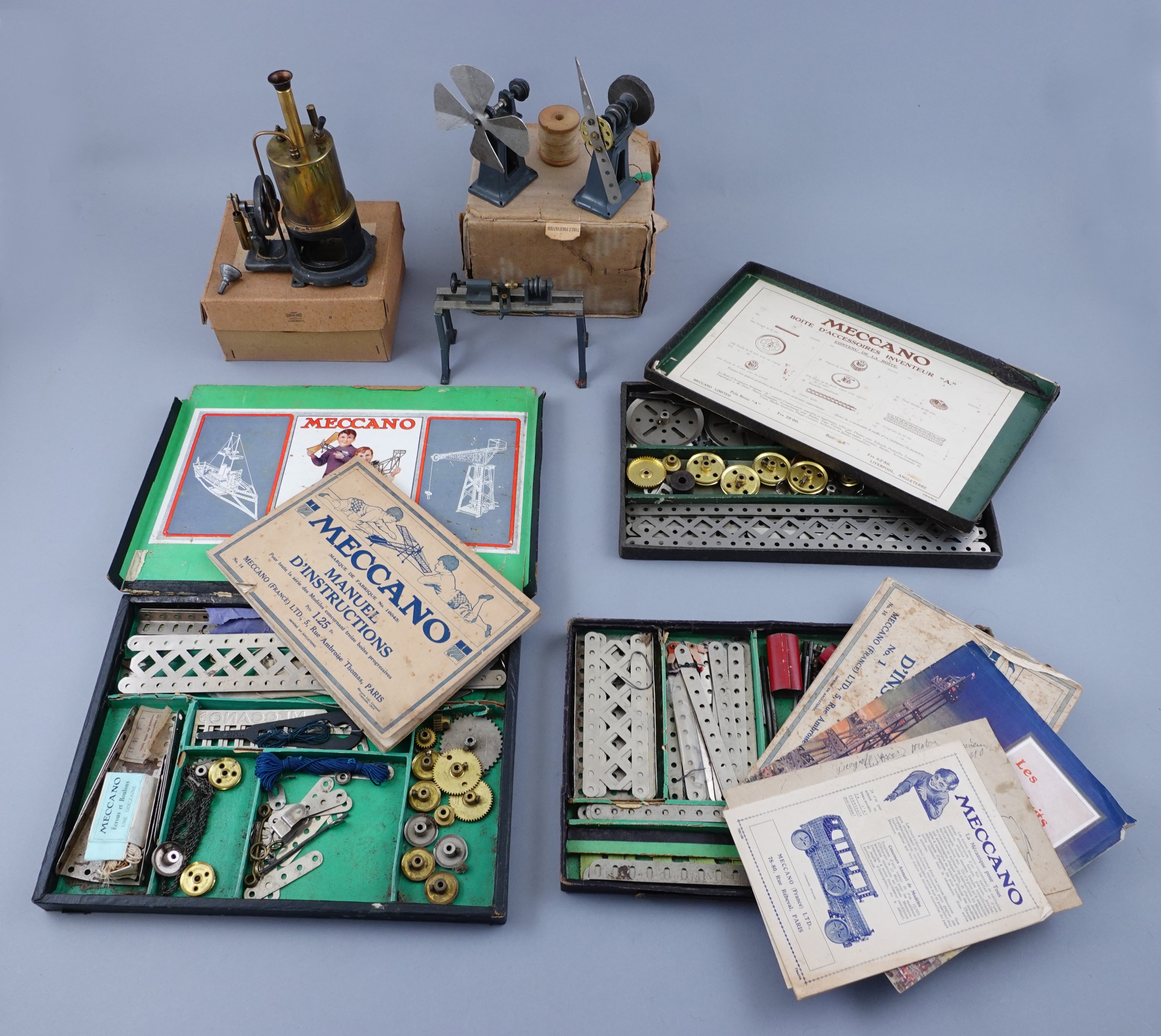 - Meccano. Trois boîtes de pièces à monter dont une boîte "inventeur", une n° 2 et une non numérotée, assorties d'un ancien catalogue de vente et d'un manuel d'instructions. Long. 34,5 et 33,5 Haut. 26 et 24 cm pour les boîtes.
