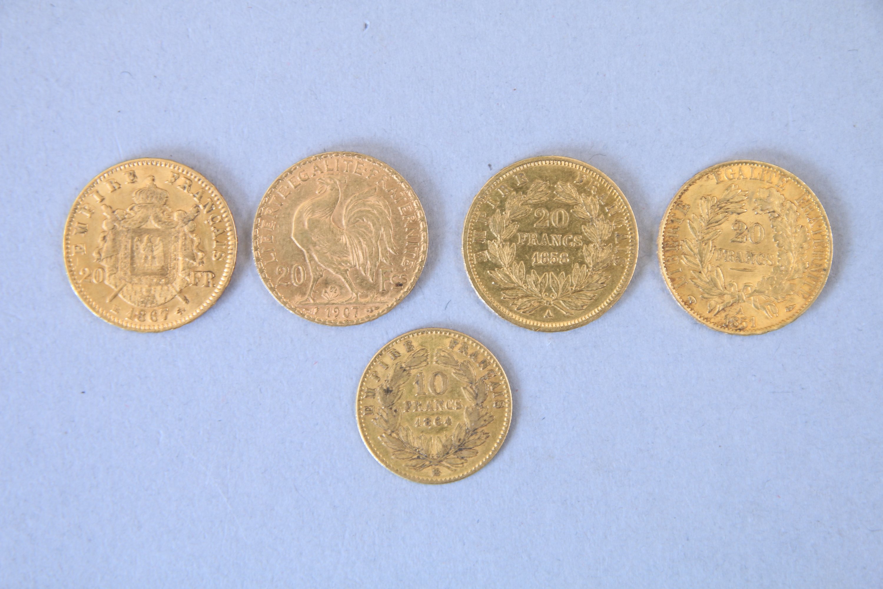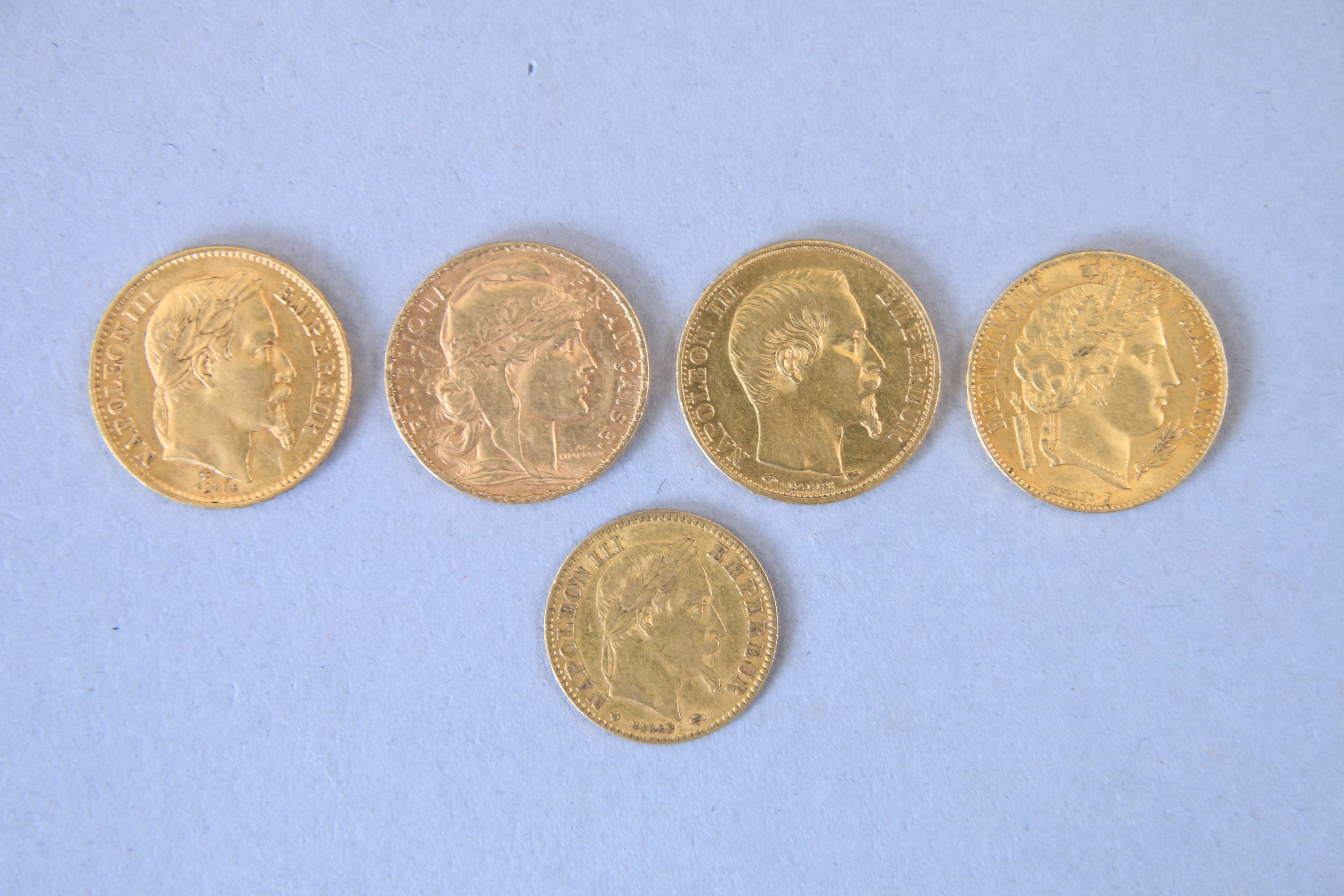- 4 x 20 francs or : 1 x Cérès, 1851 ; 1 x Napoléon III tête nue, 1858 ; 1 x Napoléon III tête laurée, 1867 ; 1 x Marianne, 1907 ;