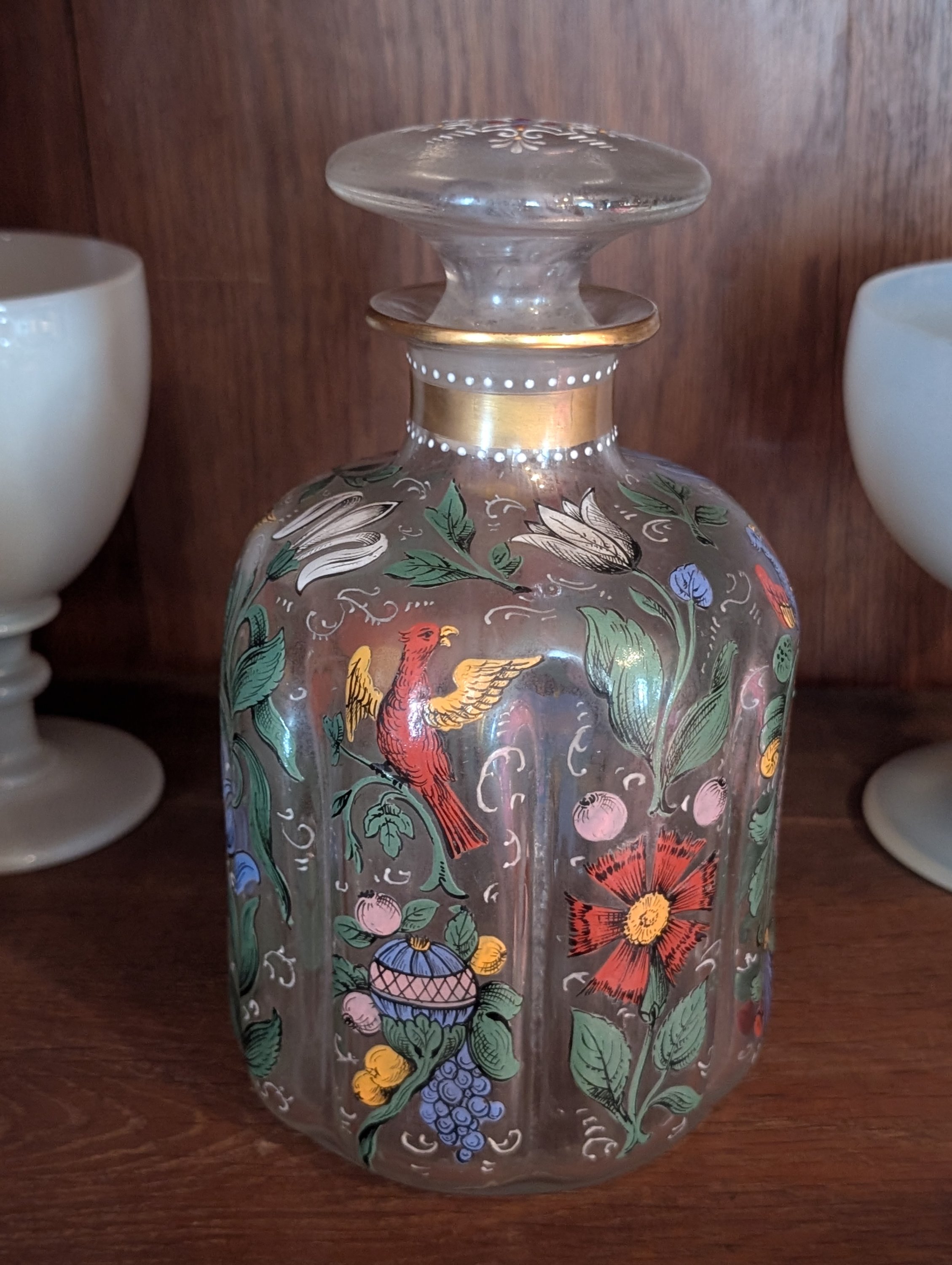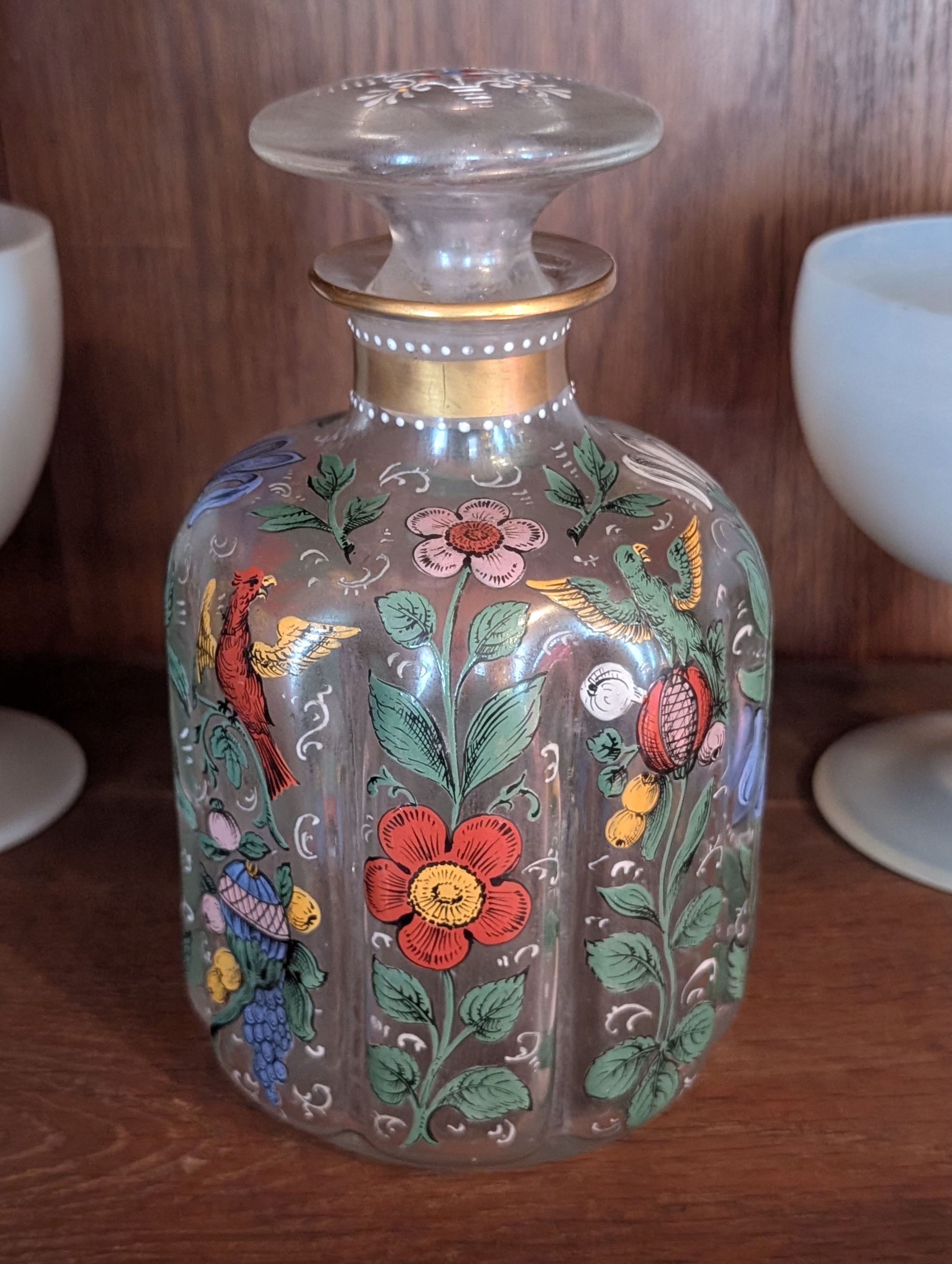 en verre à panse godronnée à décor peint émaillé de motifs végétaux et oiseaux.