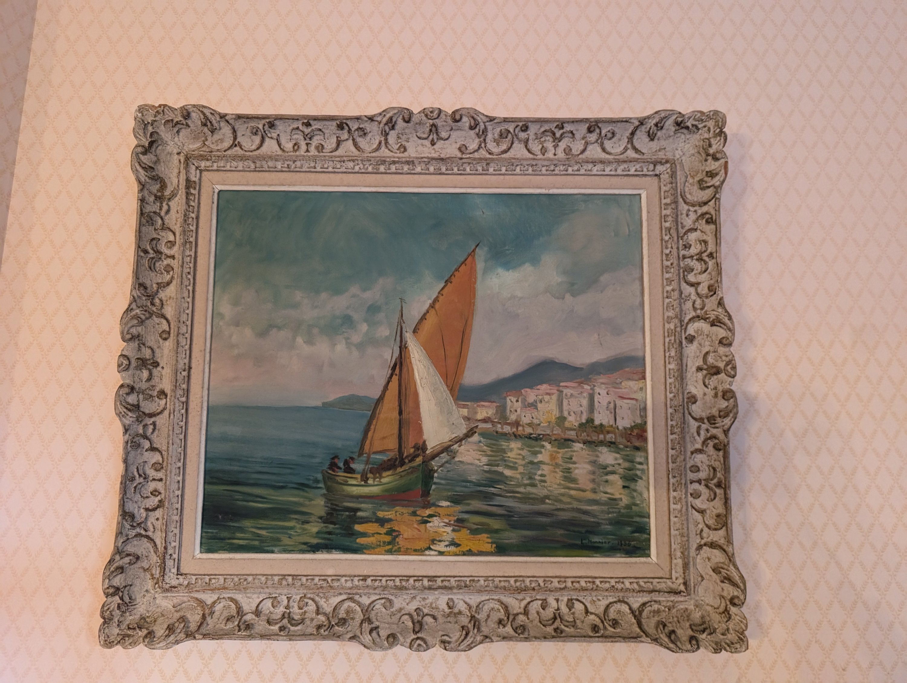 comprenant notamment un lit, un miroir, deux appliques, une chaise, un tapis, une commode, toile par Monnier, divers bibelots dont une pendule en marbre Art déco.