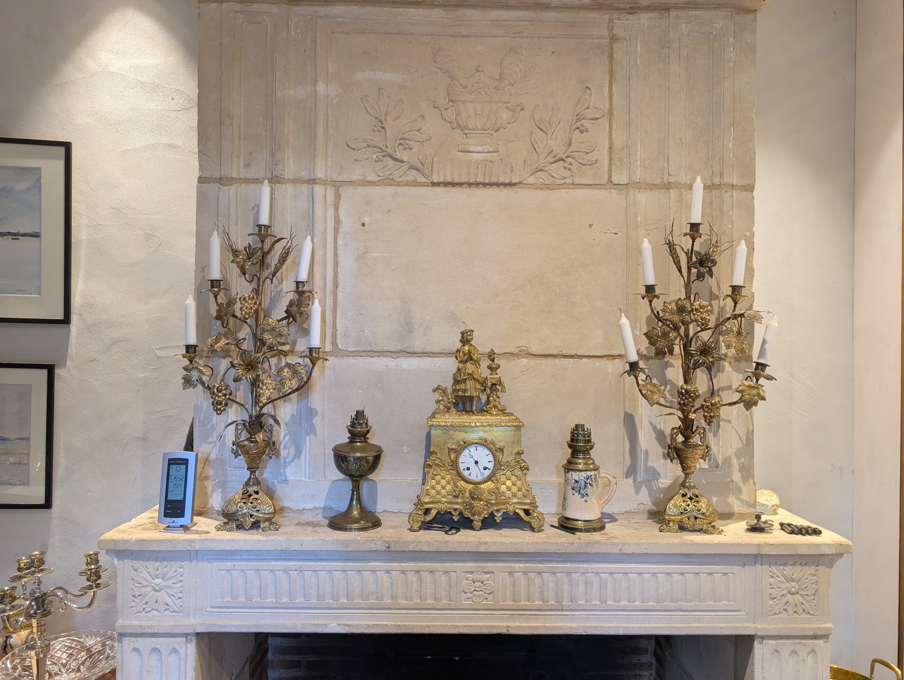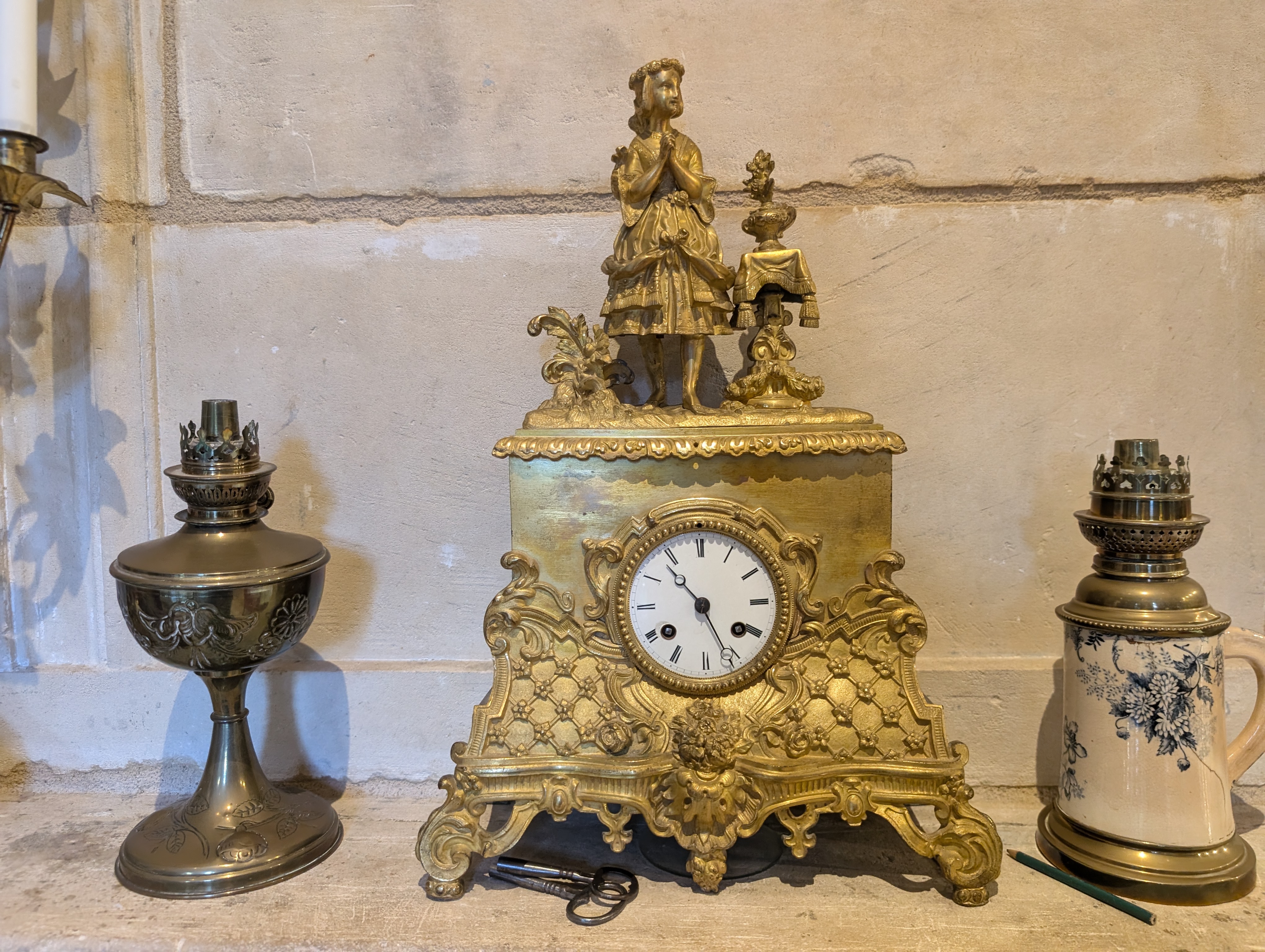 à cadran émaillé blanc indiquant les heures en chiffres romains, les minutes par un chemin de fer. Il est surmonté d'une jeune femme aux mains jointes auprès d'une table. Il surmonte un décor de croisillons. L'ensemble repose sur des pieds en enroulement.