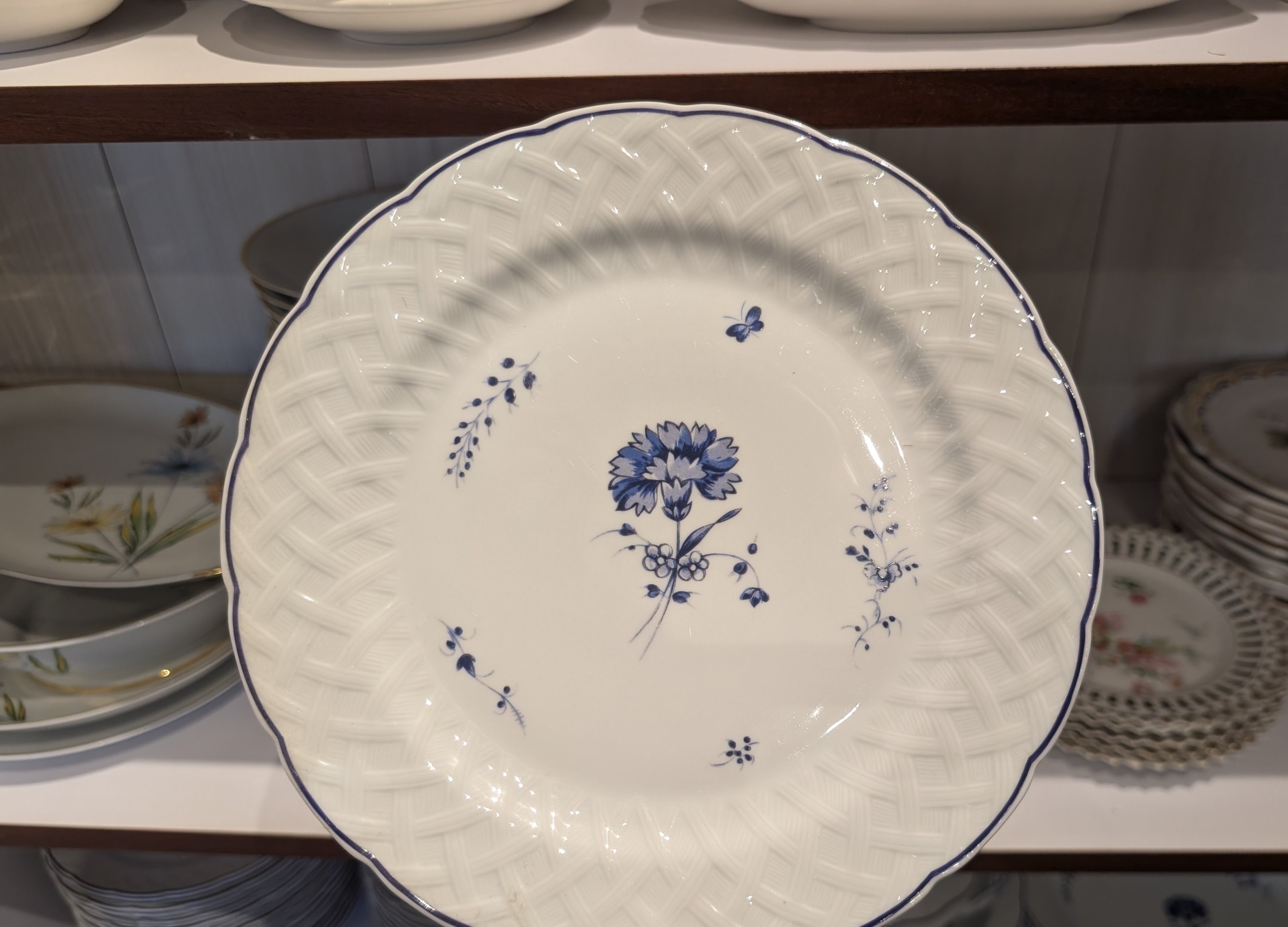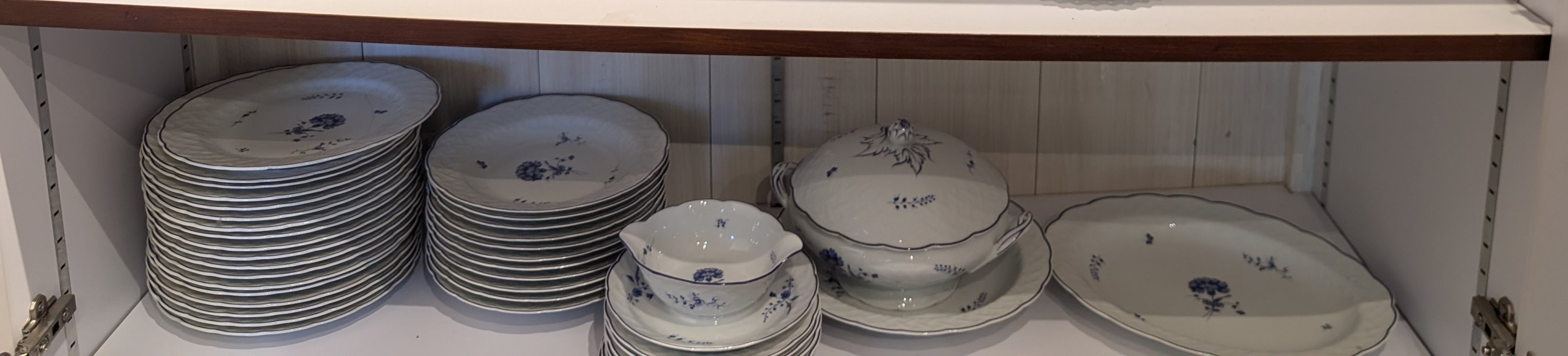 en porcelaine comprenant assiettes plates, assiettes creuses, saucière, soupière, plat creux et plat oblong.